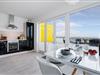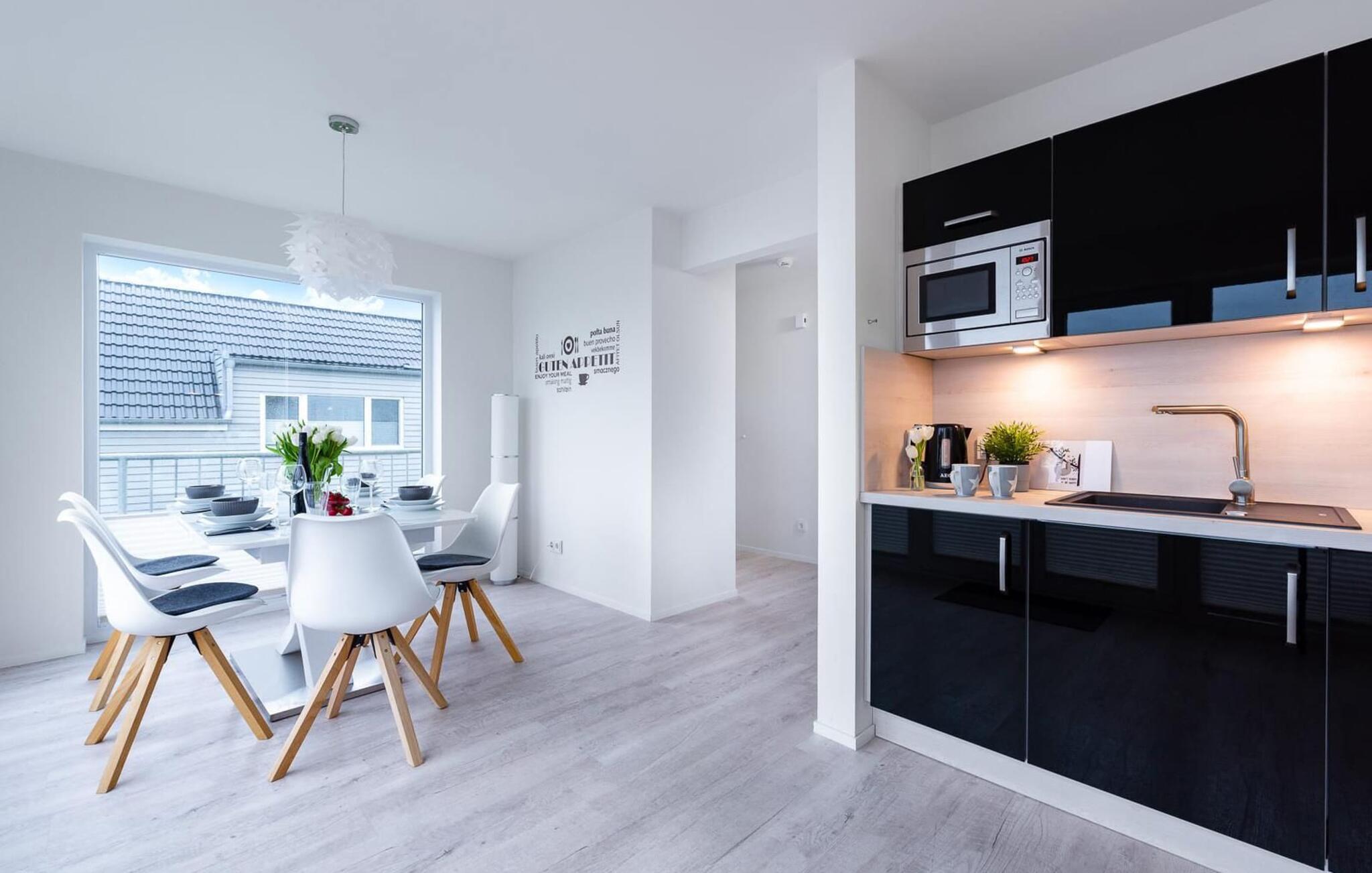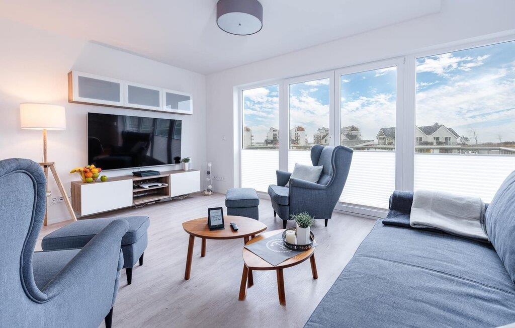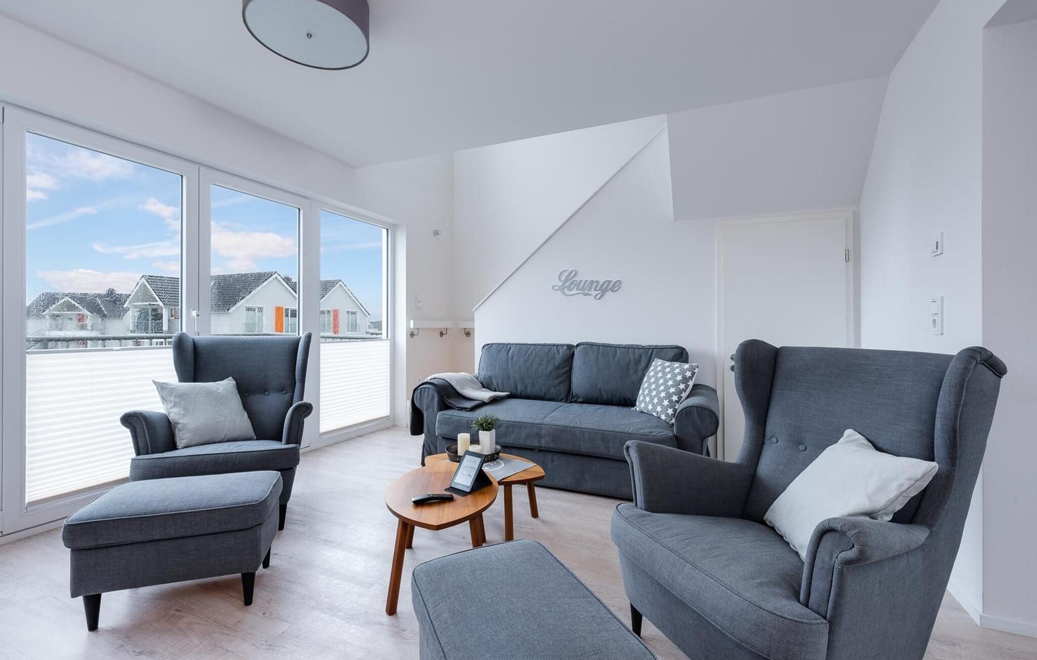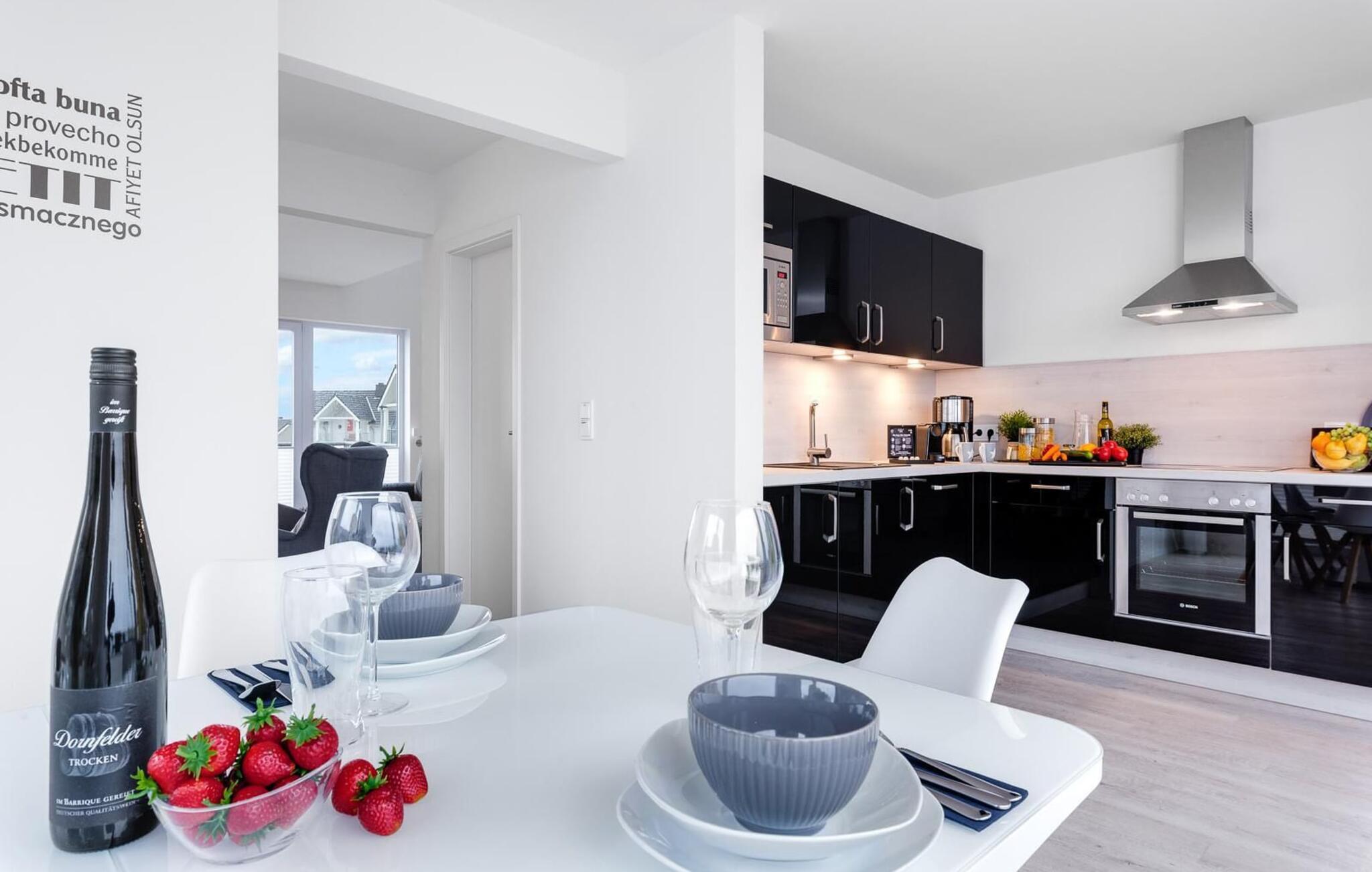 Ferielejlighedens opholds-/spisestue er oversvømmet med lys og har panoramavindue fra gulv til loft mod de tilstødende terrasser på begge sider. En fantastisk udsigt åbner op på terrassen ved siden af spisepladsen med udsigt over sejler- og sportsbådhavnen i OstseeResort Olpenitz. Havnebiograf og romantiske solnedgange er garanteret, og I kan også slappe af her med en god bog.
