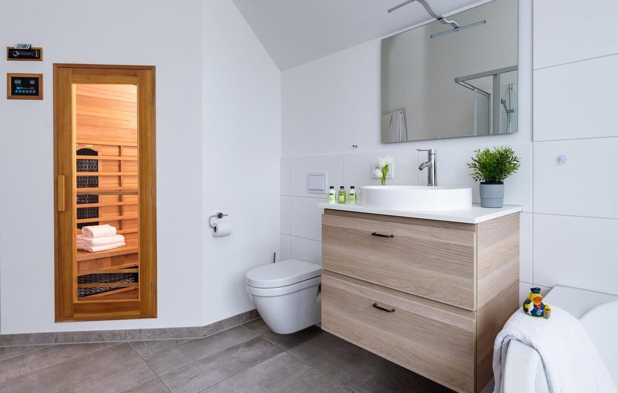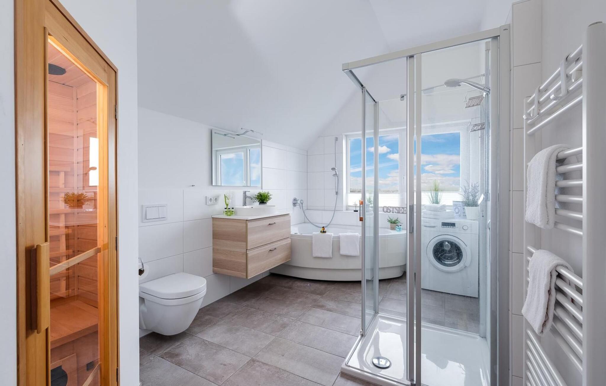 Det private wellnessområde indbyder til afslapning: en infrarød varmekabine med hi-fi lydsystem og LED farvelysterapi samt et stort afslapningsboblebad med udsigt til vandet står til rådighed efter en gåtur på stranden.