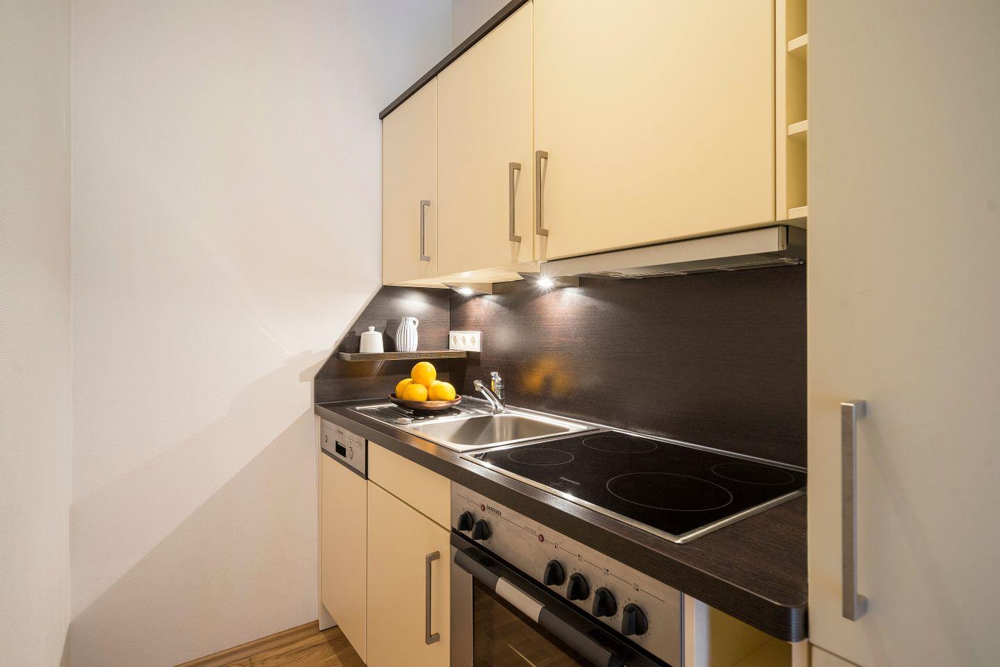 Im Erdgeschoss befinden sich der Wohnbereich mit einer gemütlichen Sitz- und Essecke sowie eine separate Küchenzeile, ein Schlafzimmer mit Doppelbett (180x200 cm), ein Bad mit Dusche/WC und eine Terrasse mit Nord-West-Ausrichtung. Im Preis inklusive ist die Nutzung des Wellnessbereiches im Untergeschoss. Hier befinden sich ein Schwimmbad, eine Saunalandschaft, ein Ruheraum sowie Kneippfußbäder und Massageduschen.