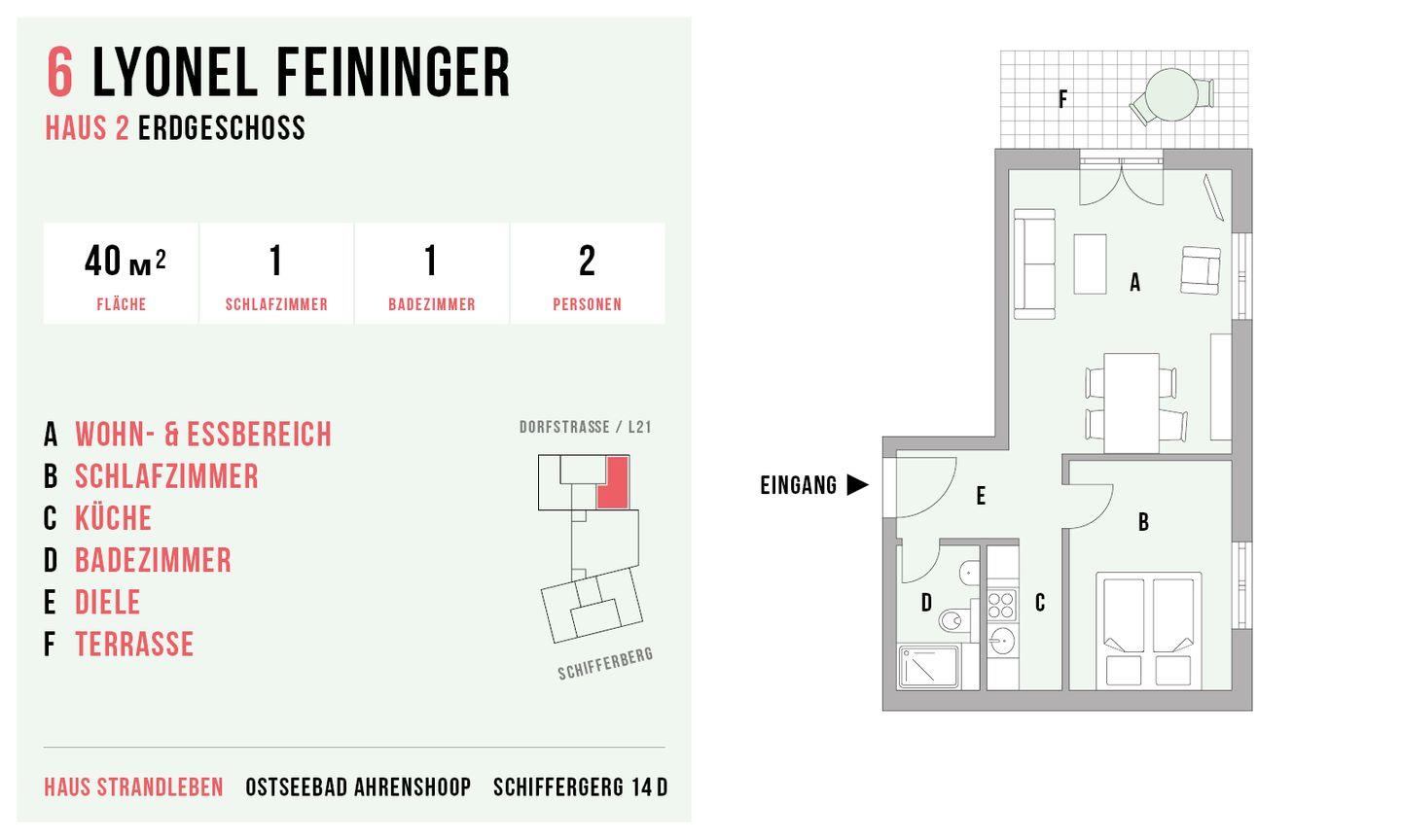 Die Hausanlage mit 13 Ferienwohnungen liegt nur 150 Meter vom weißen Ostseestrand entfernt und befindet sich direkt an der Bäderstraße L21. Neben der strandnahen Lage ist auch der Ortskern mit Bäckereien und einer Vielzahl von Restaurants, Cafés und Kunstgalerien nur ca. einen Kilometer entfernt. Der angrenzende Deich eignet sich perfekt für Wanderungen oder Radtouren in den Nationalpark, zum Weststrand und entlang der weiten Boddenlandschaft.