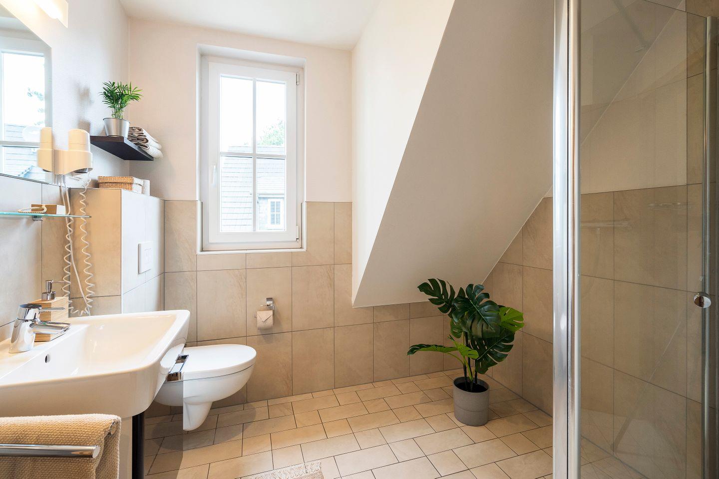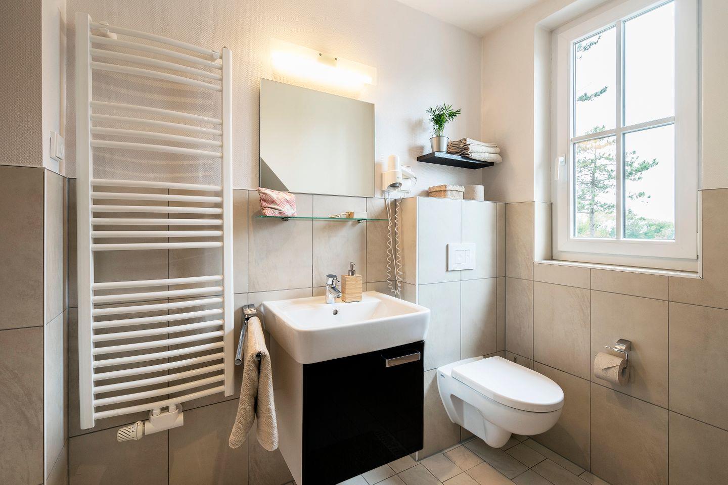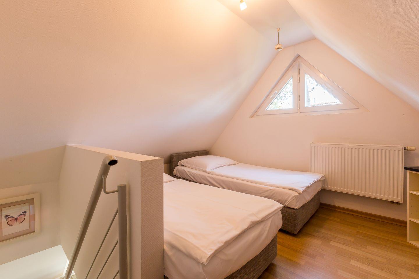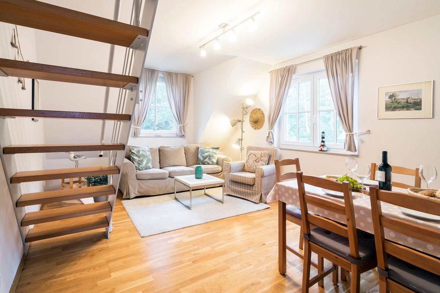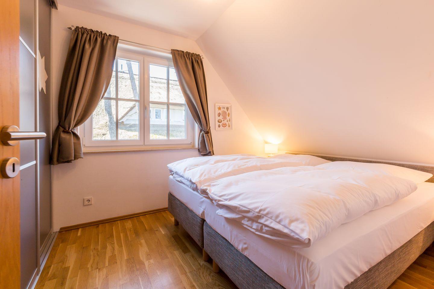 Im Obergeschoss befinden sich der Wohnbereich mit einer gemütlichen Sitz- und Essecke, eine separate Küchenzeile, ein Schlafzimmer mit Doppelbett (180x200 cm) sowie ein Bad mit Dusche/WC. Das Dachgeschoss verfügt über ein offenes zweites Schlafzimmer mit zwei Einzelbetten. Hier haben Sie aus der Küche und dem Schlafzimmer einen kleinen Ausblick auf die Ostsee. Im Preis inklusive ist die Nutzung des Wellnessbereiches im Untergeschoss. Hier befinden sich ein Schwimmbad, eine Saunalandschaft, ein Ruheraum sowie Kneippfußbäder und Massageduschen.