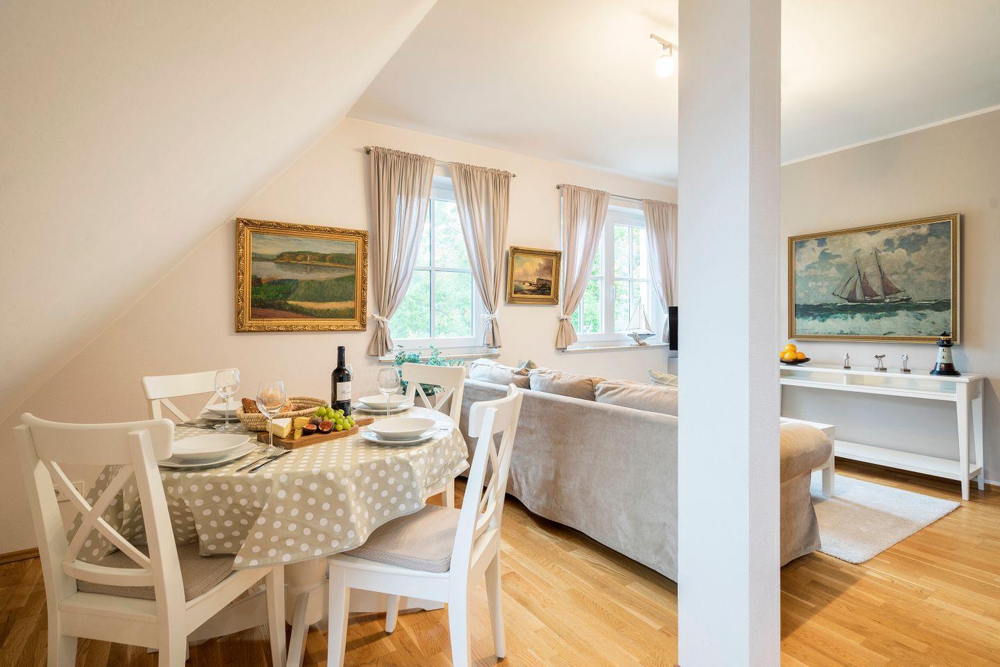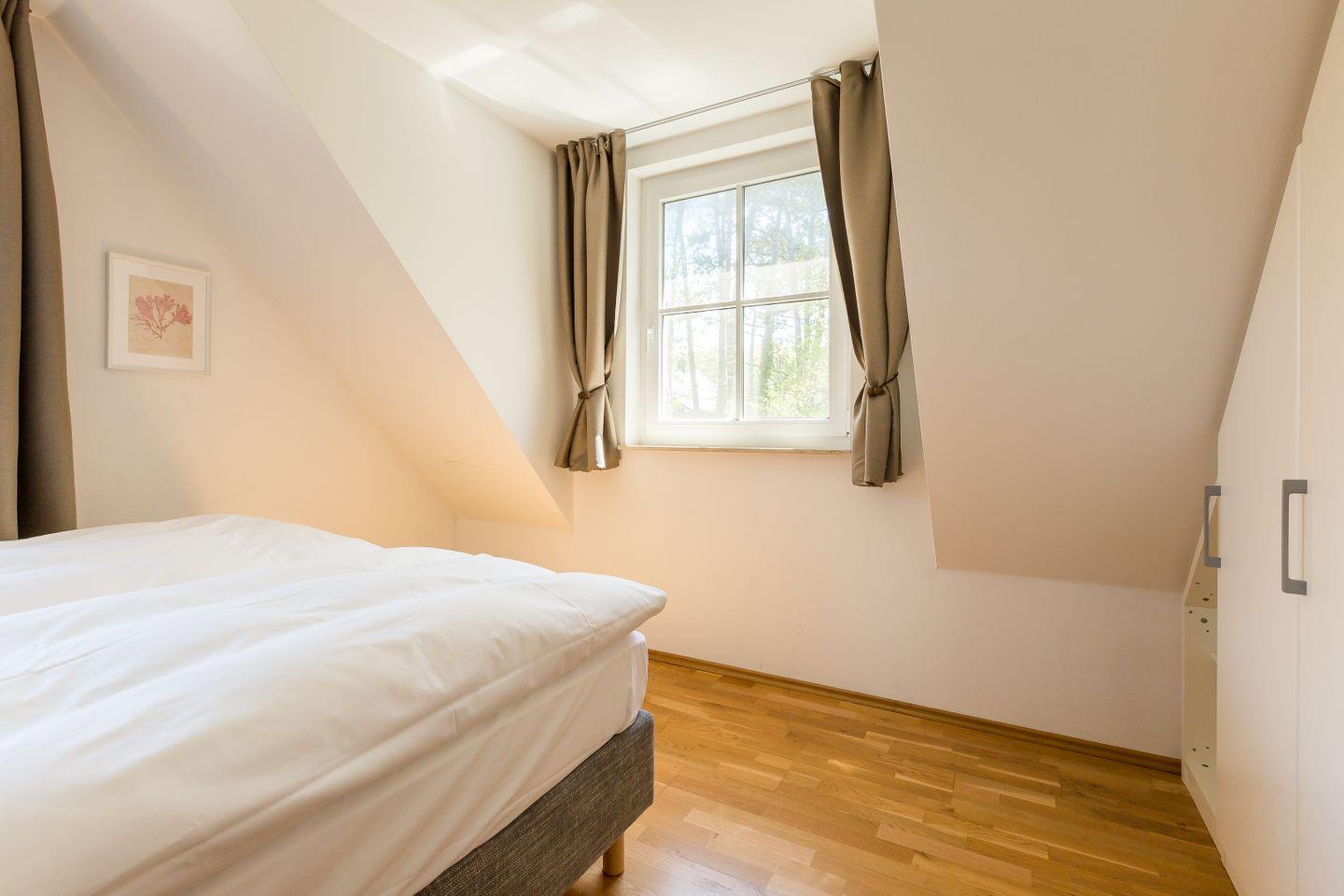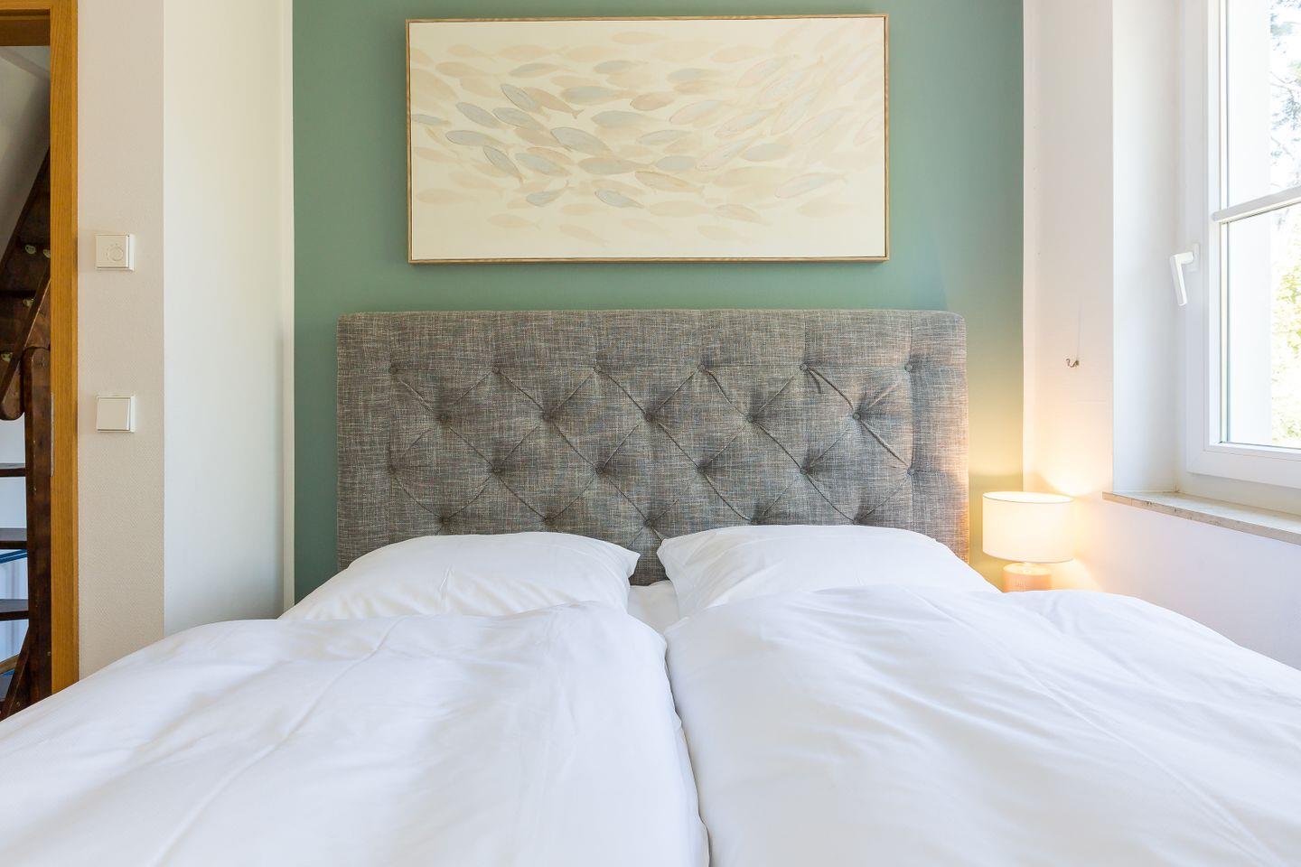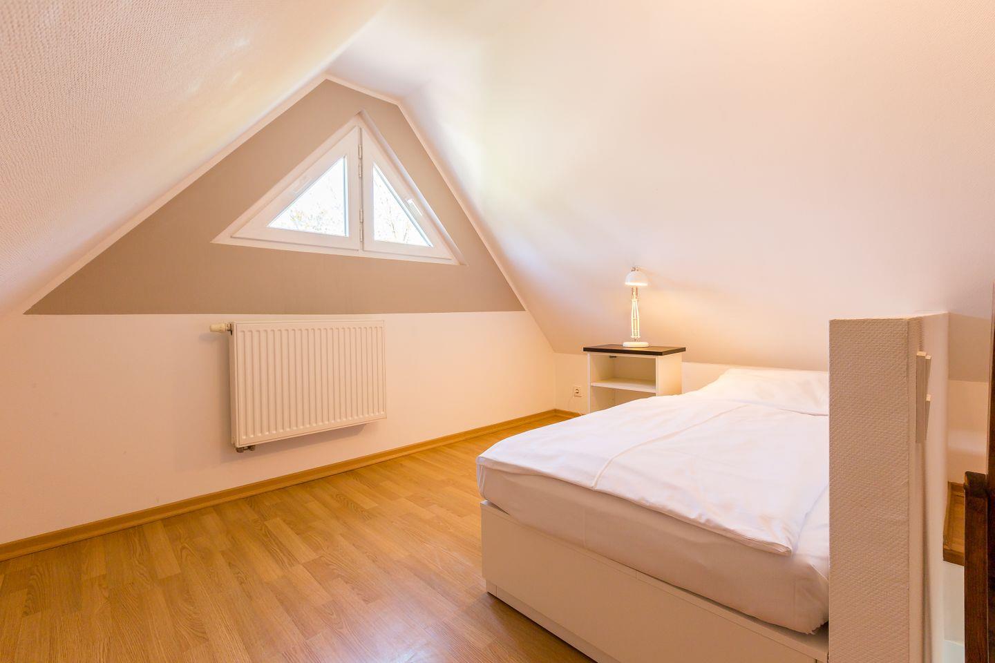 Im Obergeschoss befinden sich der Wohnbereich mit gemütlicher Sitz- und Essecke, eine offene Küchenzeile, ein Schlafzimmer mit Doppelbett (180x200 cm) und ein Bad mit Dusche/WC. Das Dachgeschoss verfügt über ein offenes zweites Schlafzimmer mit zwei Einzelbetten. Von hier hast du einen kleinen Ausblick auf die Ostsee. Im Preis inklusive ist die Nutzung des Wellnessbereiches im Untergeschoss. Hier befinden sich ein Schwimmbad, eine Saunalandschaft, ein Ruheraum sowie Kneippfußbäder und Massageduschen.