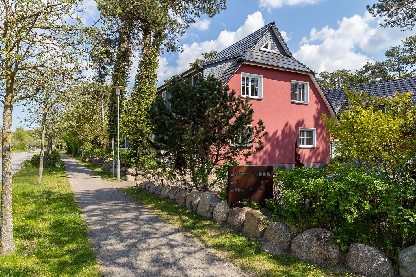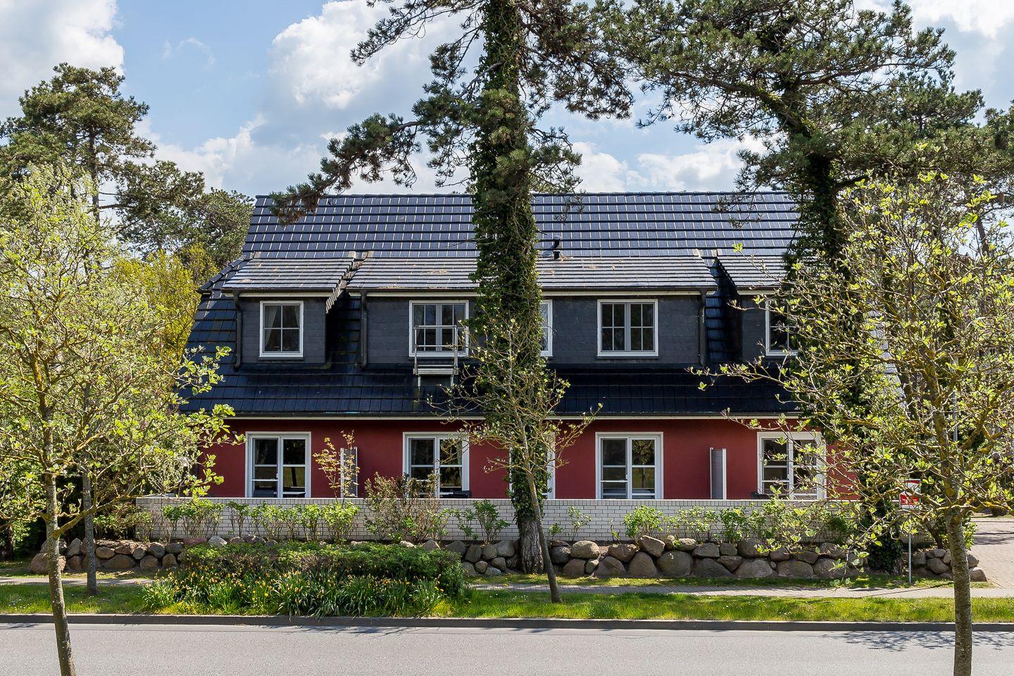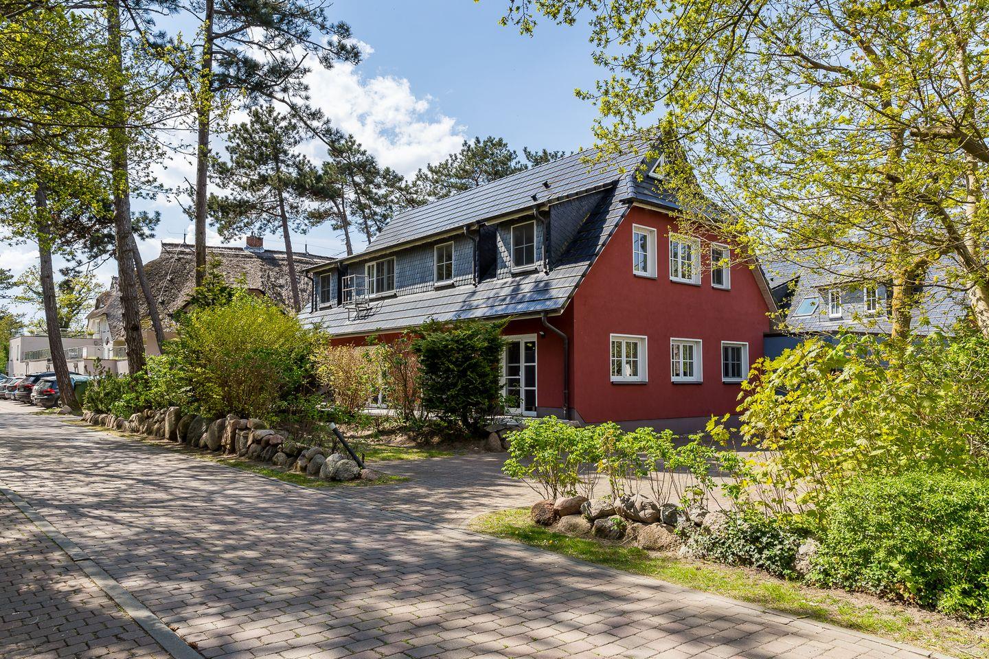 Die Hausanlage mit 13 Ferienwohnungen liegt nur 150 Meter vom weißen Ostseestrand entfernt und befindet sich direkt an der Bäderstraße L21. Neben der strandnahen Lage ist auch der Ortskern mit Bäckereien und einer Vielzahl von Restaurants, Cafés und Kunstgalerien nur ca. einen Kilometer entfernt. Der angrenzende Deich eignet sich perfekt für Wanderungen oder Radtouren in den Nationalpark, zum Weststrand und entlang der weiten Boddenlandschaft.