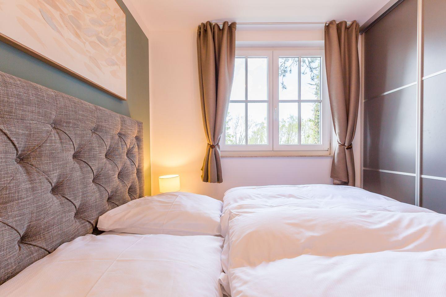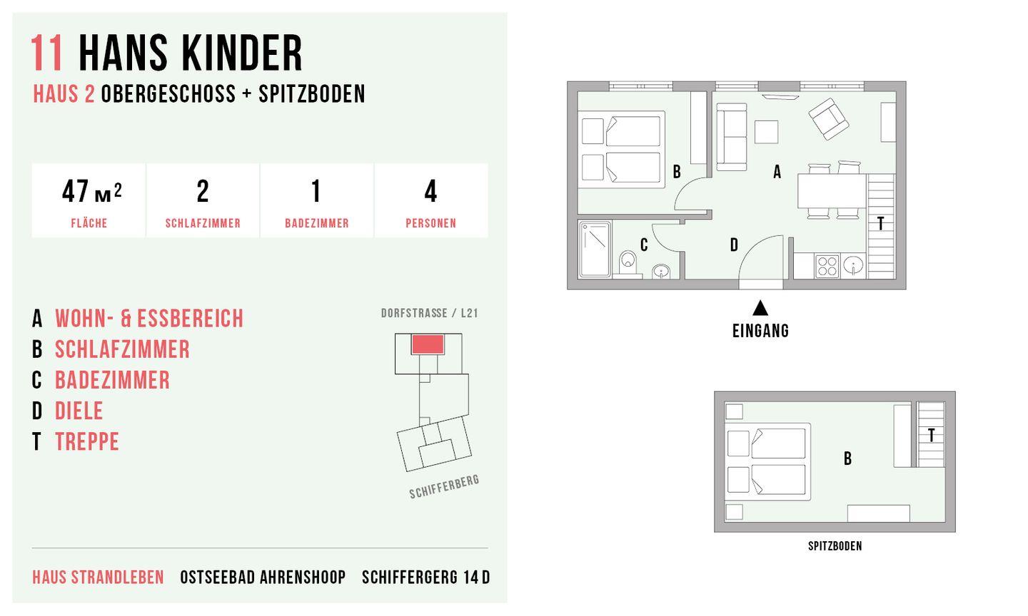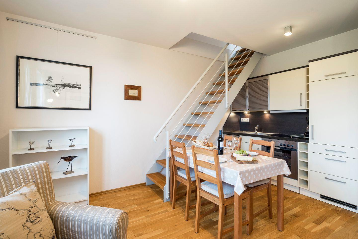 Im Obergeschoss befinden sich der Wohnbereich mit gemütlicher Sitz- und Essecke, eine offene Küchenzeile, ein Schlafzimmer mit Doppelbett (180x200 cm) und ein Bad mit Dusche/WC. Das Dachgeschoss verfügt über ein offenes zweites Schlafzimmer mit zwei Einzelbetten. Vom Wohnzimmer hast du einen seitlichen Blick auf die Ostsee. Im Preis inklusive ist die Nutzung des Wellnessbereiches im Untergeschoss. Hier befinden sich ein Schwimmbad, eine Saunalandschaft, ein Ruheraum sowie Kneippfußbäder und Massageduschen.