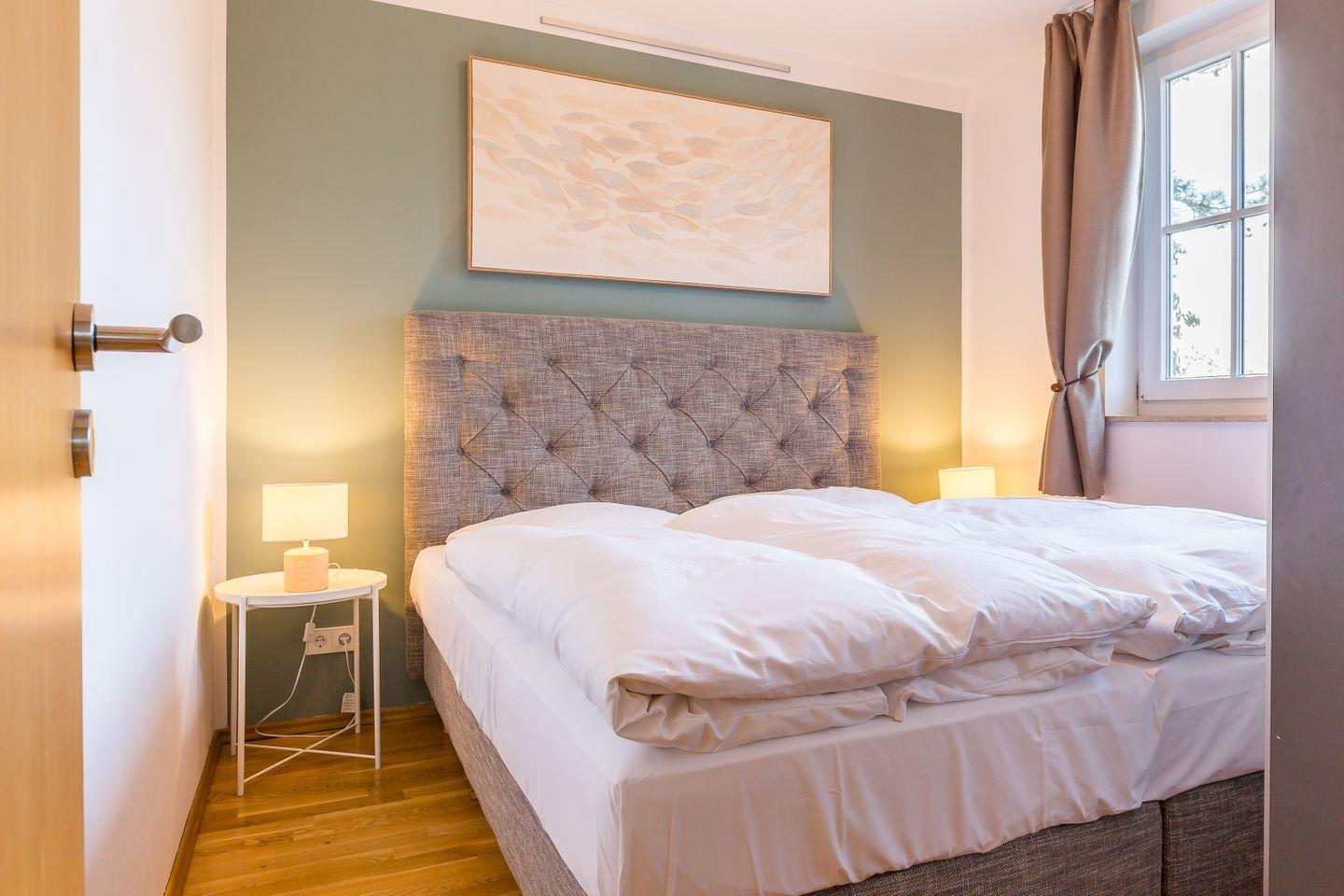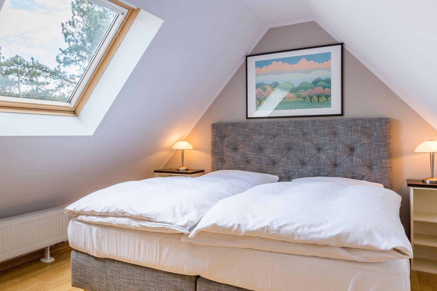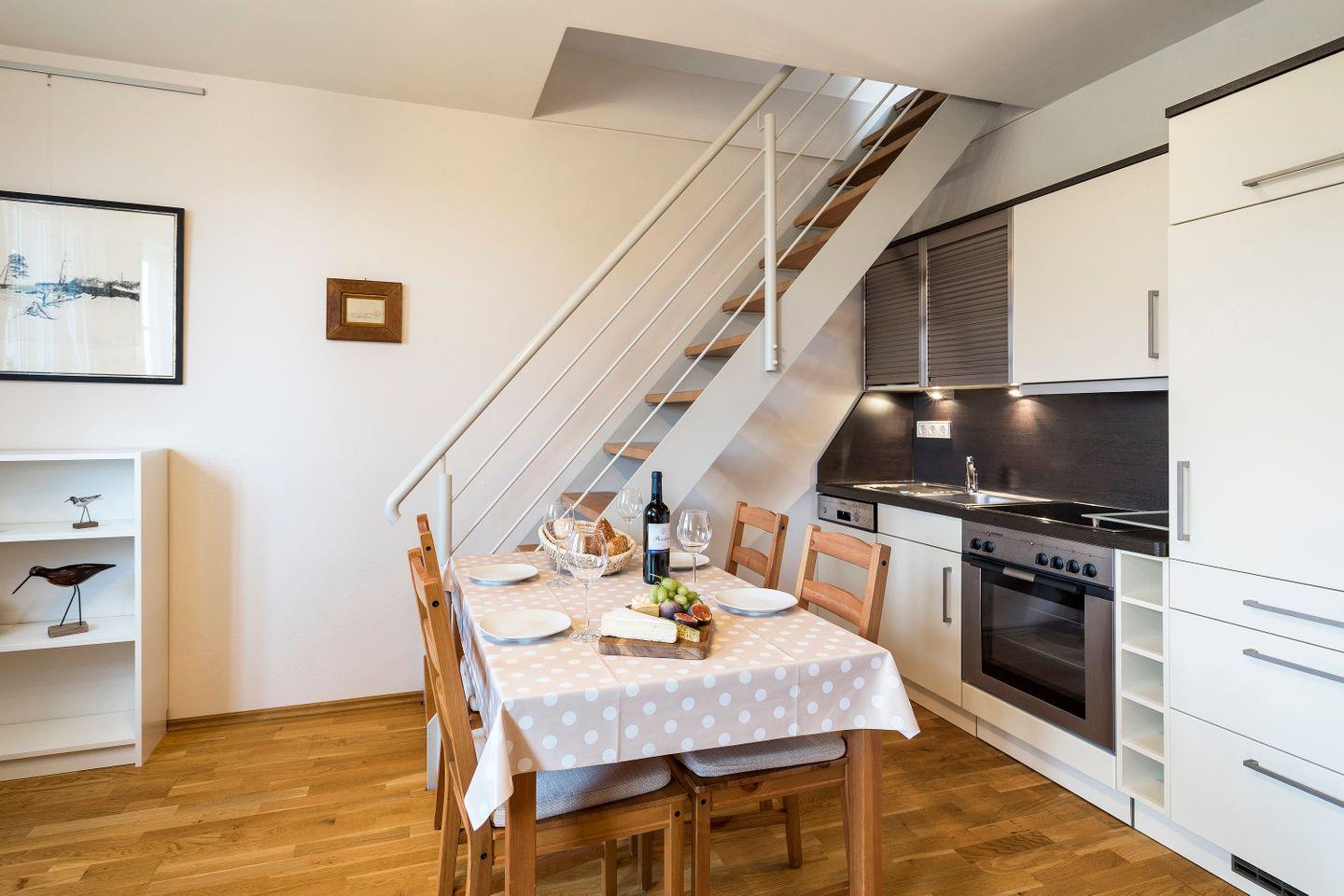 Im Obergeschoss befinden sich der Wohnbereich mit gemütlicher Sitz- und Essecke, eine offene Küchenzeile, ein Schlafzimmer mit Doppelbett (180x200 cm) und ein Bad mit Dusche/WC. Das Dachgeschoss verfügt über ein offenes zweites Schlafzimmer mit zwei Einzelbetten. Vom Wohnzimmer hast du einen seitlichen Blick auf die Ostsee. Im Preis inklusive ist die Nutzung des Wellnessbereiches im Untergeschoss. Hier befinden sich ein Schwimmbad, eine Saunalandschaft, ein Ruheraum sowie Kneippfußbäder und Massageduschen.