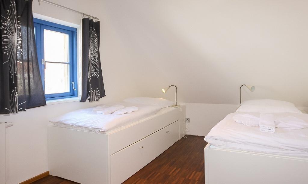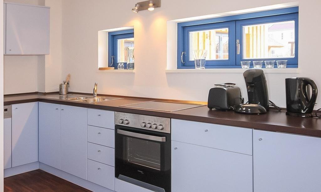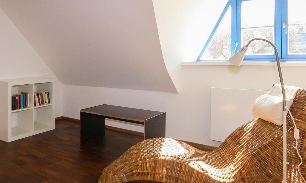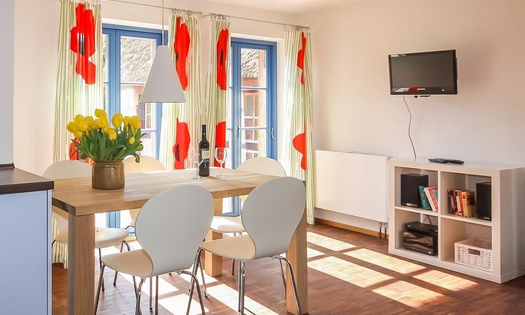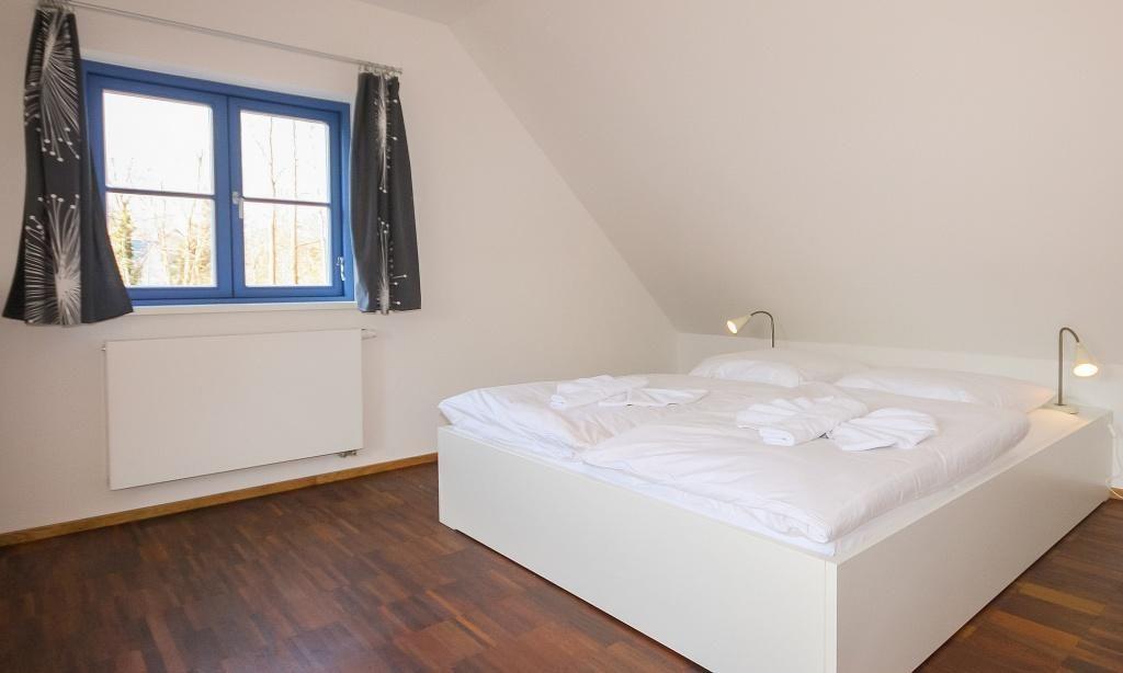Das Erdgeschoss verfügt über einen einladenden und lichtdurchfluteten Wohnraum mit einer gemütlichen Sitzecke und Ausblick auf die Terrasse. Die offene Küchenzeile mit angrenzendem Essbereich ist integriert und sorgt für einen offenen Wohncharakter. Ein Gäste-WC befindet sich ebenfalls auf der unteren Etage. Im Obergeschoss sind ein Schlafzimmer mit einem Doppelbett sowie ein zweites Schlafzimmer mit einem Einzelbett und einem ausziehbaren Kojenbett für ein bis zwei Personen untergebracht. Das großzügige Bad mit Dusche/WC im Obergeschoss sorgt für zusätzlichen Wohnkomfort.