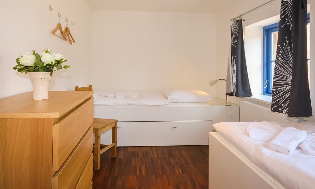Das Erdgeschoss verfügt über einen einladenden und lichtdurchfluteten Wohnraum mit einer gemütlichen Sitzecke und Ausblick auf die Terrasse. Die offene Küchenzeile mit angrenzendem Essbereich ist integriert und sorgt für einen offenen Wohncharakter. Im Erdgeschoss befindet sich ein Schlafzimmer mit einem Einzelbett und einem ausziehbaren Kojenbett für 1 bis 2 Personen. Ebenfalls auf der unteren Etage befindet sich das großzügige Bad mit Dusche/WC. Im Obergeschoss steht den Gästen ein weiteres gemütliches Schlafzimmer mit einem Doppelbett zur Verfügung.