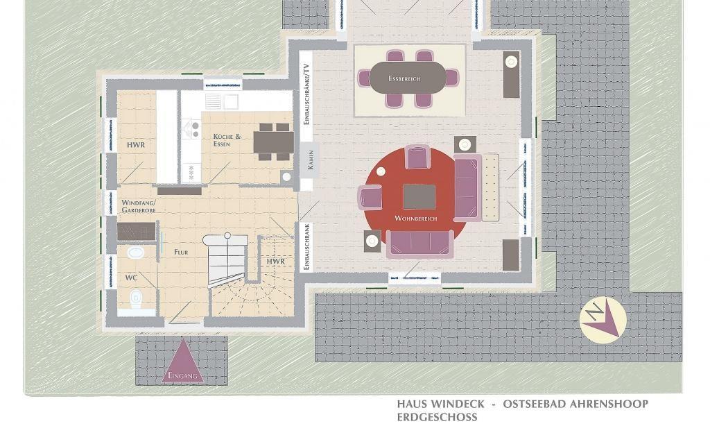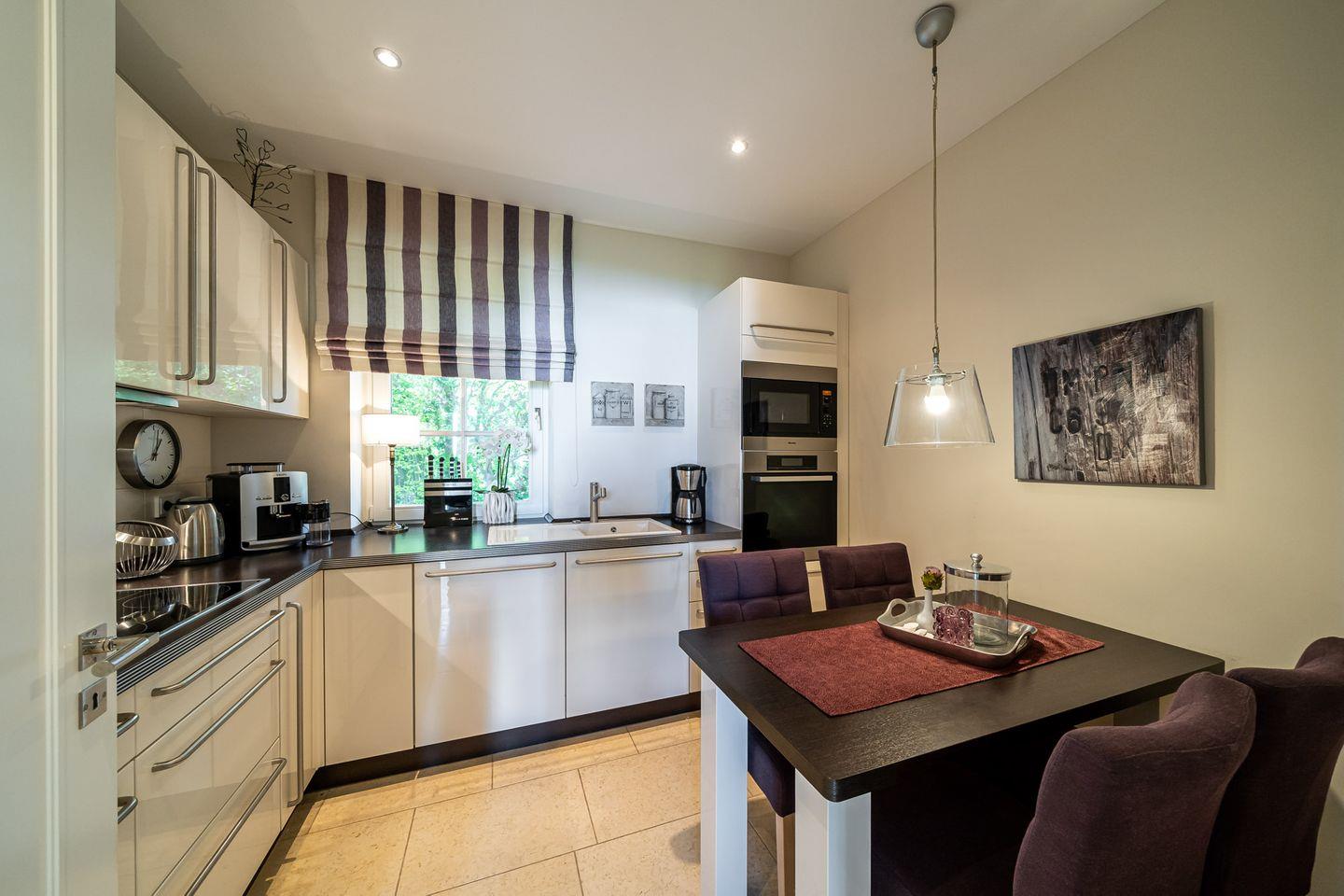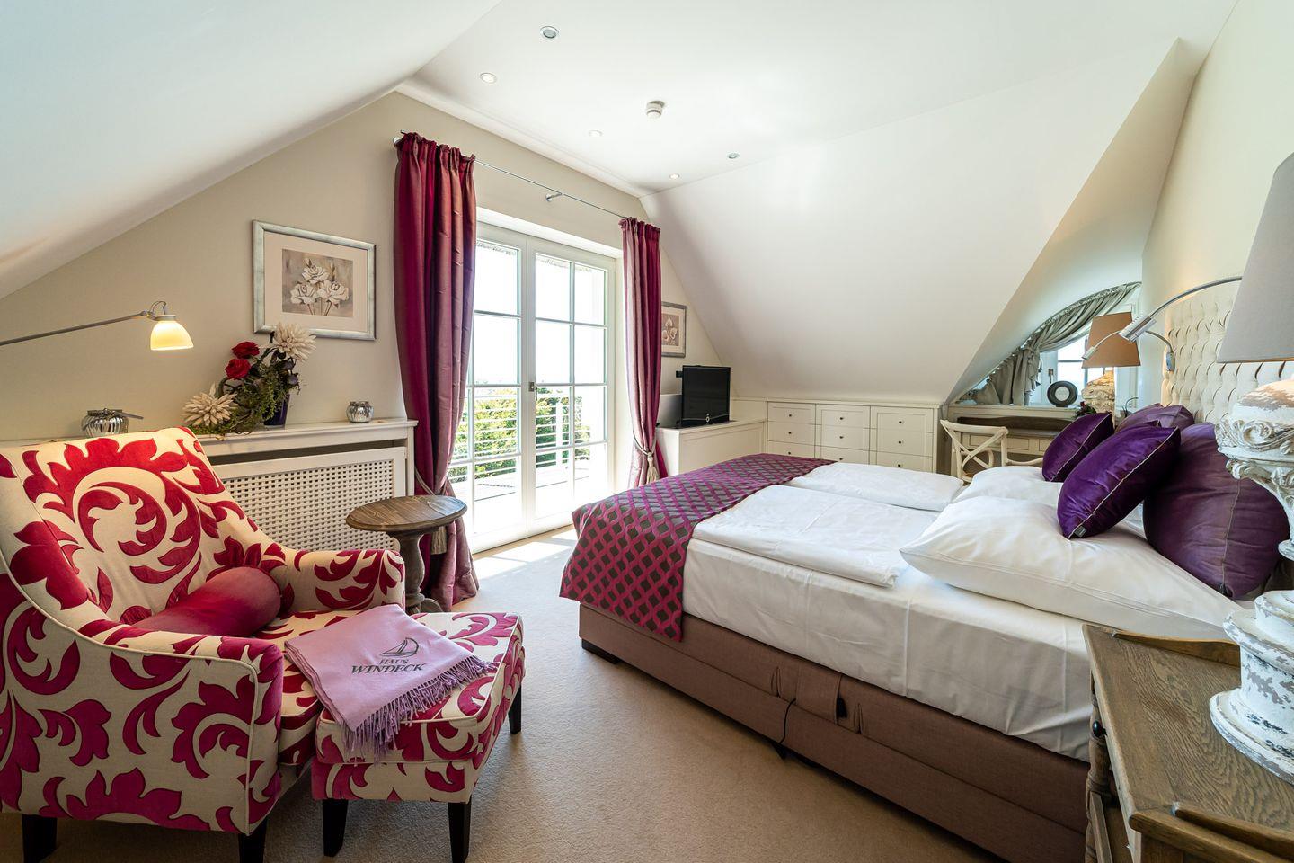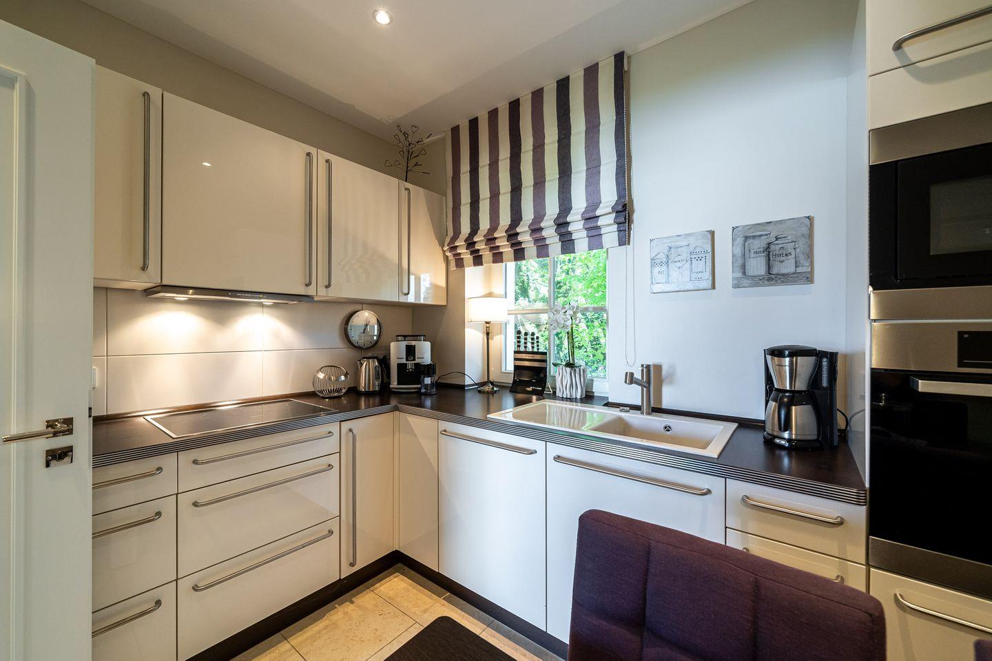 Tritt ein - in den Sonnenlicht durchfluteten Wohnraum, der über eine gemütliche Sitzecke am Kamin und einem einladenden Essbereich verfügt. Bereits vom Wohnraum aus genießt du den traumhaften Blick zur Ostsee. Die separate Küche bietet neben der hochwertigen Einbauküche auch einen kleinen Esstisch. Das Gäste-WC und ein Hauswirtschaftsraum befinden sich ebenfalls im Erdgeschoss. Über eine imposante Treppe gelangst du ins Dachgeschoss. Hier angekommen erwartet dich das seeseitig liegende Schlafzimmer mit Doppelbett, TV und einem Sekretär mit tollem Ausblick. Eine eigene Ankleide, ein luxuriöses Bad mit Doppelwaschtisch/ Badewanne/Wellnessdusche/WC sowie ein Balkon sorgen für weiteren Wohnkomfort. Das zweite Schlafzimmer verfügt ebenfalls über ein Doppelbett und einen TV. Das angrenzende Badezimmer ist mit einer Wellnessdusche ausgestattet.