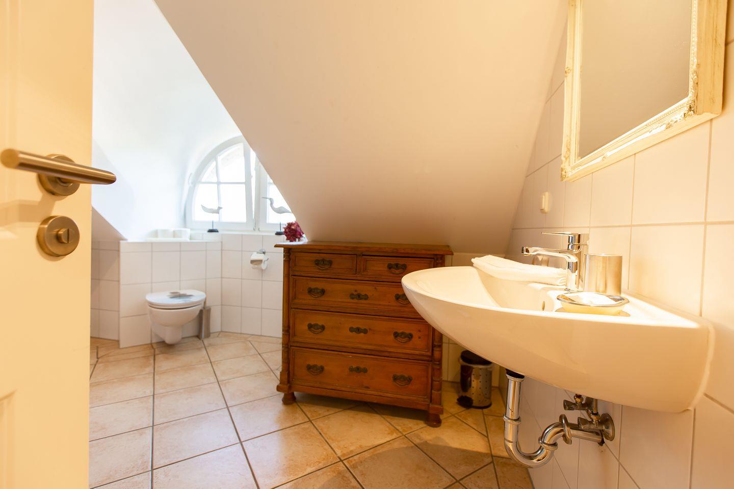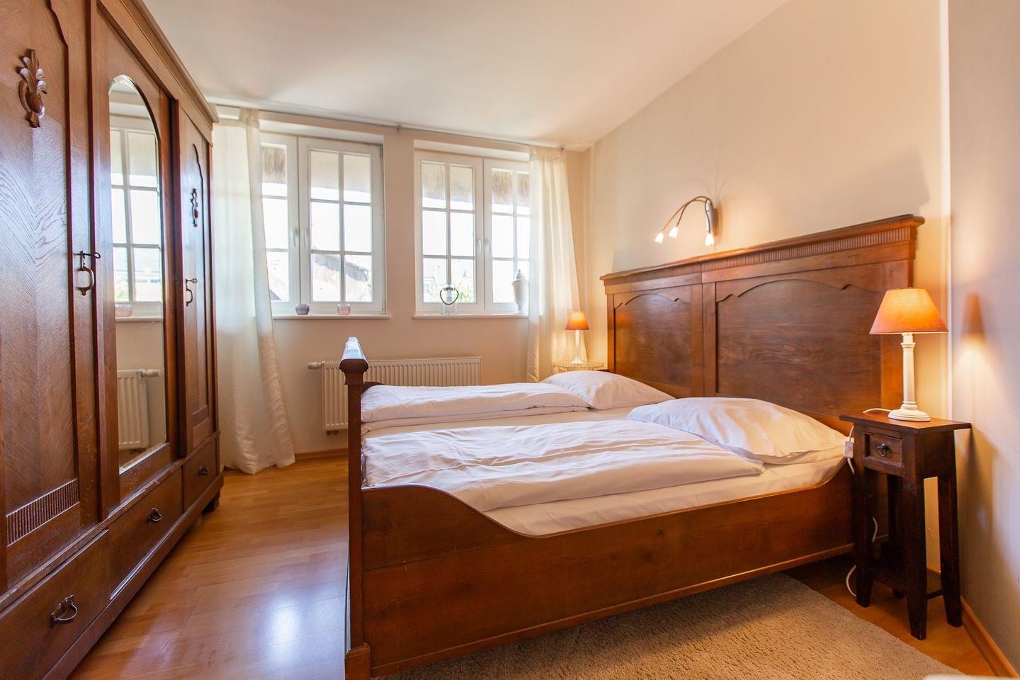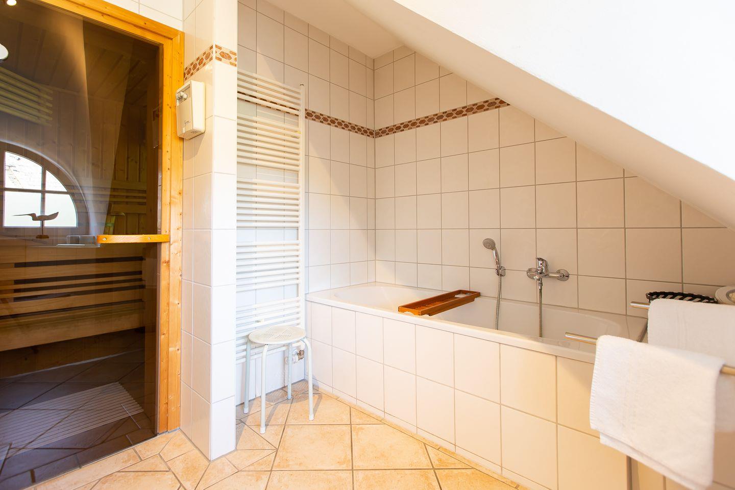 Im Erdgeschoss erwartet dich der Wohnraum mit einer gemütlichen Sitzecke am Kaminofen. Der große Esstisch ist direkt im Wohnbereich integriert und bietet ausreichend Platz für die ganze Familie. Die Küche befindet sich separat und lässt beim Kochen keine Wünsche offen. Weiterhin befindet sich auf der unteren Etage ein Bad mit Dusche/WC. Das Obergeschoss beherbergt zwei Schlafzimmer, die jeweils mit Doppelbetten ausgestattet sind. Auch das Hauptbadezimmer befindet sich hier, dass mit einer Dusche/WC, einer Badewanne und einer kleinen Sauna für zusätzlichen Wohnkomfort sorgt.
