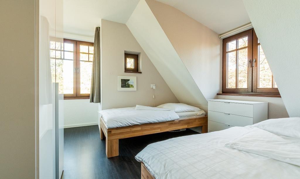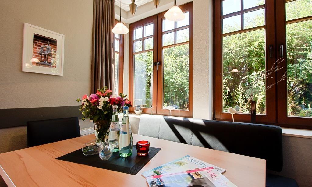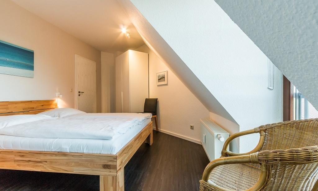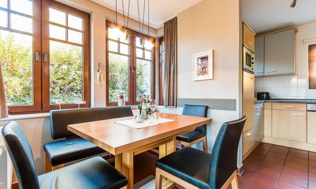 Im Erdgeschoss empfängt dich der Wohnraum mit einer modernen Leder-Sitzecke am Kaminofen. Der Essbereich ist im Erker integriert und die komplett ausgestattete Küchenzeile fügt sich harmonisch in den Wohnbereich ein und schafft so einen offenen Wohncharakter. Ein kleiner Flur und ein Gäste-WC finden ebenfalls in der unteren Etage Platz. Die Süd-West-Terrasse ist mit hochwertigen Teakholz-Gartenmöbeln ausgestattet und verspricht dir entspannte Stunden nach einem ereignisreichen Tag. Das Obergeschoss beherbergt ein Schlafzimmer mit einem Doppelbett sowie ein zweites Schlafzimmer mit drei Einzelbetten. Abgerundet wird das familienfreundliche Ferienhaus mit einem Tageslichtbad mit Dusche/WC.