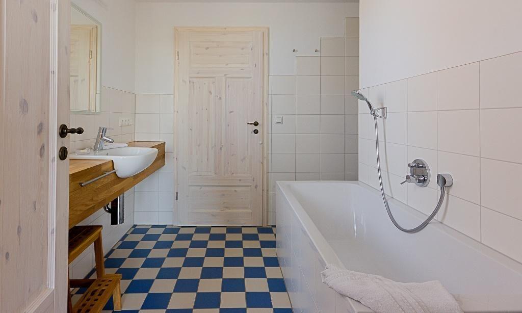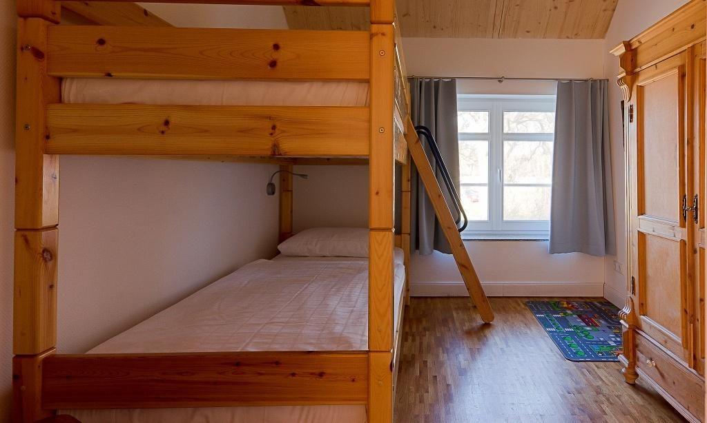 Neben einem abgeschlossenen Eingangsbereich mit Garderobe erwartet dich im Erdgeschoss ein heller Wohnraum mit einer gemütlichen Sitzecke am modernen Kaminofen. Über einen offenen Zugang gelangst du in die großzügige Küche im Landhausstil. Die hochwertige Einbauküche lässt keine Wünsche offen und bereitet garantiert jedem Hobbykoch Freude. Der Esstisch bietet ausreichend Platz für acht Personen und ist ein idealer Platz für gesellige Abende. Weiterhin findet ein Schlafzimmer mit Doppelbett auf der unteren Etage Platz. Das Bad ist mit einer Dusche, einer Badewanne sowie einem WC ausgestattet. Das Dachgeschoss beherbergt zwei Schlafzimmer jeweils mit einem Doppelbett (1x mit Überlänge) sowie ein Kinderschlafzimmer mit einem Doppelstockbett (mit Sicherung). Weiterhin befindet sich auch hier ein Bad mit Dusche/WC.