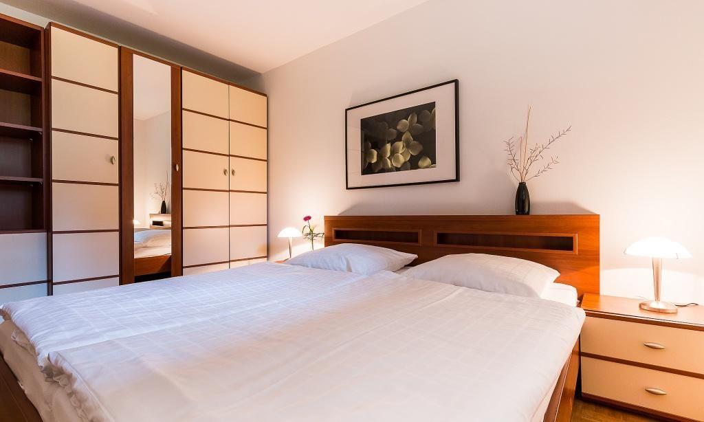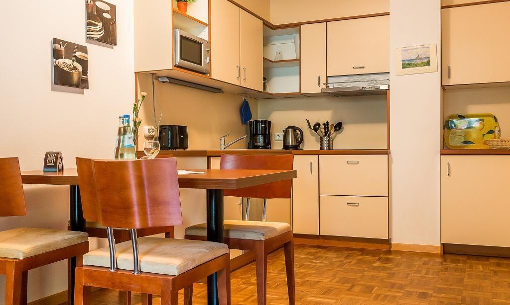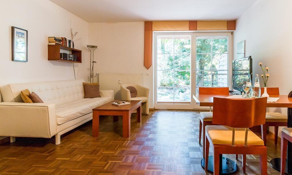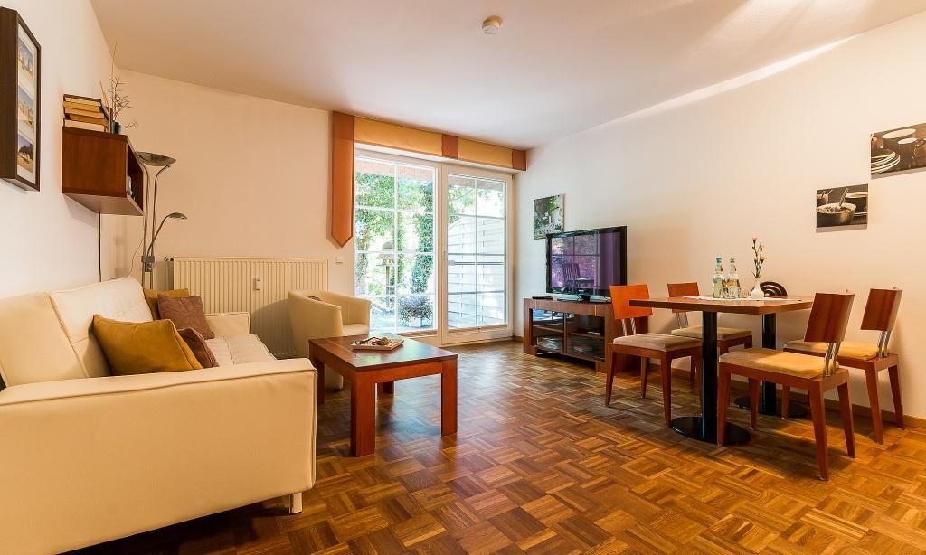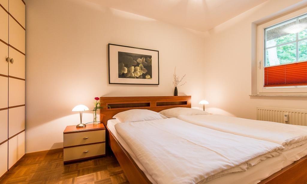 Die Erdgeschoss-Wohnung hat einen gemütlichen Wohnraum mit moderner Sitzecke und großzügigen TV. Das Sofa bietet eine zusätzliche Aufbettungsmöglichkeit für eine Person. Auch die voll ausgestattete Küchenzeile und der Essbereich sind im Wohnraum integriert und sorgen für einen offenen und kommunikativen Wohncharakter. Das Schlafzimmer ist mit einem Doppelbett und großem Kleiderschrank ausgestattet. Separat befindet sich das Bad mit Dusche/WC.