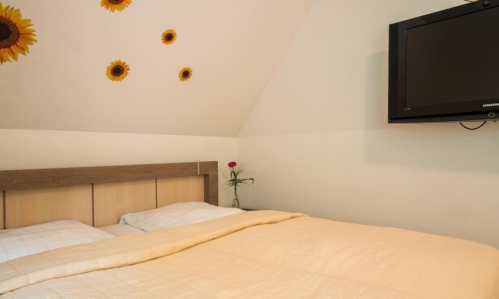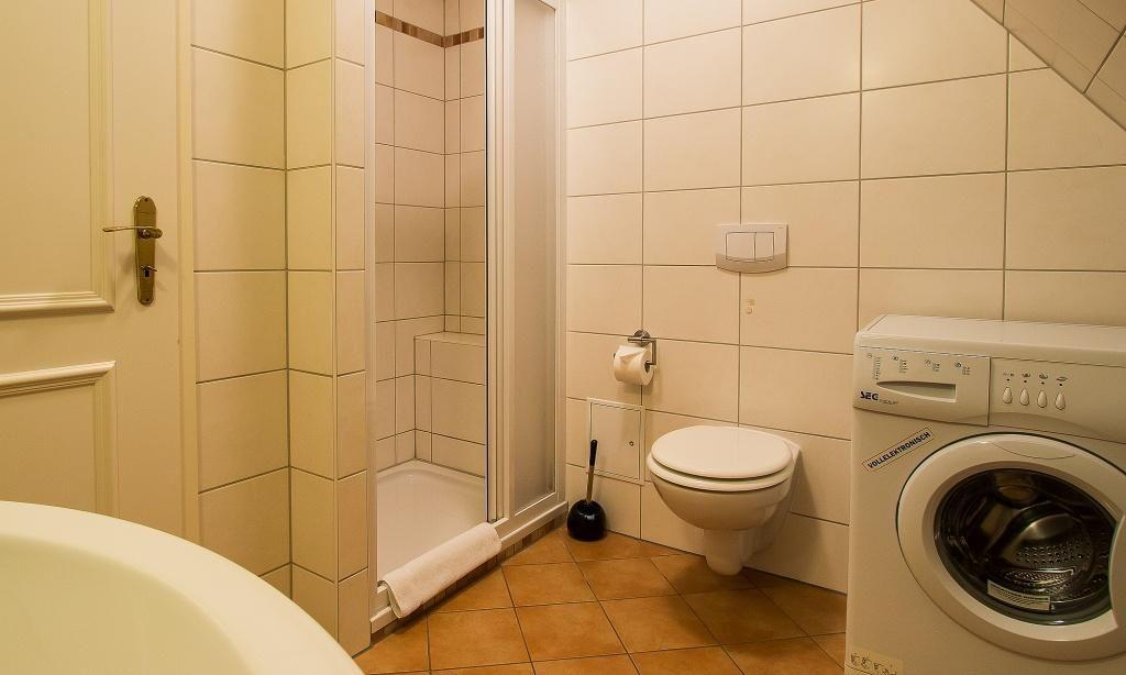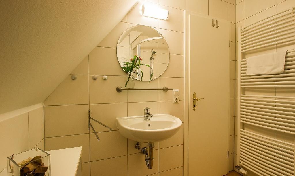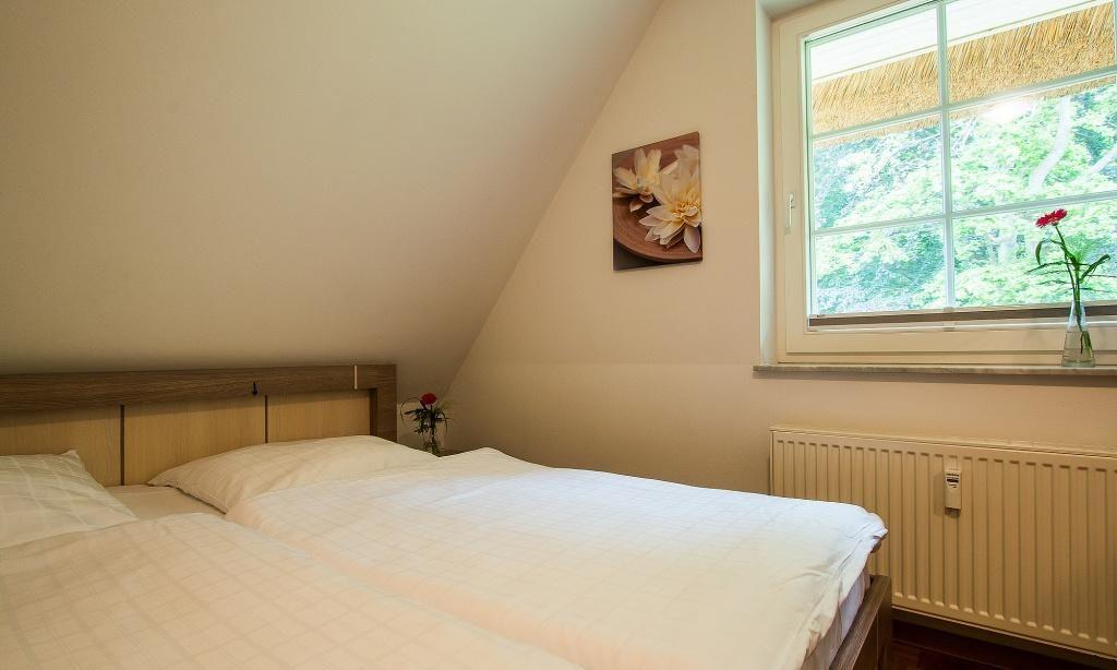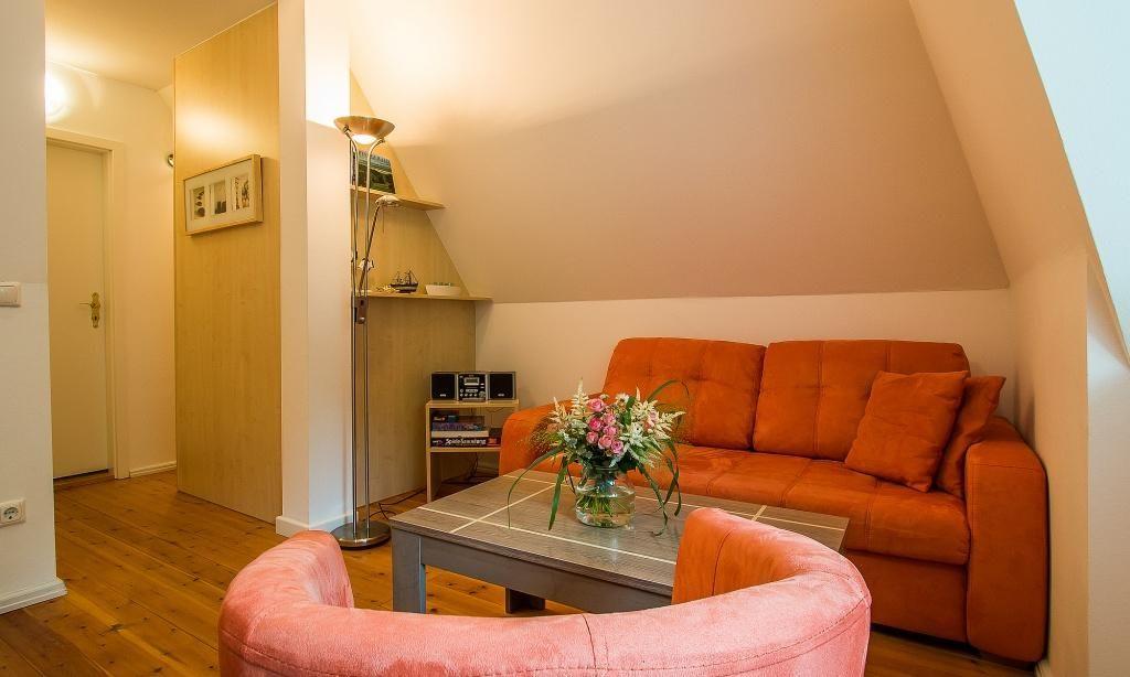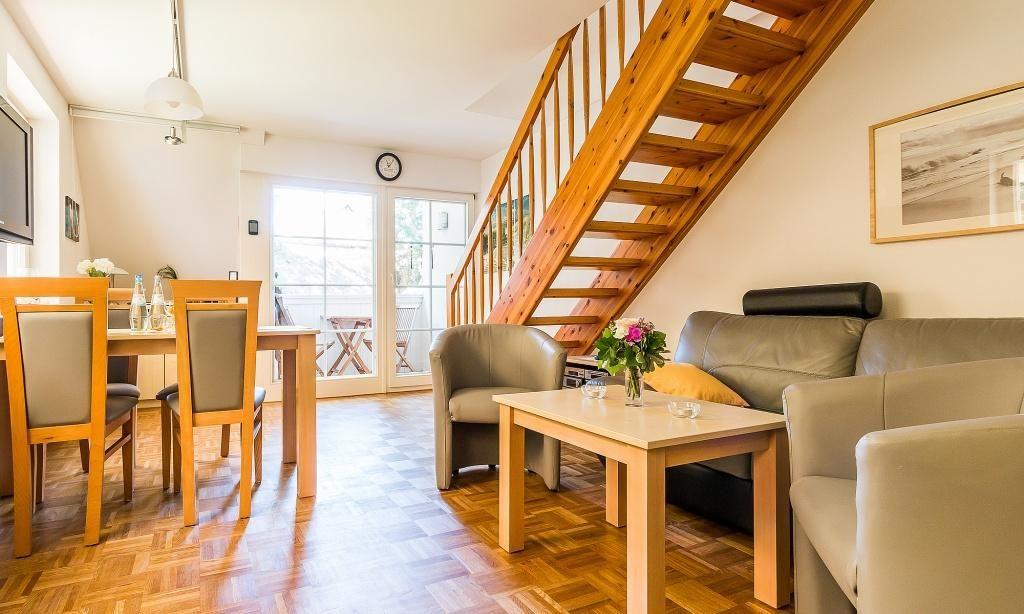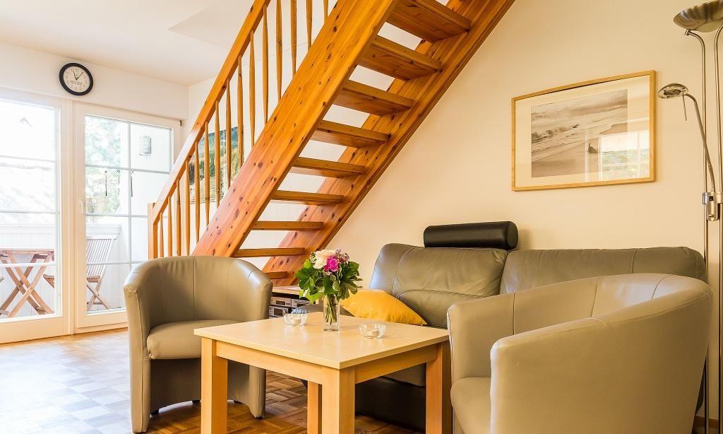 In der Obergeschoss-Wohnung empfängt dich der Wohnraum mit einer gemütlichen Sitzecke. Von hier aus gelangst du auch direkt auf den Balkon und genießt den Blick ins Grüne. Die komfortable Küchenzeile mit Essbereich ist direkt integriert und schafft einen offenen Wohncharakter. Ein Schlafzimmer befindet sich ebenfalls auf dieser Etage und ist mit einem Doppelbett und großzügigen Kleiderschrank ausgestattet. Separat angeschlossen ist das Bad mit Dusche/WC. Über die Holztreppe gelangst du ins Dachgeschoss, dass über ein zweites Schlafzimmer mit Doppelbett sowie ein zweites Bad mit Dusche/WC verfügt. Das Sofa im Schlafraum dient zudem als Aufbettung für eine zusätzliche Person.