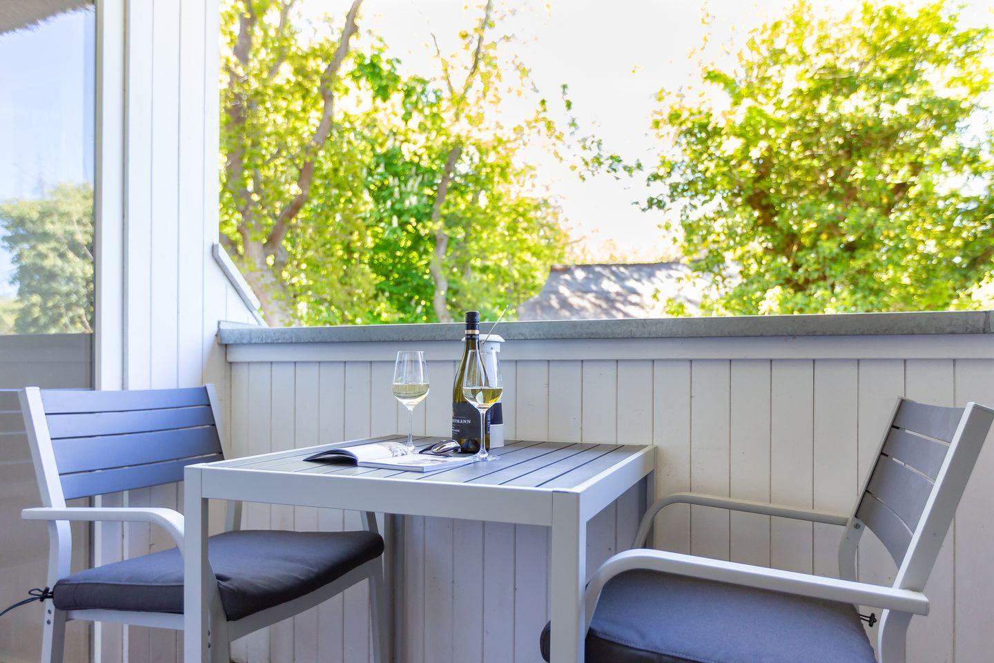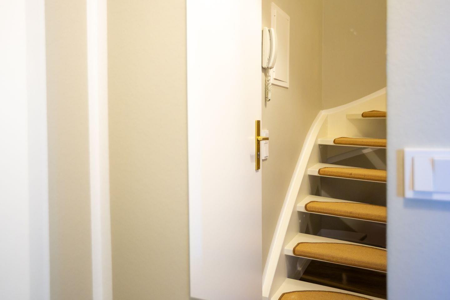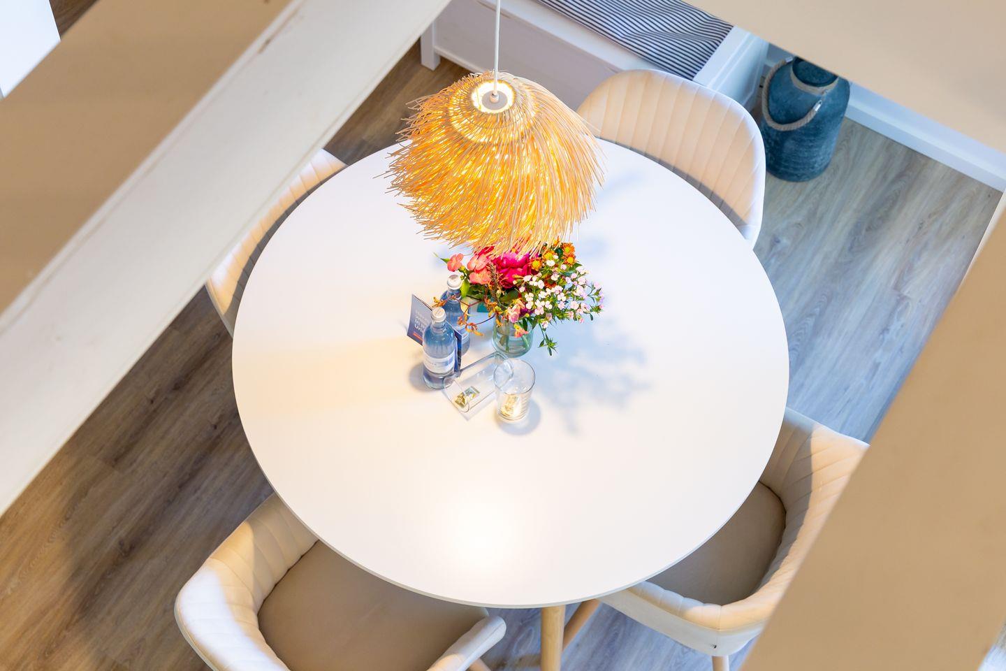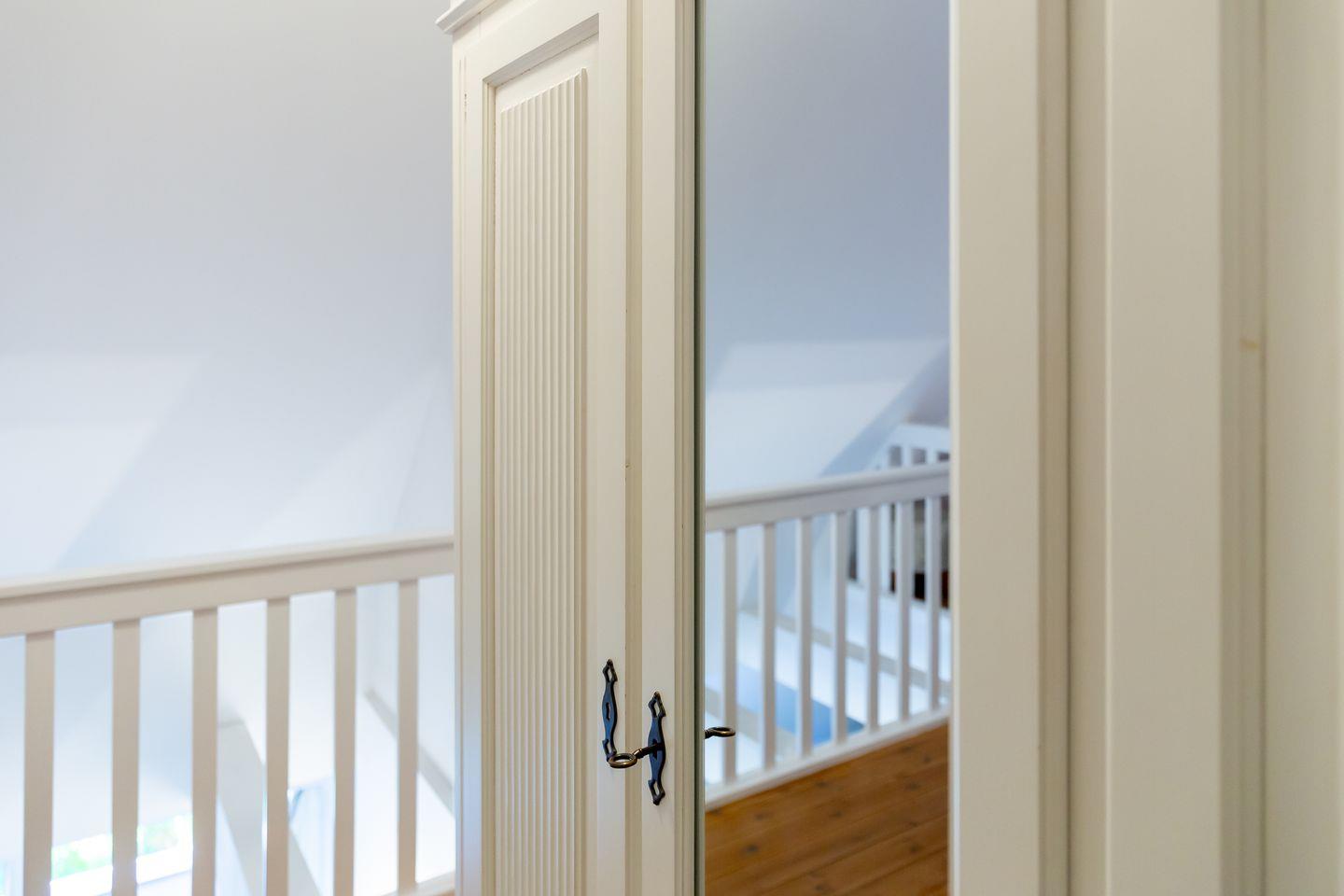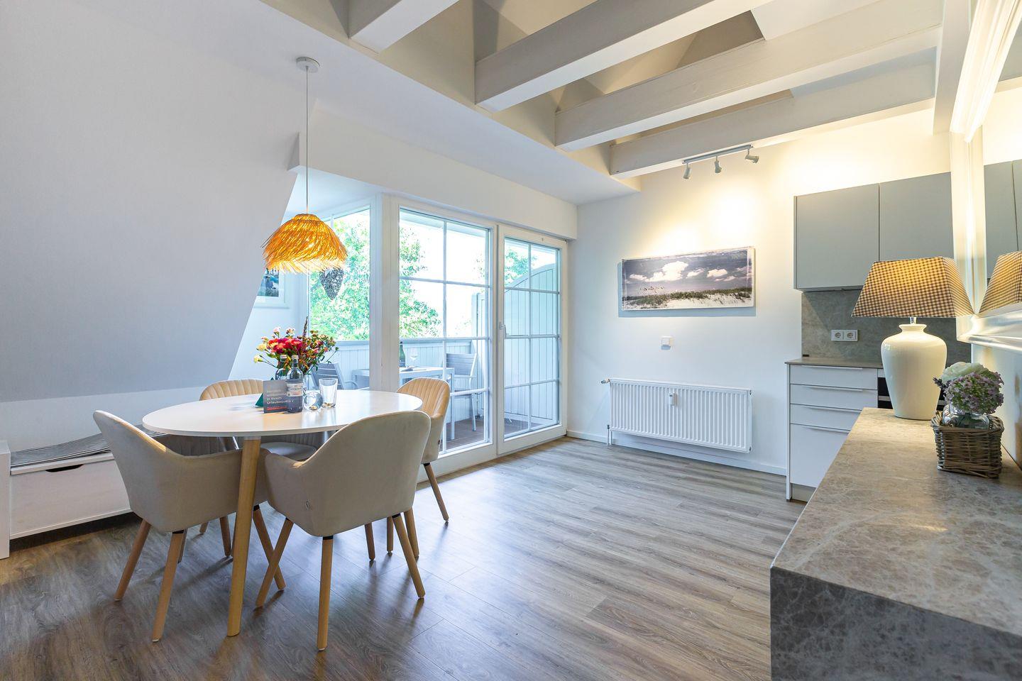 Wohn- und Küchenbereich, das schicke Bad sowie der Balkon mit grünem Ausblick befinden sich auf der ersten Etage. Über eine Treppe geht’s ins obere Schlafzimmer mit offener Empore. Von hier hast du nicht nur ein kuscheliges Refugium zum Träumen, sondern auch einen schönen Blick hinunter in den Wohnraum. Alles wirkt hier ruhig, klar und gleichzeitig wohlig warm – eine Wohnung zum Ankommen, Durchatmen und Wohlfühlen. Ideal für alle, die es modern, schick und trotzdem richtig gemütlich mögen. Zur Ferienwohnung gehört außerdem der PKW-Stellplatz Nr. 5.