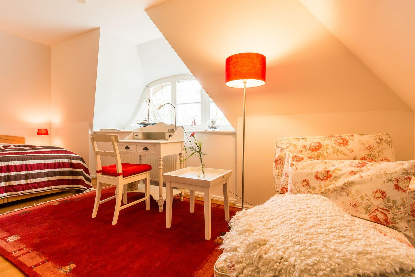 Im Obergeschoss erwartet dich der freundliche Wohnraum mit einer gemütlichen Sitzecke. Die komfortable Küchenzeile mit Essbereich ist unmittelbar integriert und sorgt für einen offenen Wohncharakter. Das Schlafzimmer verfügt über zwei Einzelbetten. Weiterhin findet ein Bad mit Dusche/WC in dieser Etage Platz. Das Dachgeschoss verfügt über ein zweites Schlafzimmer, dass mit einem Doppelbett ausgestattet ist. Der dazugehörige Balkon ist direkt vom Wohnbereich aus erreichbar.