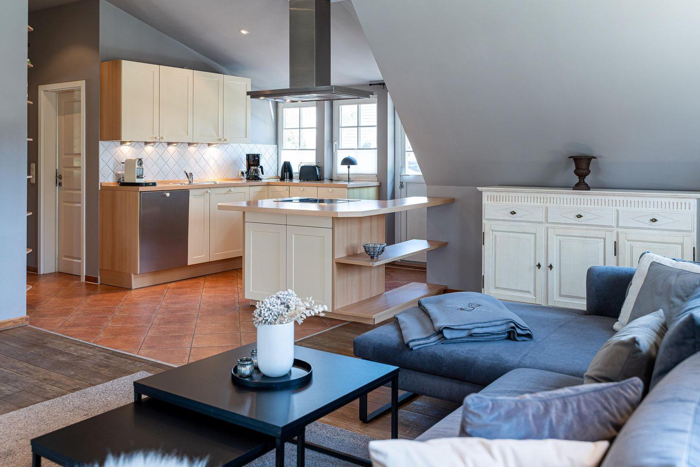 Diese stilvolle Ferienwohnung erstreckt sich über das gesamte Dachgeschoss eines gepflegten Geschäftshauses und bietet viel Raum zum Ankommen, Durchatmen und Wohlfühlen – perfekt für einen erholsamen Urlaub mit bis zu vier Personen. Der Zugang zur Ferienwohnung erfolgt über eine außenliegende Treppe. Die seeseitige Dachterrasse macht Lust auf Meer, Sonne und entspannte Urlaubstage. Im Inneren erwartet dich ein großzügiger, lichtdurchfluteter Wohnbereich mit gemütlicher Sitzecke und einem einladenden Essplatz für gemeinsame Mahlzeiten und lange Abende.