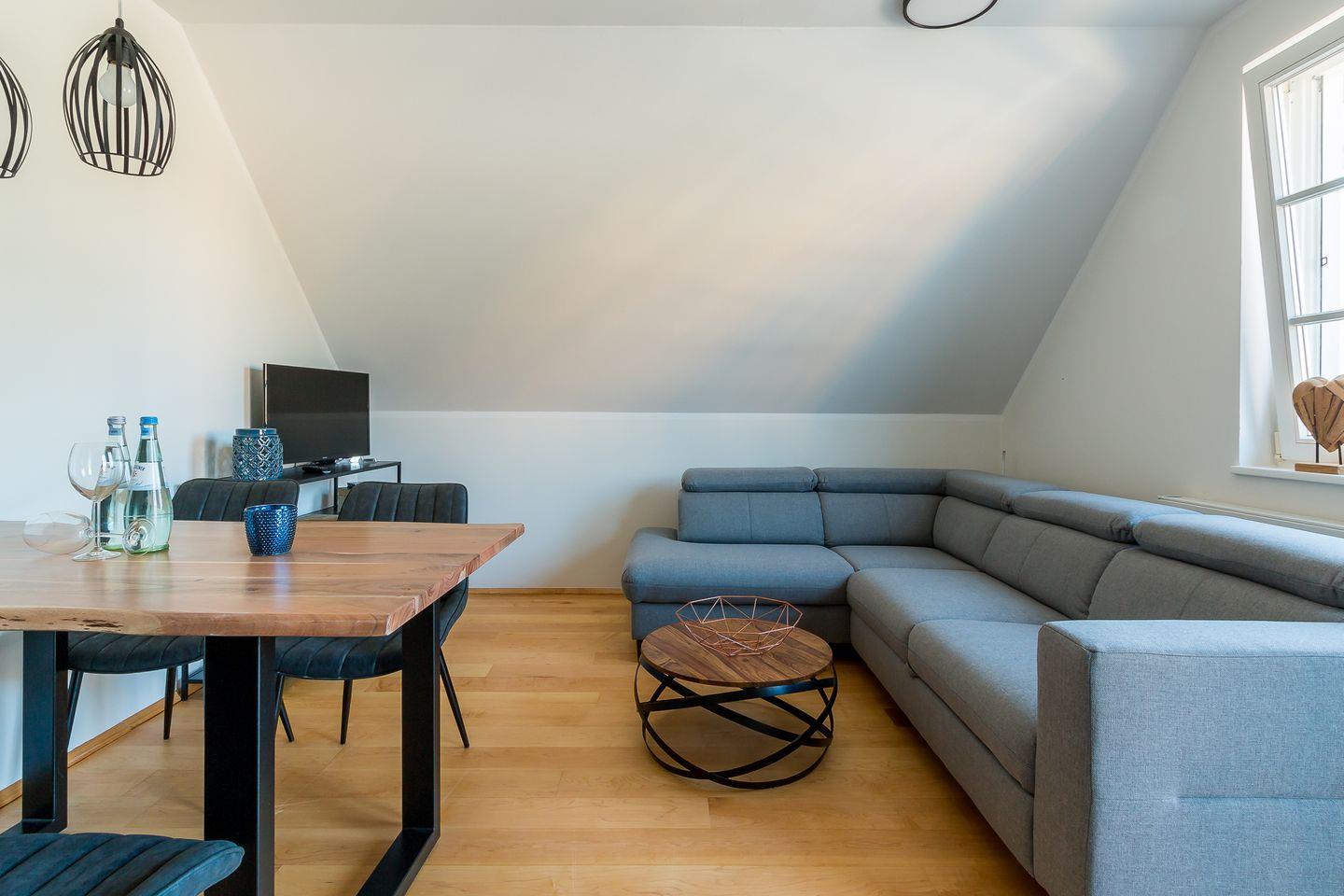 Die gemütliche Obergeschosswohnung auf der Sonnenseite verfügt über einen Wohnraum mit integrierter Küchenzeile, ein Schlafzimmer mit Doppelbett sowie ein Bad mit Dusche/WC und Westbalkon. Die Schlafcouch bietet eine zusätzliche Aufbettungsmöglichkeit für zwei Personen. Du liebst es frühstücken zu gehen? Dann brauchst du nur die Treppe runter und ins Café Pieni zu kommen. Das niedliche Café befindet sich im selben Haus.