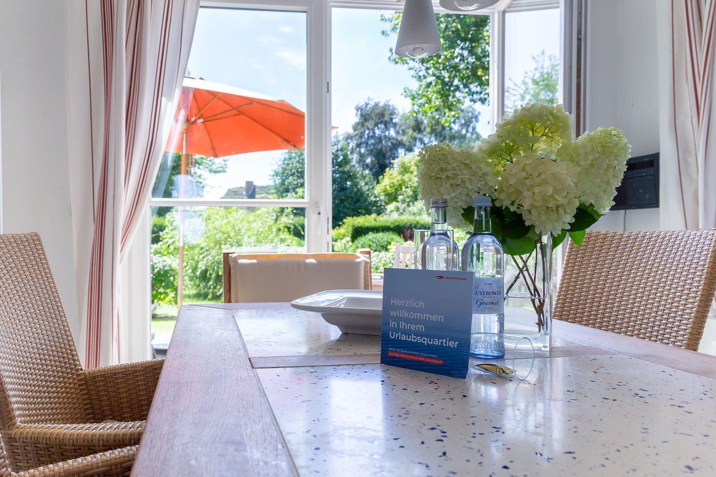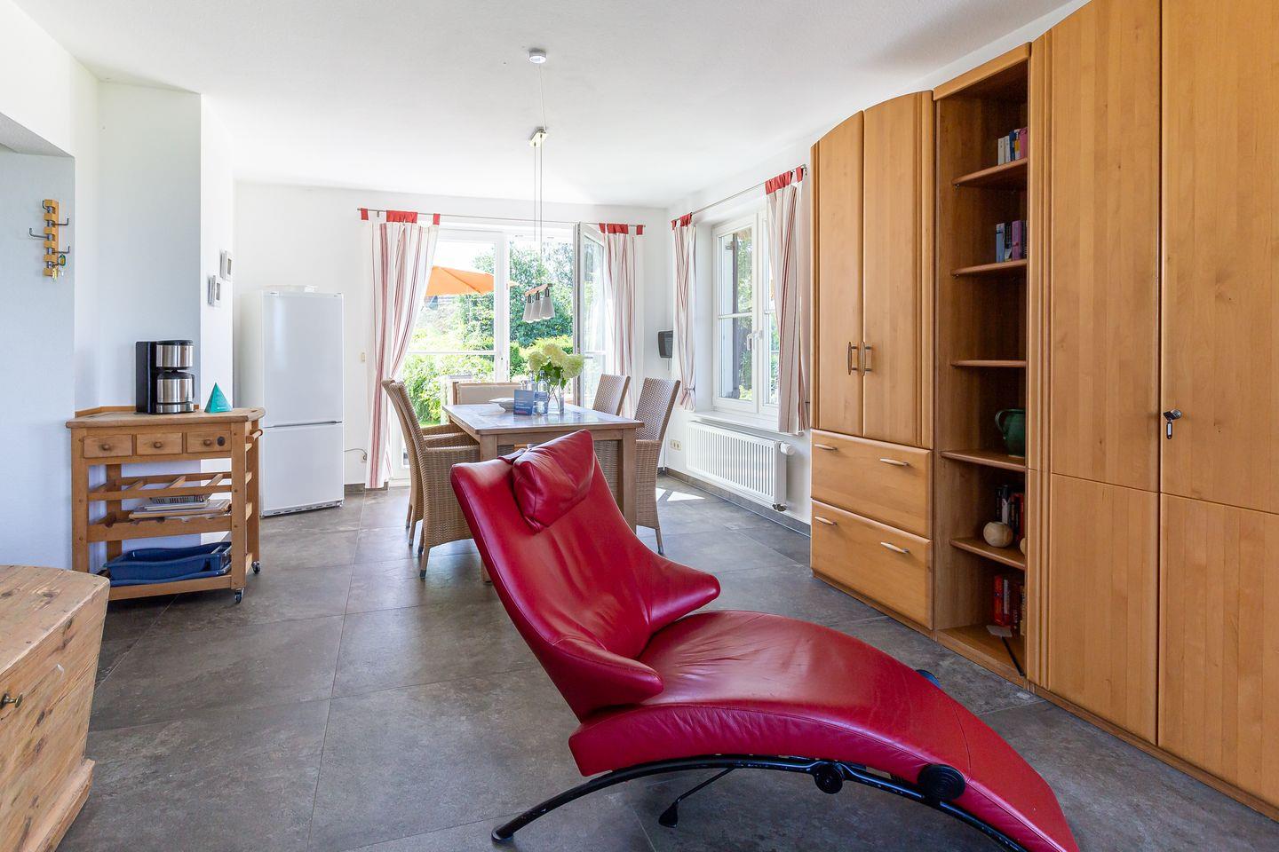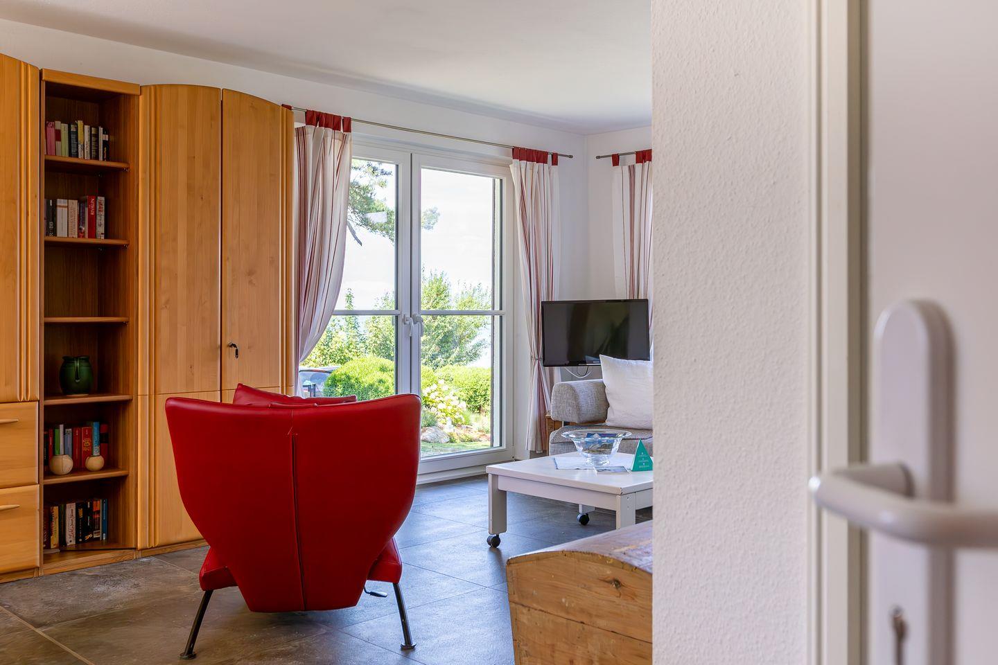 Die Unterkunft befindet sich im Erdgeschoss des Hauses und verfügt über einen lichtdurchfluteten und gemütlich eingerichteten Wohnraum, eine schlichte integrierte Küchenzeile mit 2-Platten-Ceranfeld, einen sonnigen Essbereich, ein Schlafzimmer mit Doppelbett und ein Bad mit Dusche/WC. Aus dem Schlafzimmer genießt du zudem einen wunderschönen Blick auf das Meer.