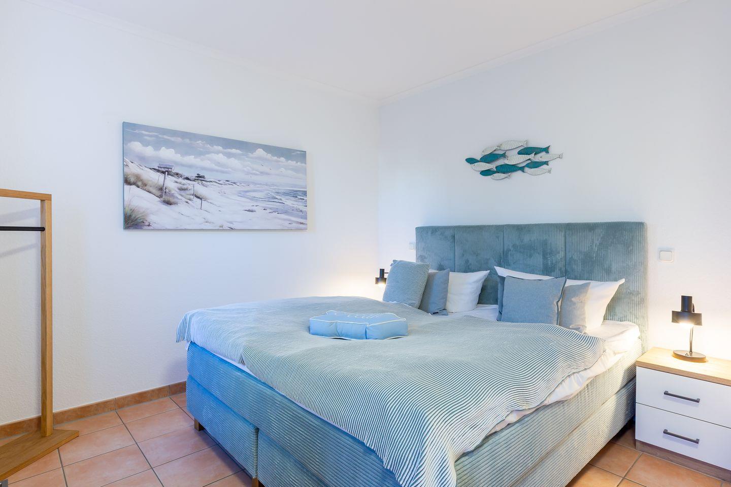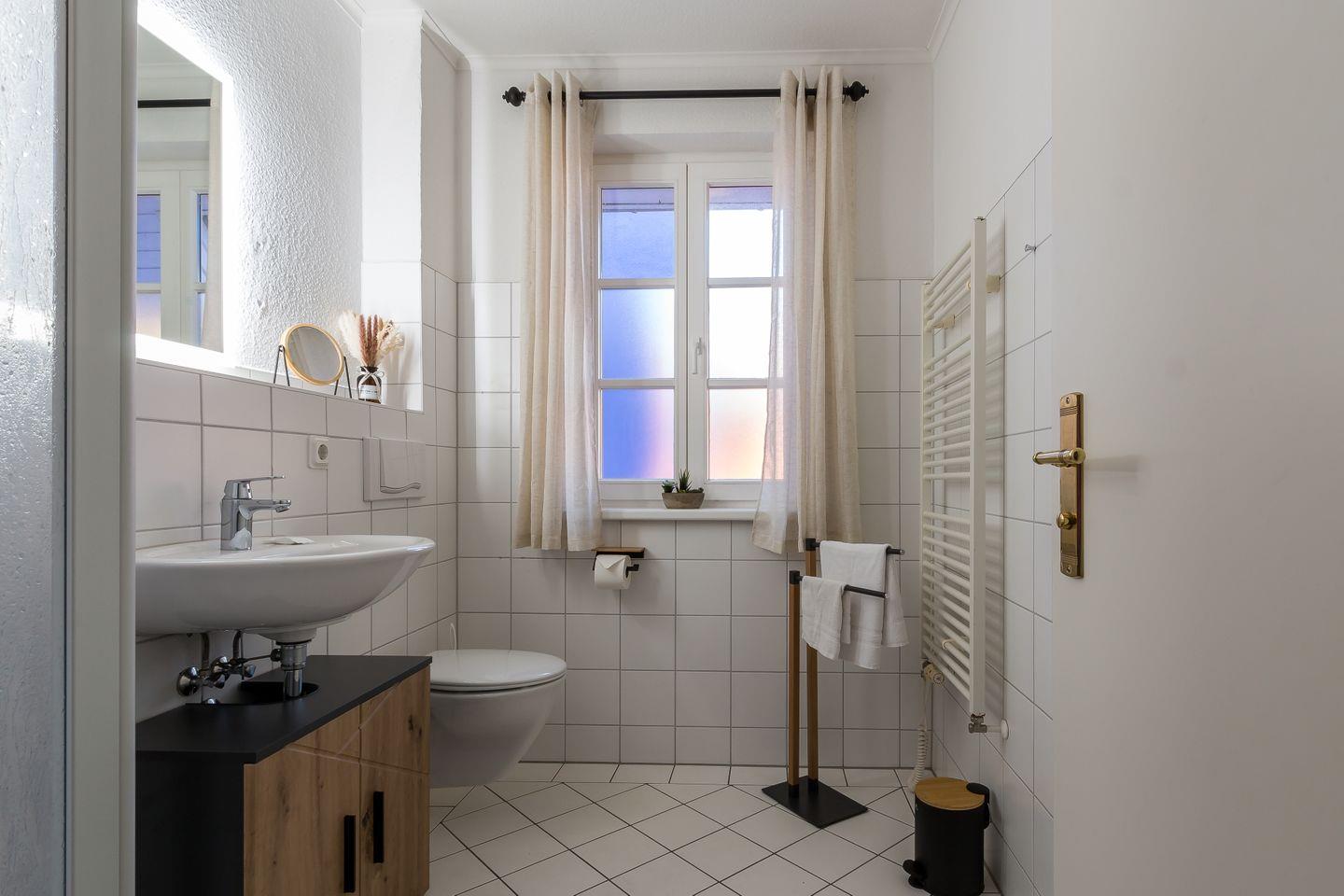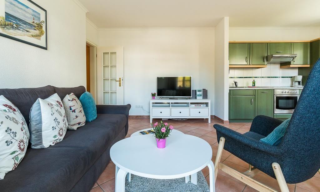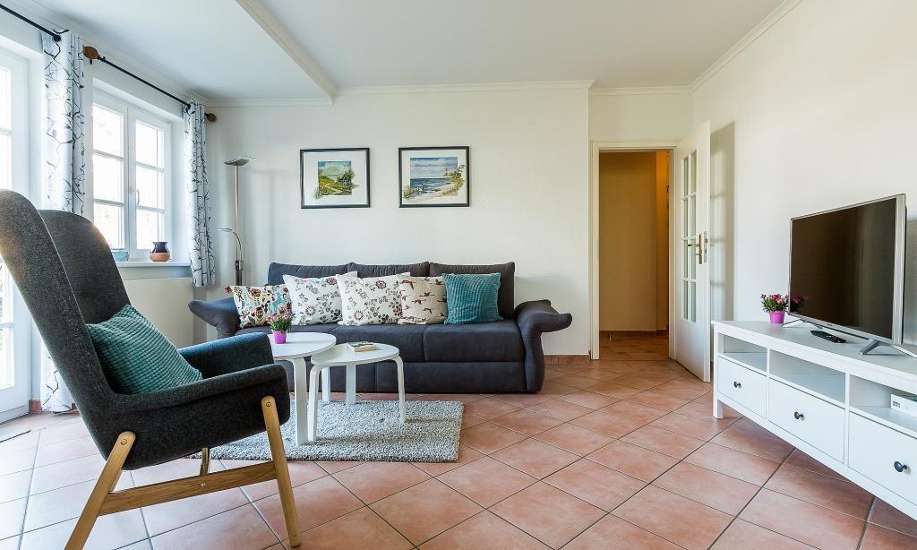 Die niedliche Erdgeschosswohnung erwartet dich mit einem neu eingerichteten und offenen Wohnbereich. Gemütlichkeit versprechen die Couch und der Sessel am Gaskaminofen mit TV-Bereich. Die integrierte Küchenzeile ist komfortabel ausgestattet und hat alles was es zum Kochen braucht. Das Schlafzimmer ist mit einem Doppelbett und einem zweiten TV ausgestattet. Ein Bad mit Dusche/WC rundet die Ferienwohnung ab. Für eine zusätzliche Aufbettung kann die Couch im Wohnbereich ausgeklappt werden. Helle, freundliche Farben und der Einrichtungsmix aus Landhaus und Scandi sorgen für Urlaubs-Feeling und Wohlfühlatmosphäre.