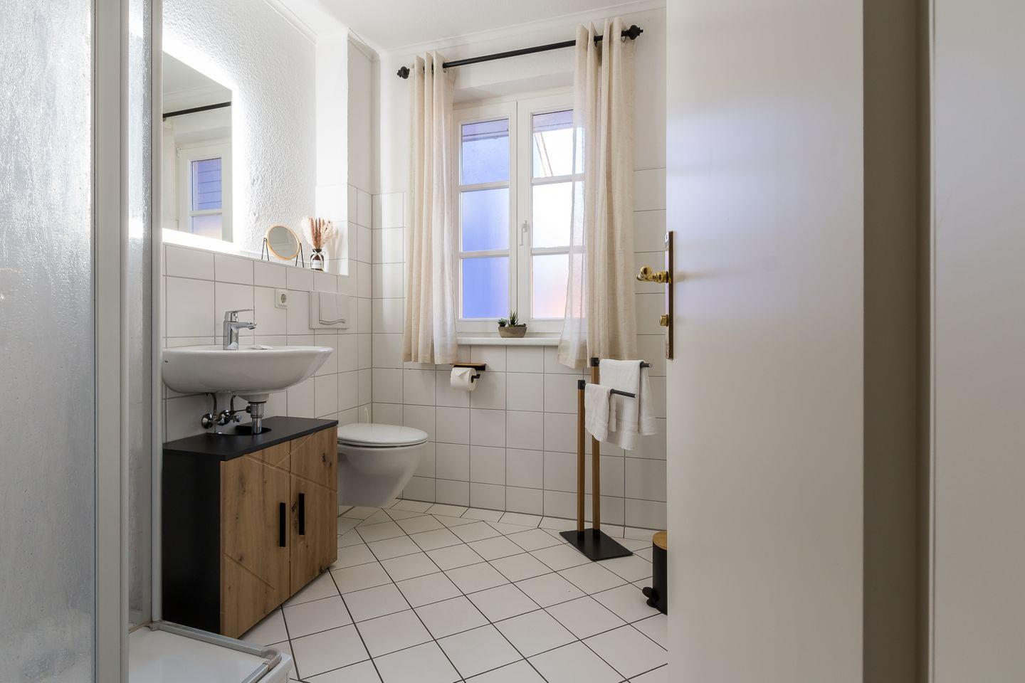 Die kleine Terrasse mit Nord-Ausrichtung bietet dir einen Blick ins Grüne. Ein abschließbarer Fahrradschuppen und ein PKW-Stellplatz (Nr. 1) gehören ebenfalls zur Wohnung.