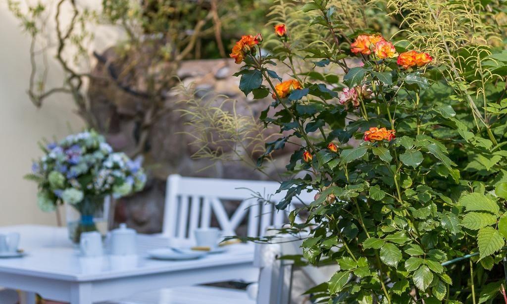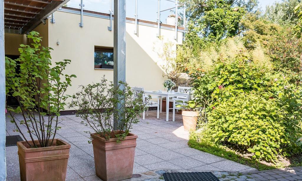 Zur Ferienwohnung gehört eine kleine und windgeschützte Terrasse sowie ein PKW-Stellplatz. Der Garten kann gemeinschaftlich genutzt werden.