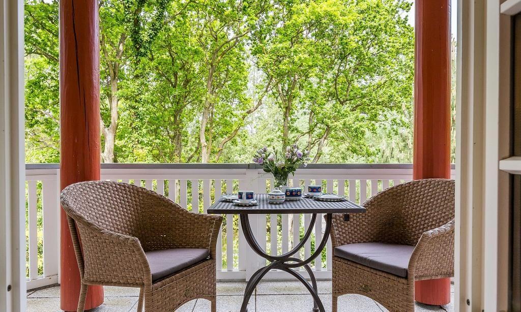 Der überdachte Balkon mit Blick auf das parkähnliche Grundstück und die bewaldeten Stranddünen verspricht dir entspannte und gesellige Stunden und machen den Wohnkomfort perfekt. Dir stehen zwei PKW-Stellplätze zur Verfügung.