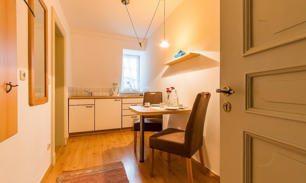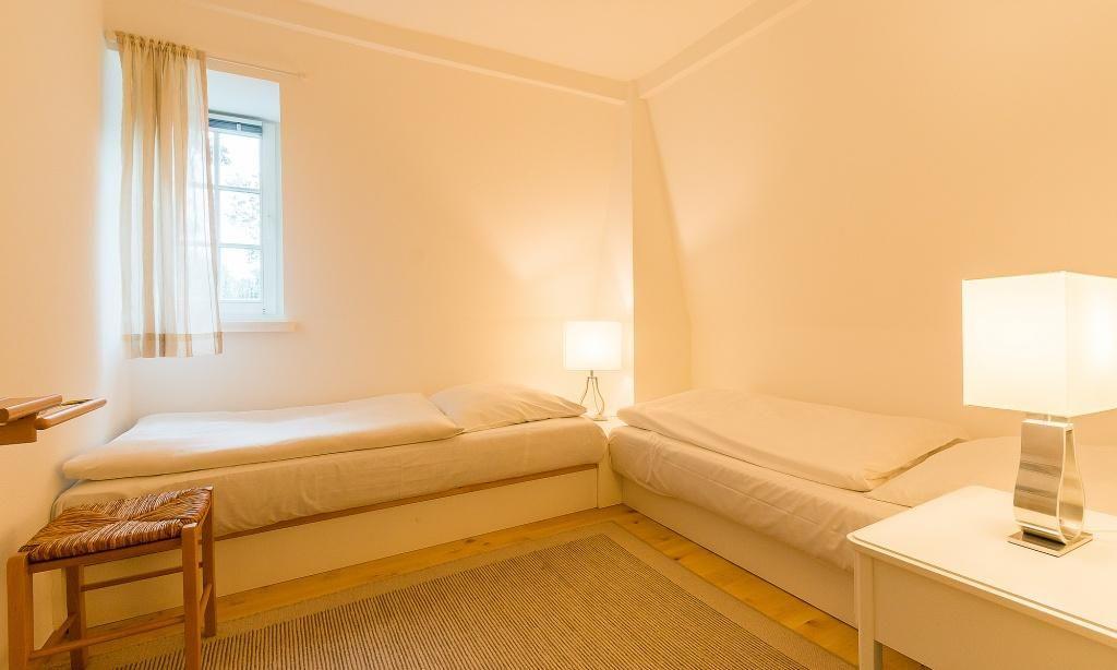 Der helle und freundliche Wohnraum empfängt seine Gäste mit einer gemütlichen Sitzecke und TV Bereich. Auch die kleine Küche mit Essplatz ist gut ausgestattet und bietet alles, was es zum Kochen im Urlaub braucht. Eine Tür weiter geht es ins Schlafzimmer, das mit zwei Einzelbetten (nicht zusammenstellbar) ausgestattet ist. Das Tageslicht-Bad verfügt über Dusche/WC.