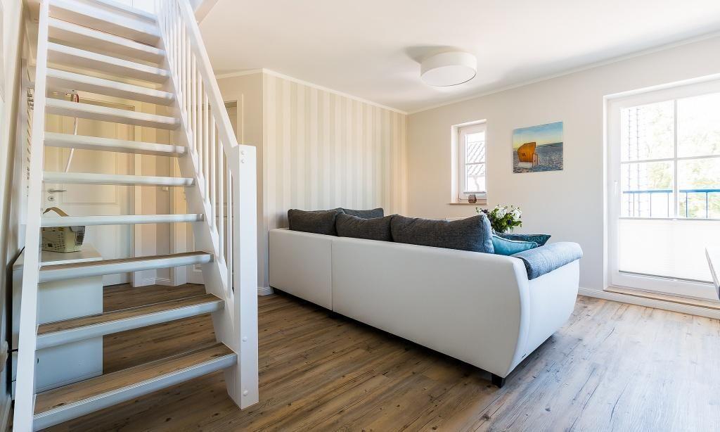 In der Maisonette-Wohnung erwartet dich ein gemütlicher Wohnbereich mit TV- und Essbereich. Die offene Küche ist modern und funktional ausgestattet. Ein Schlafzimmer mit einem Doppelbett und ein ansprechendes Bad mit Dusche/WC befinden sich ebenfalls im ersten Obergeschoss. Vom Wohnbereich gelangst du über eine Treppe ins Dachgeschoss. Hier liegt das zweite Schlafzimmer, welches ebenfalls mit einem Doppelbett und einem zweiten TV-Gerät ausgestattet ist. Die gesamte Wohnung ist liebevoll und harmonischen Farben eingerichtet. Der Seaside-Stil passt perfekt zur strandnahen Lage. Das ist Urlaubs-Feeling pur.