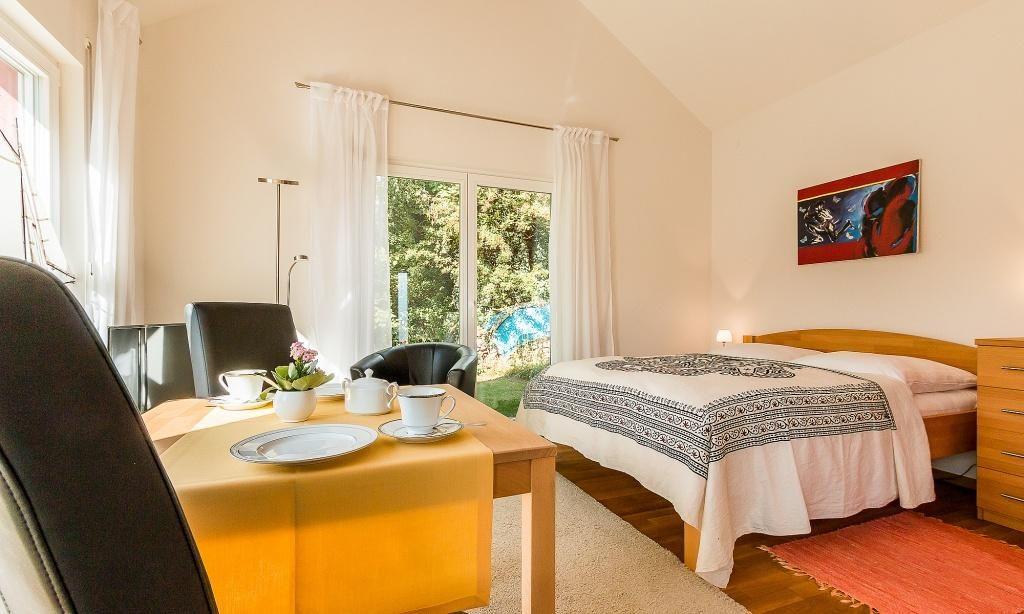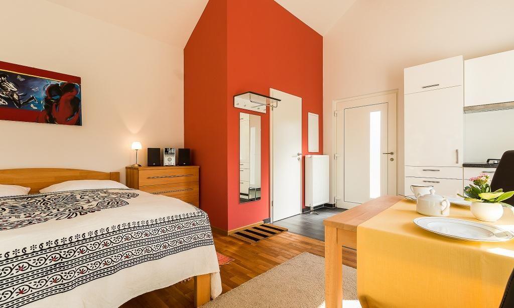 Du betrittst den kombinierten Wohn- und Schlafraum. Ein Doppelbett (160 cm), eine TV-Ecke mit einem 32 Zoll TV und ein Esstisch erwarten dich hier in gemütlichem Ambiente. Die Küchenzeile ist unter anderem mit einem 2 Flammen-Gasherd, einem Geschirrspüler sowie einem Kühlschrank mit Gefrierfach und einem Toaster mit Grillfunktion ausgestattet. Ein Bad mit Dusche/WC befindet sich separat.
