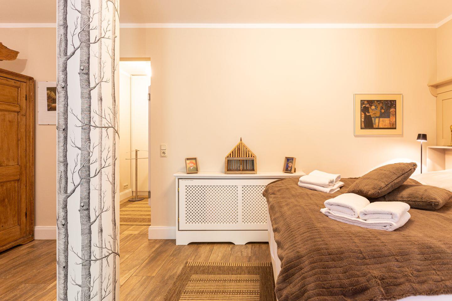 Die schicke Wohnung befindet sich im Erdgeschoss und bietet genügend Platz für zwei Personen. Liebevoll eingerichtet, begeistert die Wohnung auch mit einer in 2022 aktuellen Modernisierung. Der Wohnbereich ist das Herzstück der Ferienwohnung mit seiner modernen Sitzecke und der offenen Küchenzeile. Die Dekoelemente sind allesamt ausgewählt und passen harmonisch mit dem Interieur zusammen. Besonders ist auch die Dusche, die als halboffene, verglaste Variante in den Schlafbereich integriert wurde. Das Bad mit WC befindet sich separat. Herrlich träumen lässt es sich auch in dem Schlafbereich mit hochwertigem Boxspringbett, der optisch etwas abgetrennt vom Wohnbereich ist. In Holzdielenoptik aber gefliest bietet der Boden zudem einen sehr wertigen Belag.