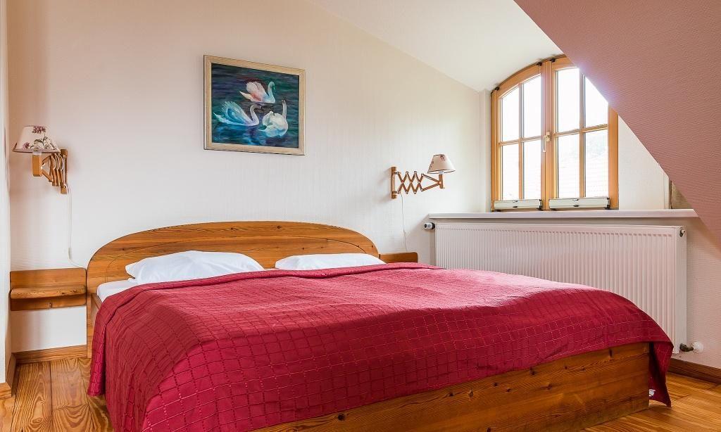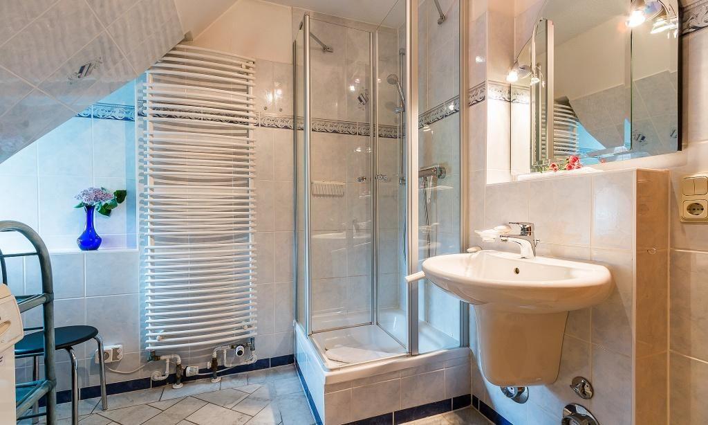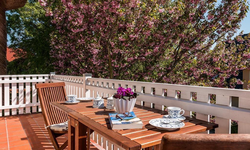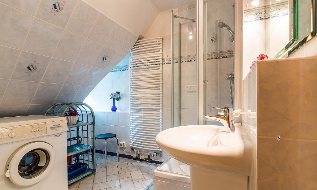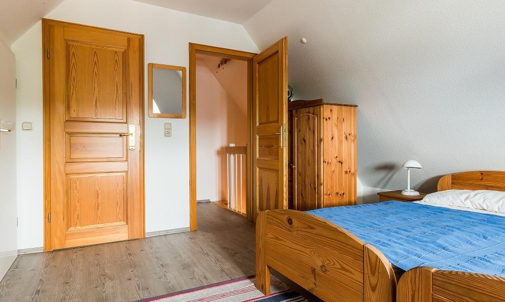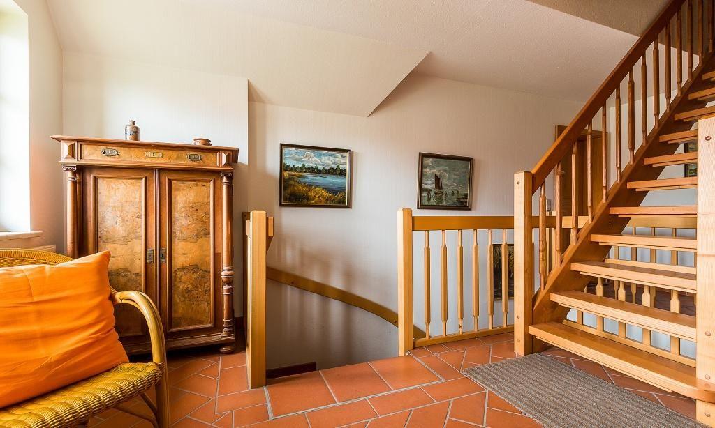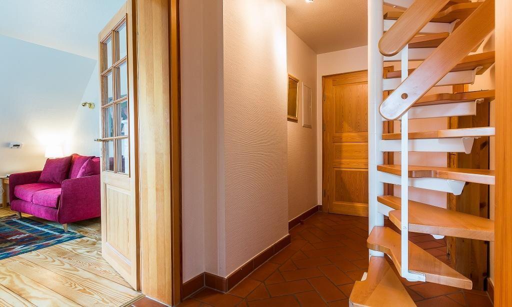 Das Urlaubsdomizil befindet sich im 1. Obergeschoss des Ahrenshooper Landhauses. Der offene Wohn- und Küchenbereich begeistert mit seinem urigen Kachelofen, der für eine gemütliche Wohnatmosphäre sorgt. In der Wohnküche mit angrenzendem Esstisch kannst du nach Herzenslust kochen und klönen. Des Weiteren erwartet dich ein Schlafzimmer mit einem Doppelbett, ein Bad mit Dusche/WC, Handtuchtrockner und einer Waschmaschine. Vom Wohnbereich und Schlafzimmer aus gelangst du auf den herrlichen Balkon in Ost-Ausrichtung. Hier kannst du dein Frühstück mit Blick über die benachbarten Dächer hinweg bis zum Bodden genießen. Über eine Raumspartreppe im Flur gelangst du ins Dachgeschoss, in dem ein zweites offenes Schlafzimmer mit Doppelbett untergebracht ist. Wenn dir die Raumspartreppe zu steil ist, hast du die Möglichkeit das Dachgeschoss auch über den Hausflur zu erreichen.