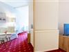 Das gemütliche Einraum-Appartement ist passend zum Strand mit Holz und hellen Farben eingerichtet. Im Wohn- und Schlafraum befinden sich eine kleine Sitzgelegenheit, ein Doppelbett, eine Miniküche und ein Esstisch an bodentiefen Fenstern. Das separate Bad mit Dusche/ WC schließt sich dem Wohnraum an.