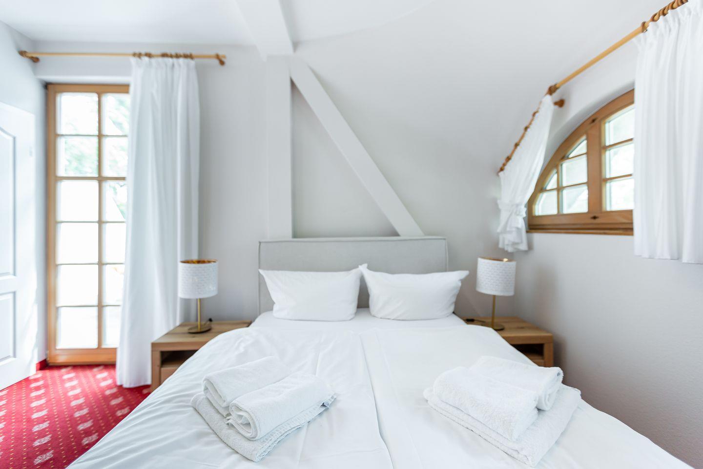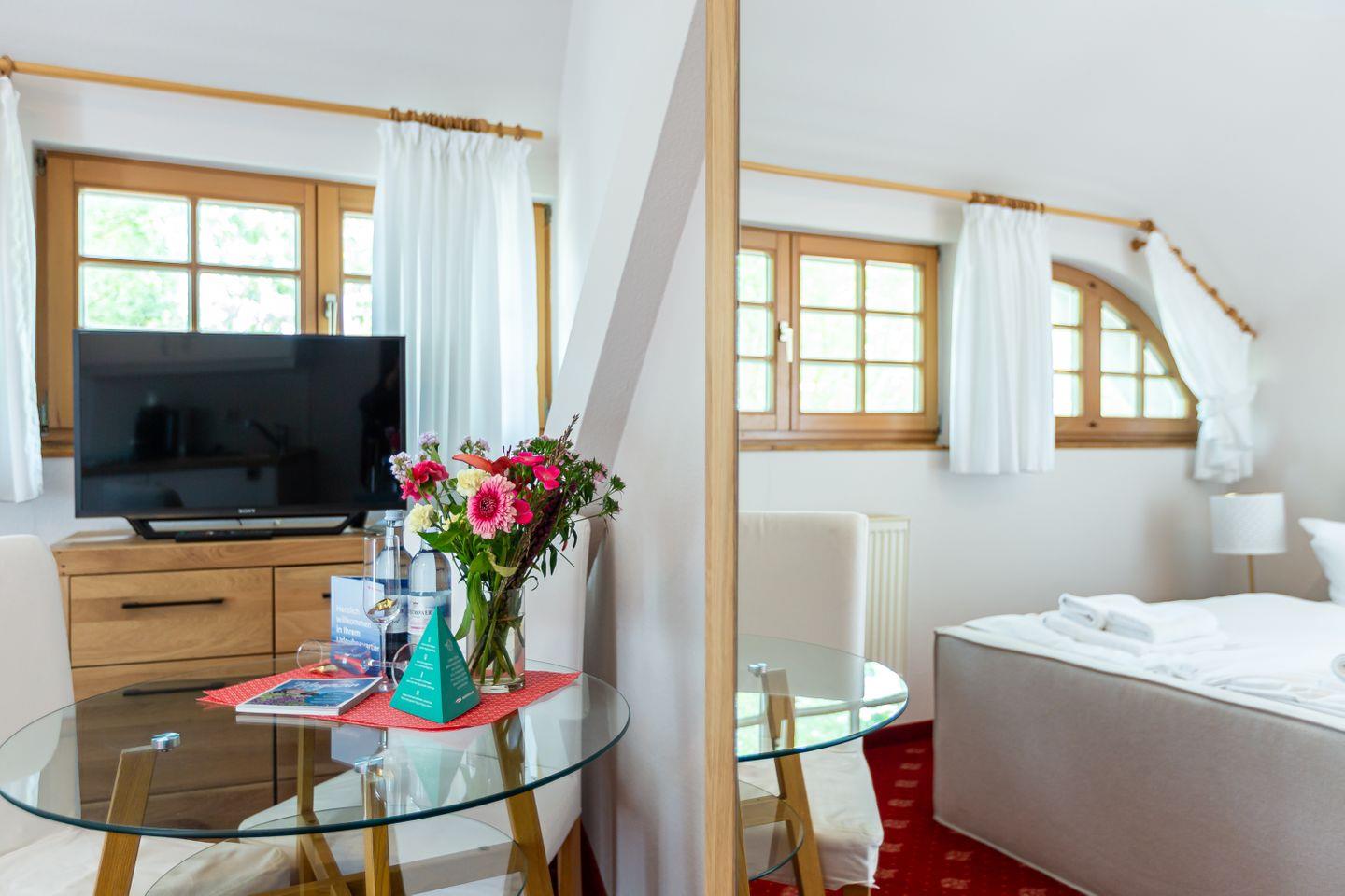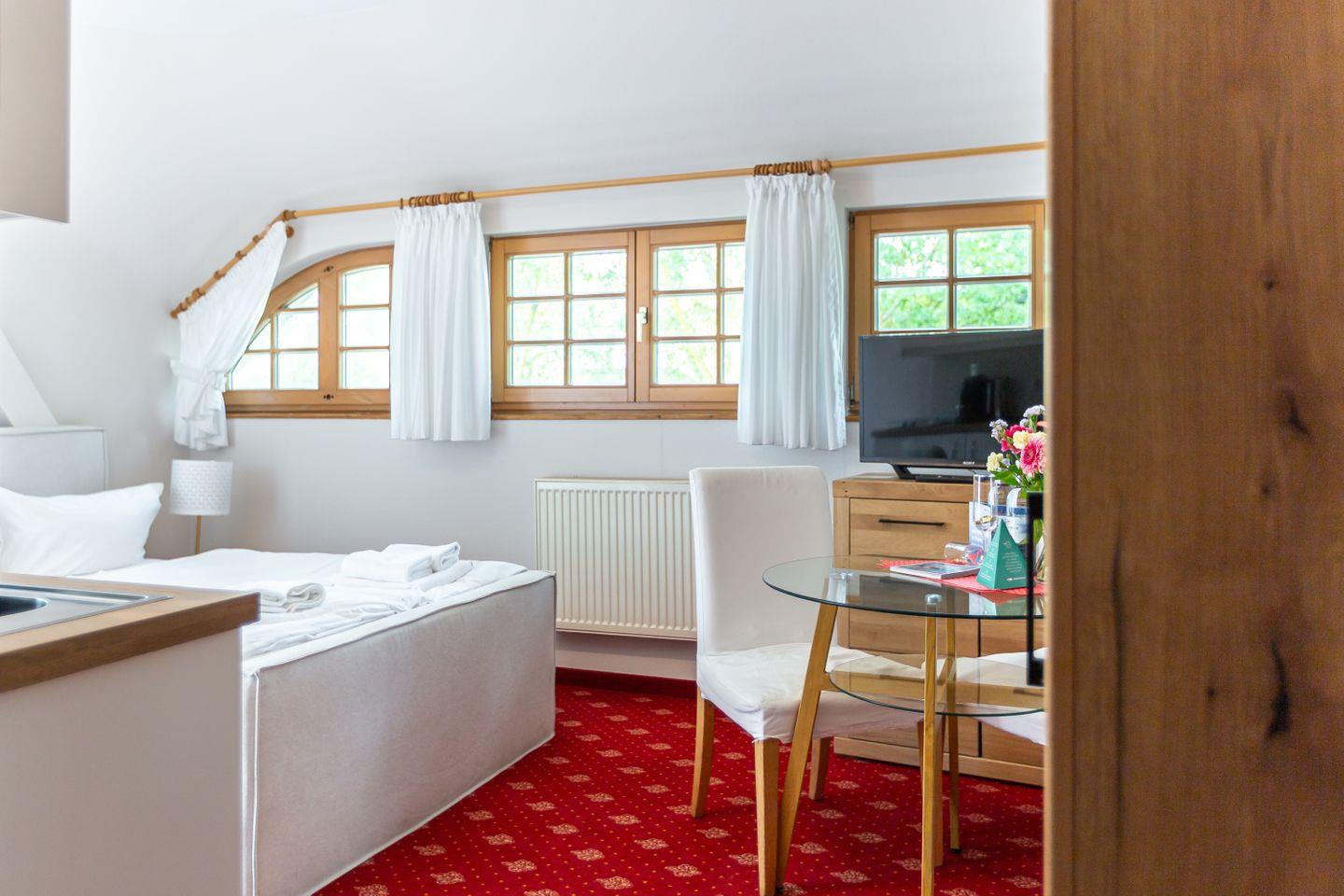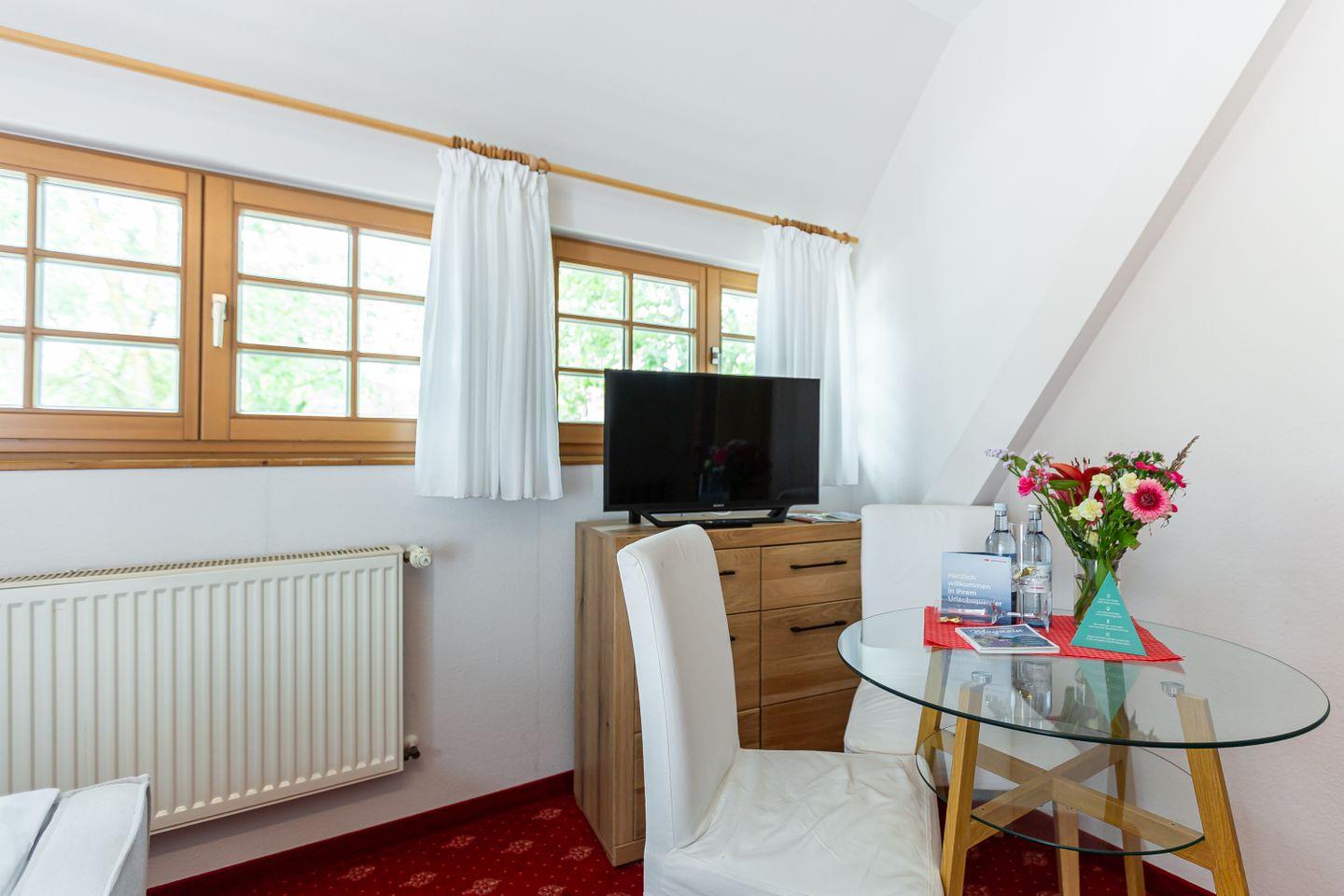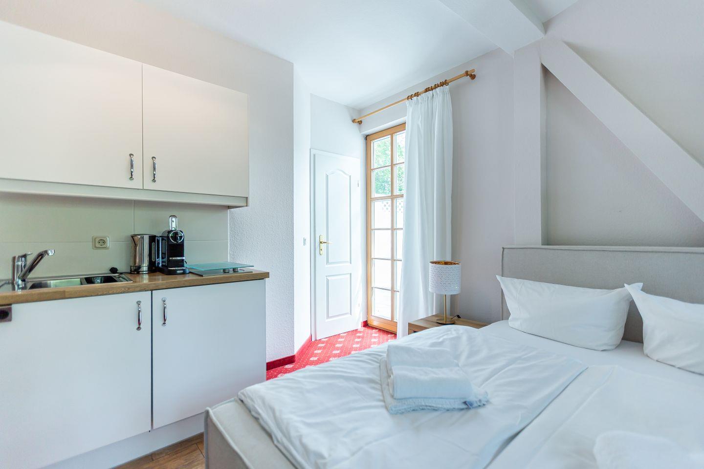 Das gemütliche Einraum-Appartement im ersten Stock ist passend zum Strand mit Holz und hellen Farben eingerichtet. Im Wohn- und Schlafraum befinden sich eine kleine Sitzgelegenheit, ein Doppelbett (140 cm), eine Miniküche und ein Esstisch an bodentiefen Fenstern. Das separate Bad ist mit Dusche/WC ausgestattet.
