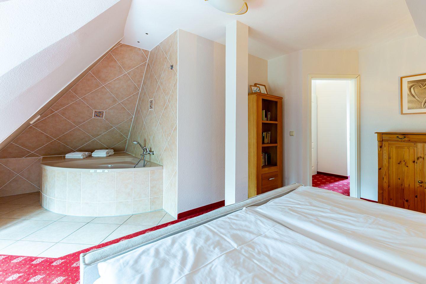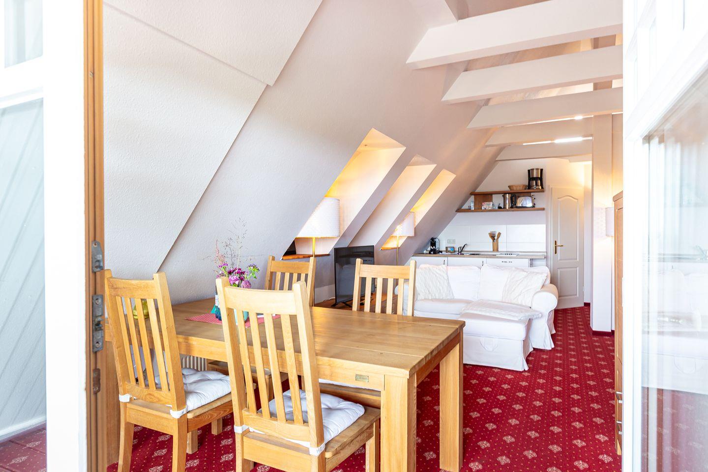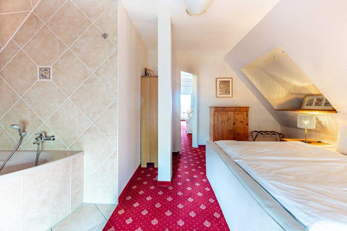 Die Ferienwohnung liegt im Dachgeschoss des Hauses und begeistert durch einen wunderschönen Meerblick. Im Wohnraum befinden sich eine Sitzgelegenheit mit TV-Bereich, eine Miniküche und ein Esstisch. Das Hauptschlafzimmer bietet neben dem Doppelbett die Besonderheit, dass die Eckbadewanne hier integriert wurde. Ein kleines Bad mit Waschbecken und Toilette befindet sich separat. Ein kleines zweites Schlafzimmer mit einem Einzelbett runden die Ferienwohnung ab.