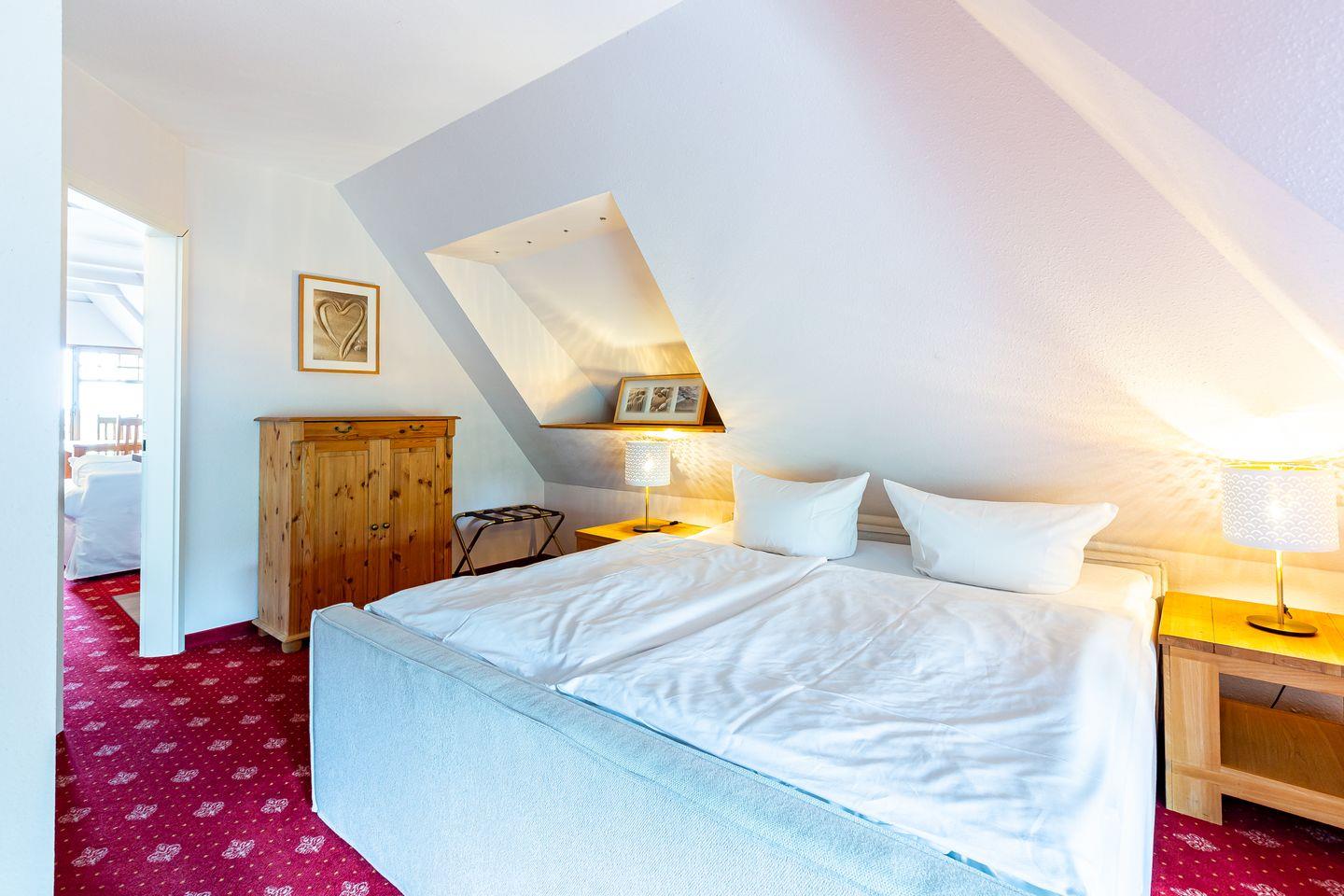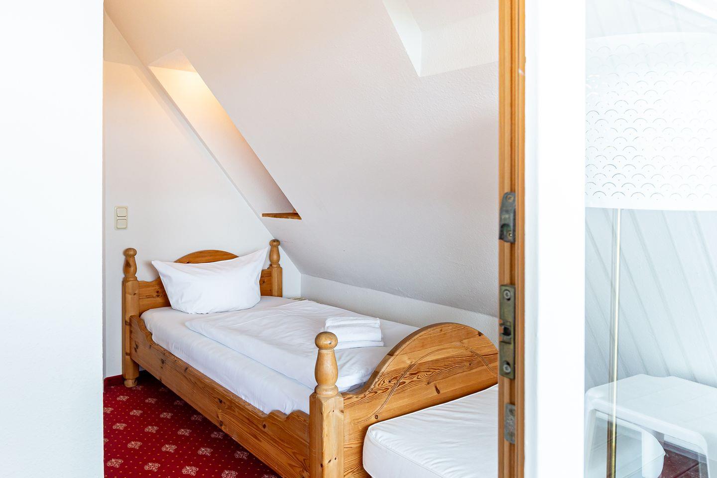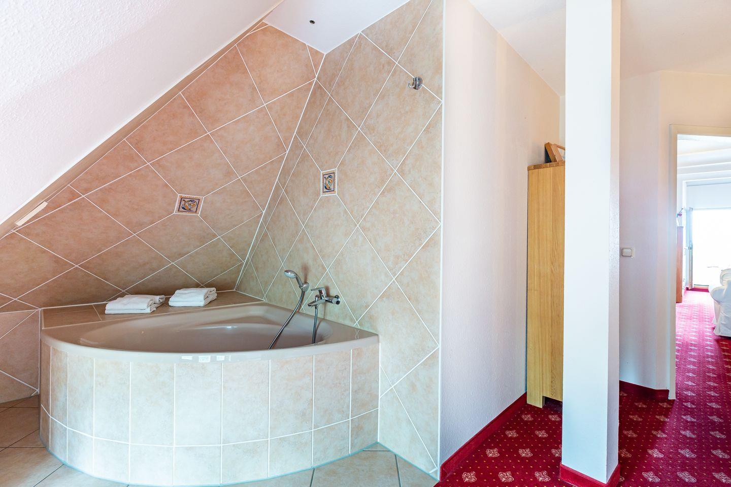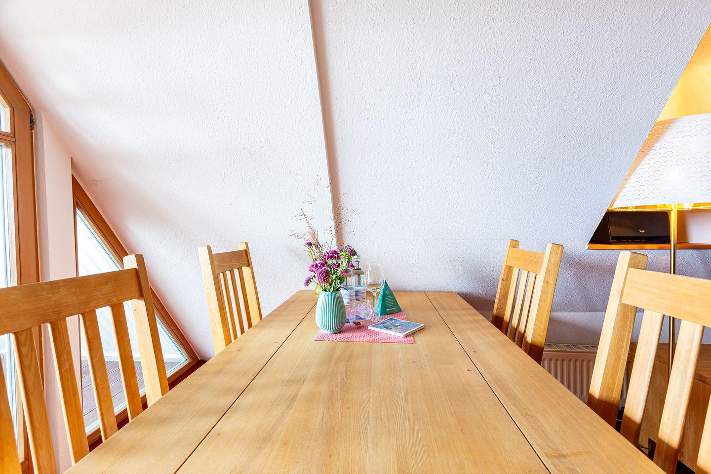 Die Ferienwohnung liegt im Dachgeschoss des Hauses und begeistert durch einen wunderschönen Meerblick. Im Wohnraum befinden sich eine Sitzgelegenheit mit TV-Bereich, eine Miniküche und ein Esstisch. Das Hauptschlafzimmer bietet neben dem Doppelbett die Besonderheit, dass die Eckbadewanne hier integriert wurde. Ein kleines Bad mit Waschbecken und Toilette befindet sich separat. Ein kleines zweites Schlafzimmer mit einem Einzelbett runden die Ferienwohnung ab.