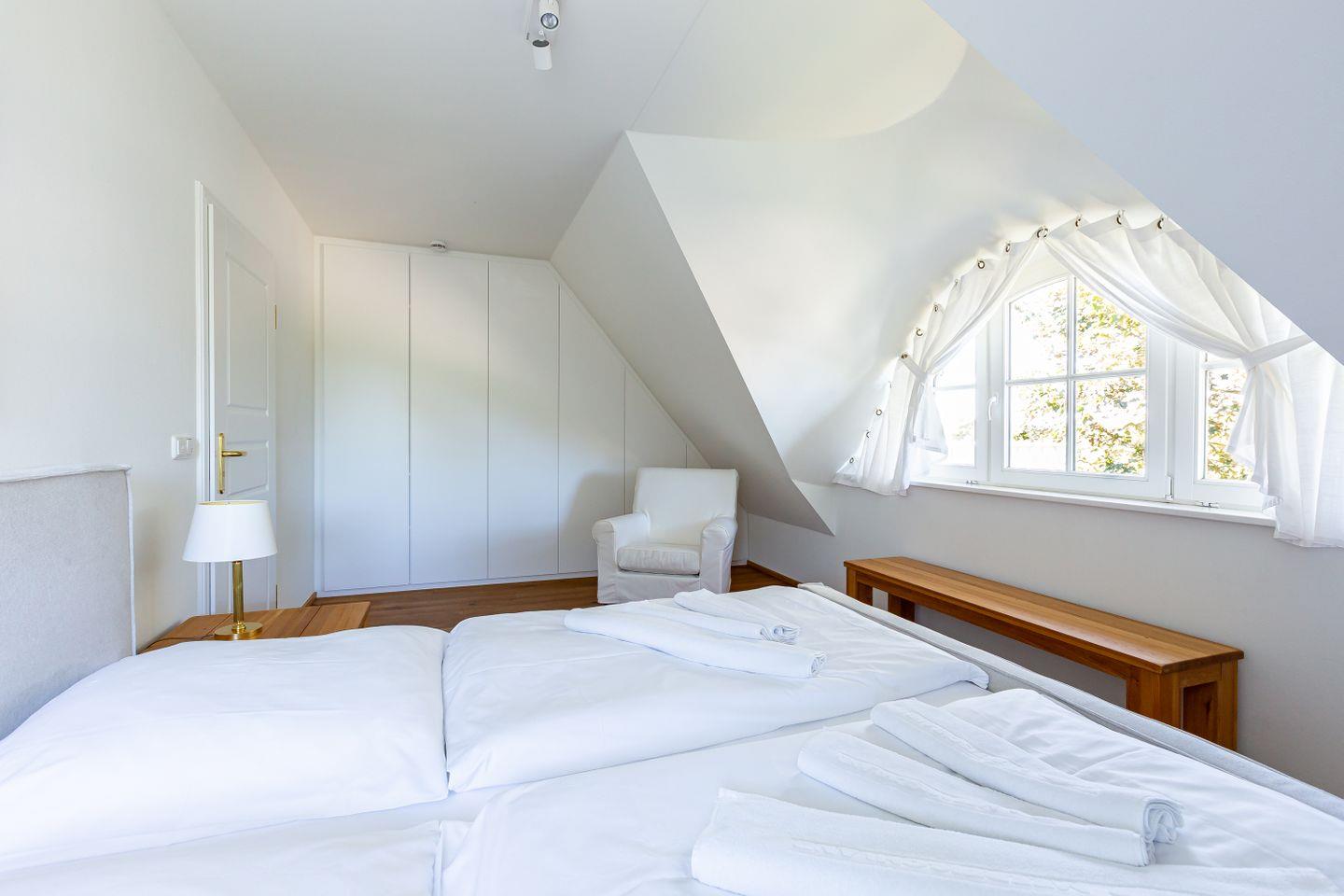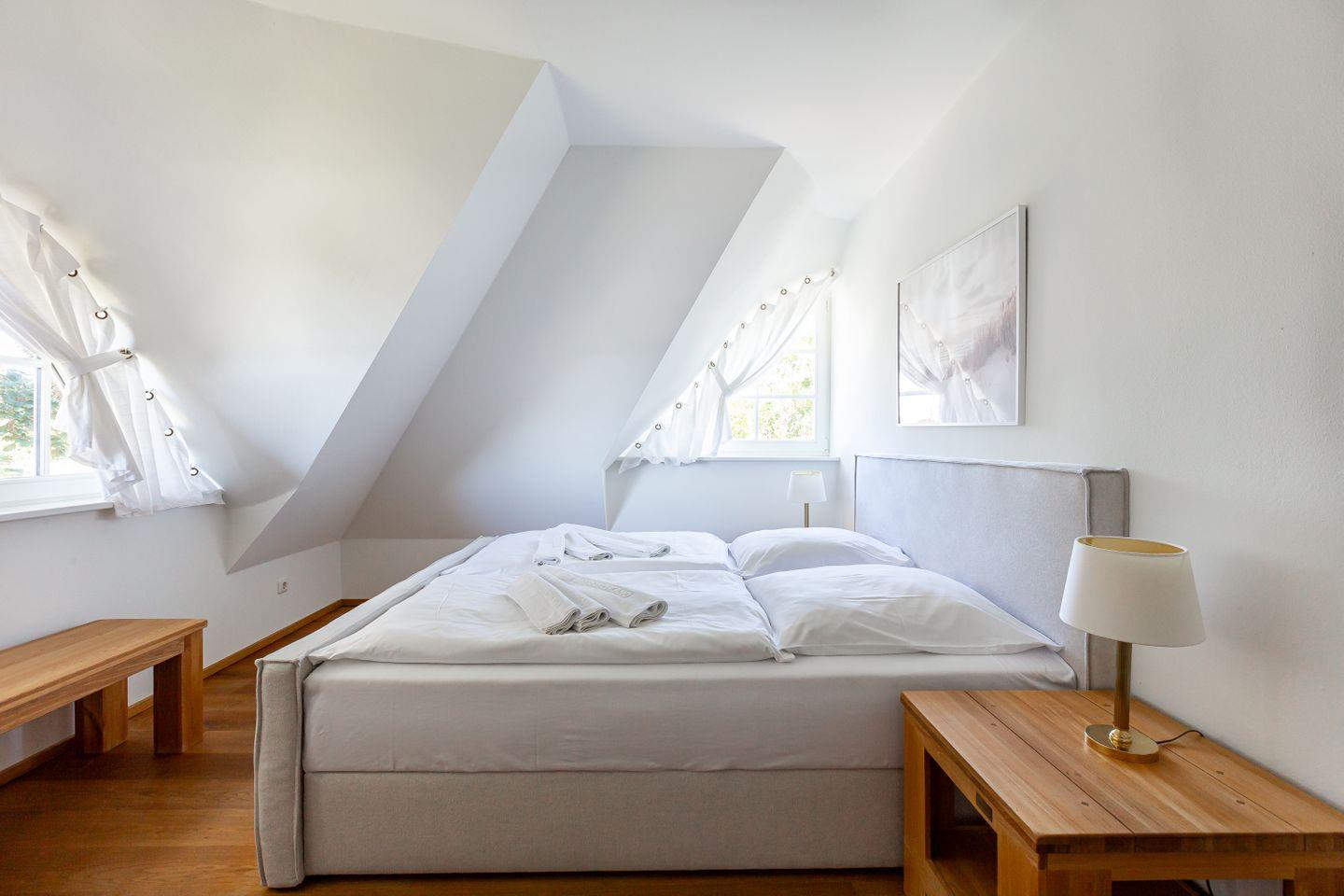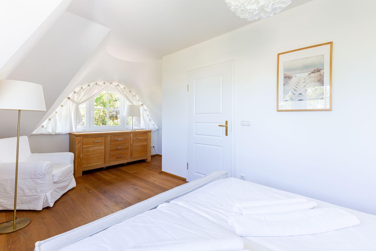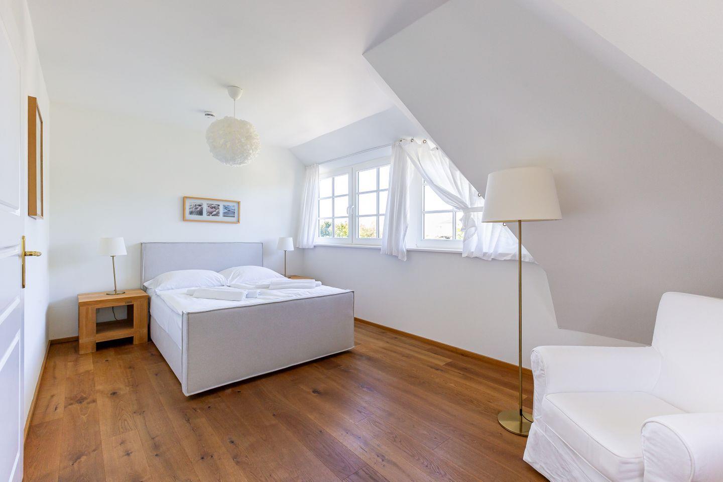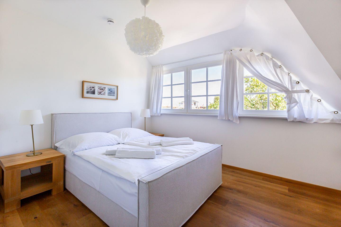 Diese Wohneinheit ist passend zur Umgebung im Seaside-Stil eingerichtet. Die weiße Farbe des Ostseestrandes und natürliche Materialien wie Holz setzen sich in allen Räumen fort. Im Erdgeschoss erwartet dich der lichtdurchflutete Wohnraum mit einer gemütlichen Sitzecke, einem großen Esstisch sowie einer Einbauküche, die den Mittelpunkt des Ferienhauses bilden. Auch ein Gästebad mit Dusche/WC sowie ein kleiner Abstellraum befinden sich auf der unteren Etage. Im Obergeschoss liegen zwei Schlafzimmer, die jeweils mit einem Doppelbett (180 cm und 140 cm breit) ausgestattet sind. Direkt an das luxuriöse Bad mit Dusche/WC schließt sich die großzügige Dachterrasse mit zwei Sonnenliegen und Ost-Ausrichtung an. Hier kannst du bereits die Morgensonne genießen und mit einem herrlichen Frühstück in den Tag starten.
