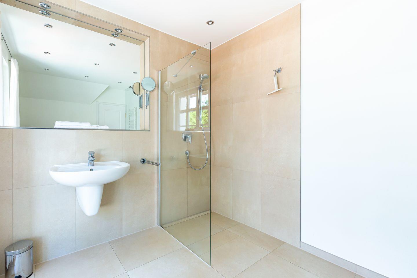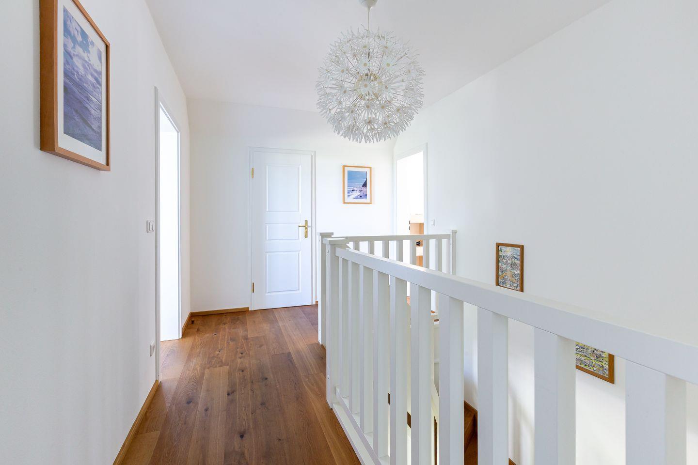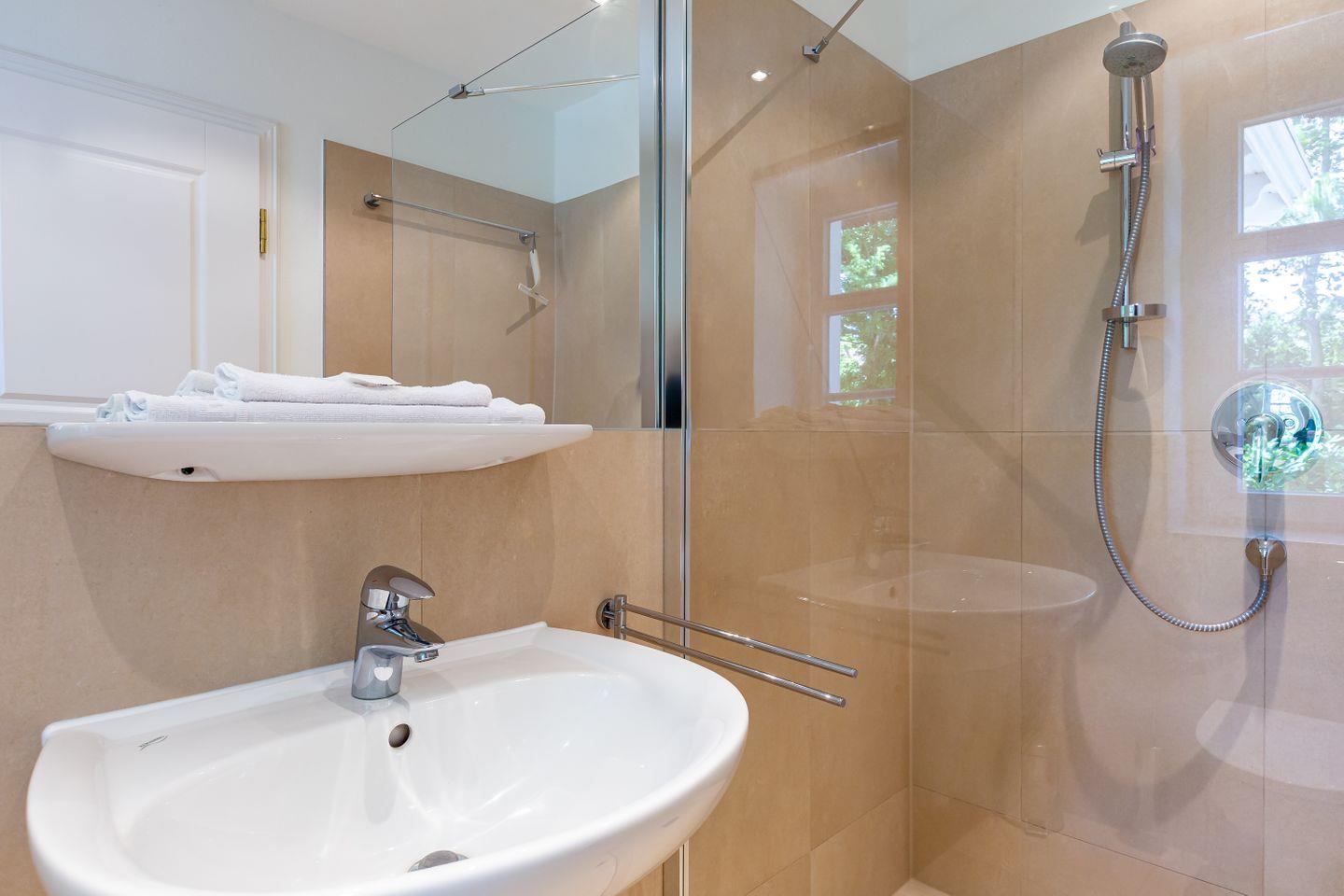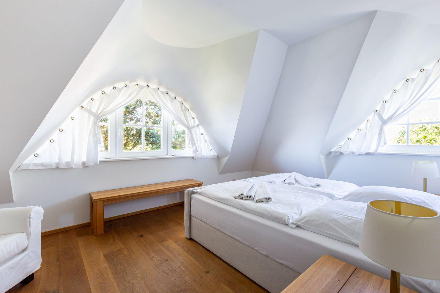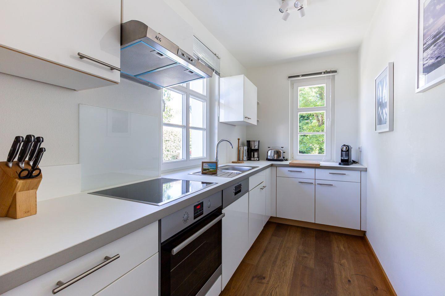 Diese Wohneinheit ist passend zur Umgebung im Seaside-Stil eingerichtet. Die weiße Farbe des Ostseestrandes und natürliche Materialien wie Holz setzen sich in allen Räumen fort. Im Erdgeschoss erwartet dich der lichtdurchflutete Wohnraum mit einer gemütlichen Sitzecke, einem großen Esstisch sowie einer Einbauküche, die den Mittelpunkt des Ferienhauses bilden. Auch ein Gästebad mit Dusche/WC sowie ein kleiner Abstellraum befinden sich auf der unteren Etage. Im Obergeschoss liegen zwei Schlafzimmer, die jeweils mit einem Doppelbett (180 cm und 140 cm breit) ausgestattet sind. Direkt an das luxuriöse Bad mit Dusche/WC schließt sich die großzügige Dachterrasse mit zwei Sonnenliegen und Ost-Ausrichtung an. Hier kannst du bereits die Morgensonne genießen und mit einem herrlichen Frühstück in den Tag starten.
