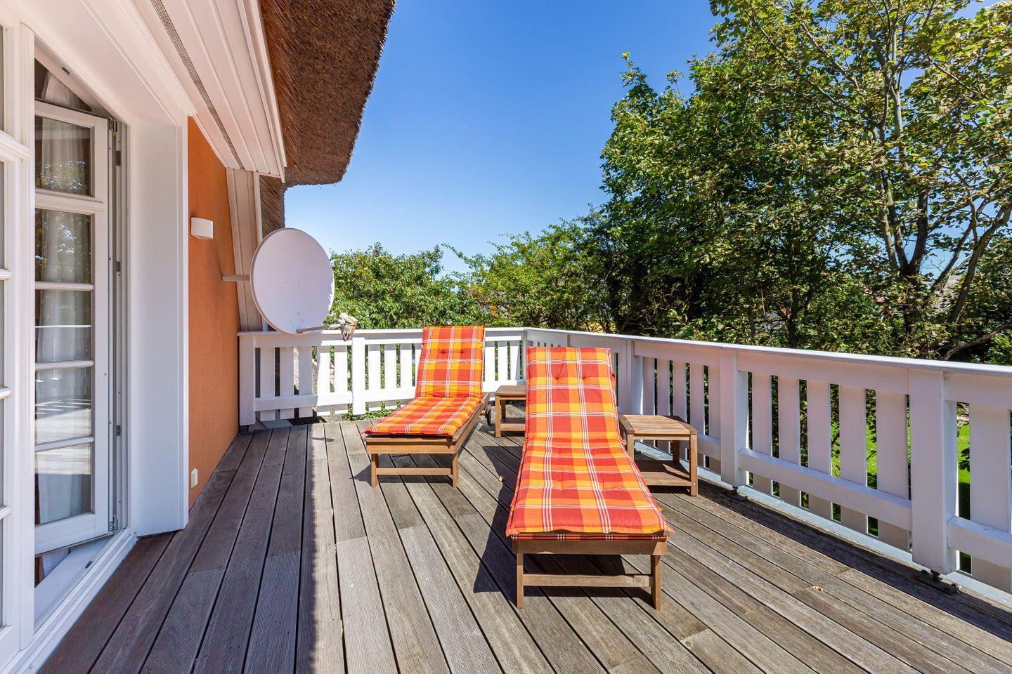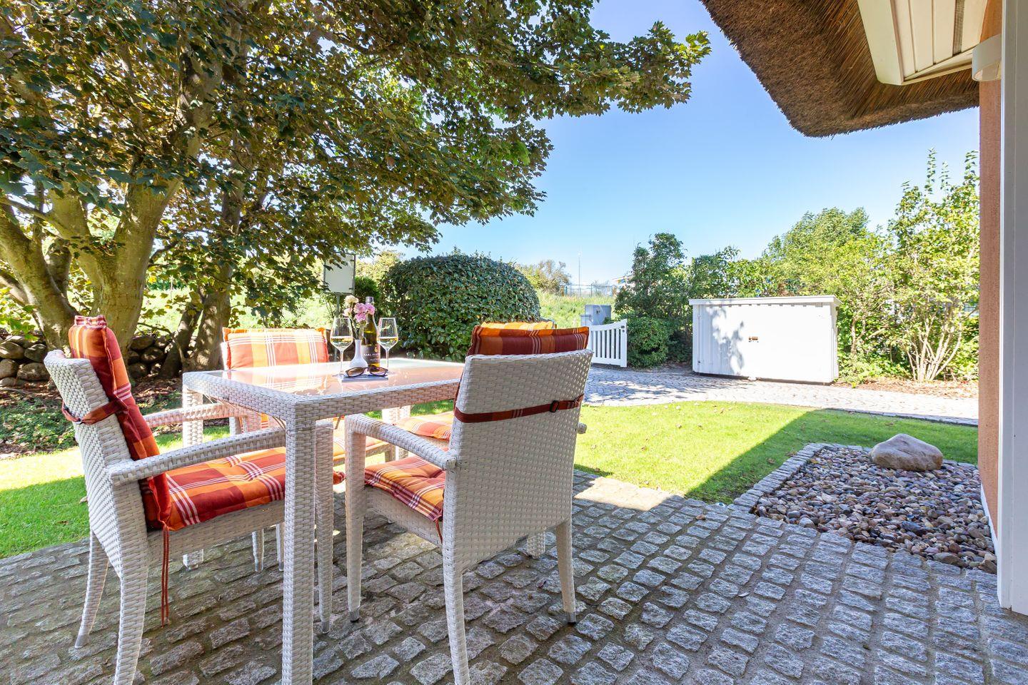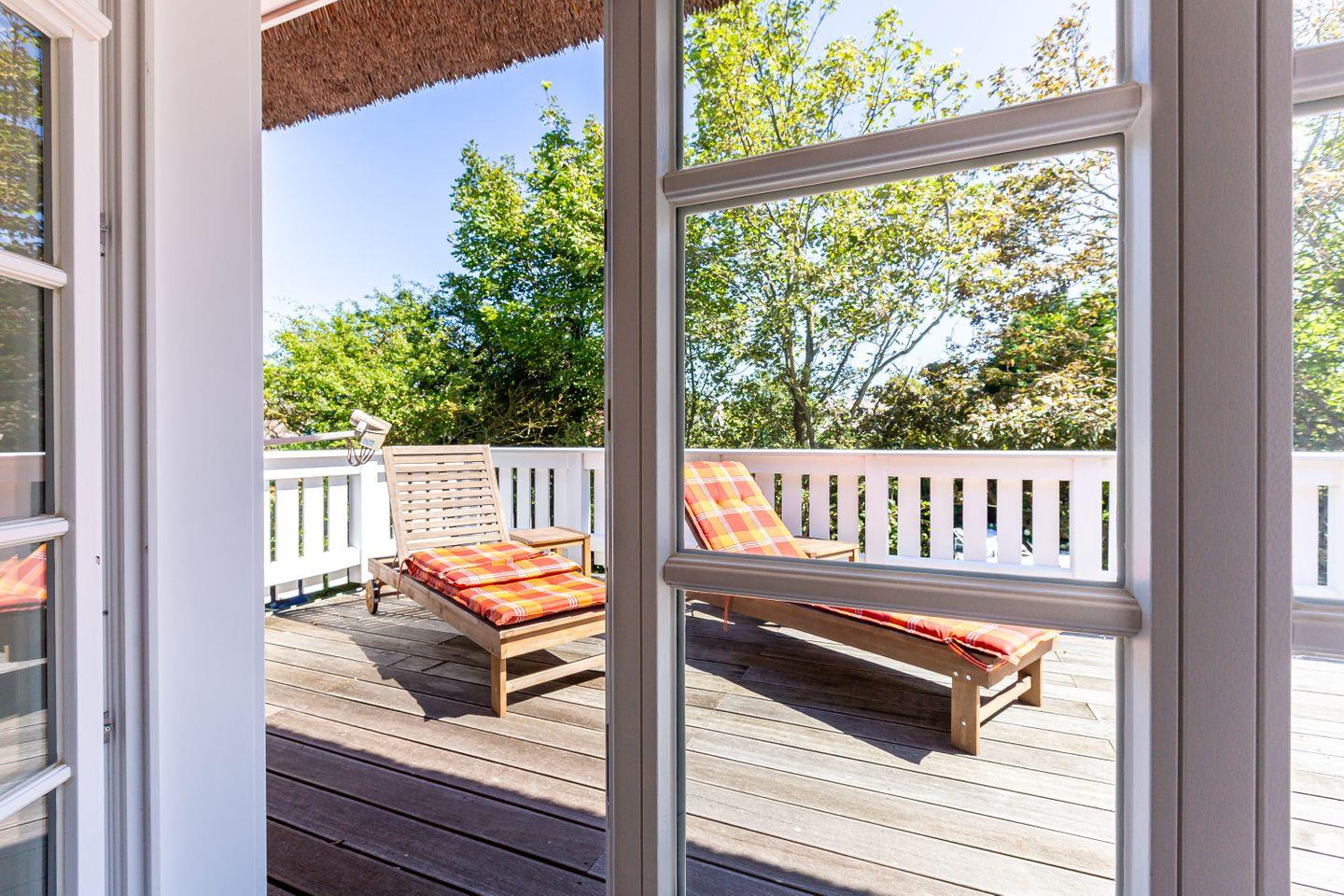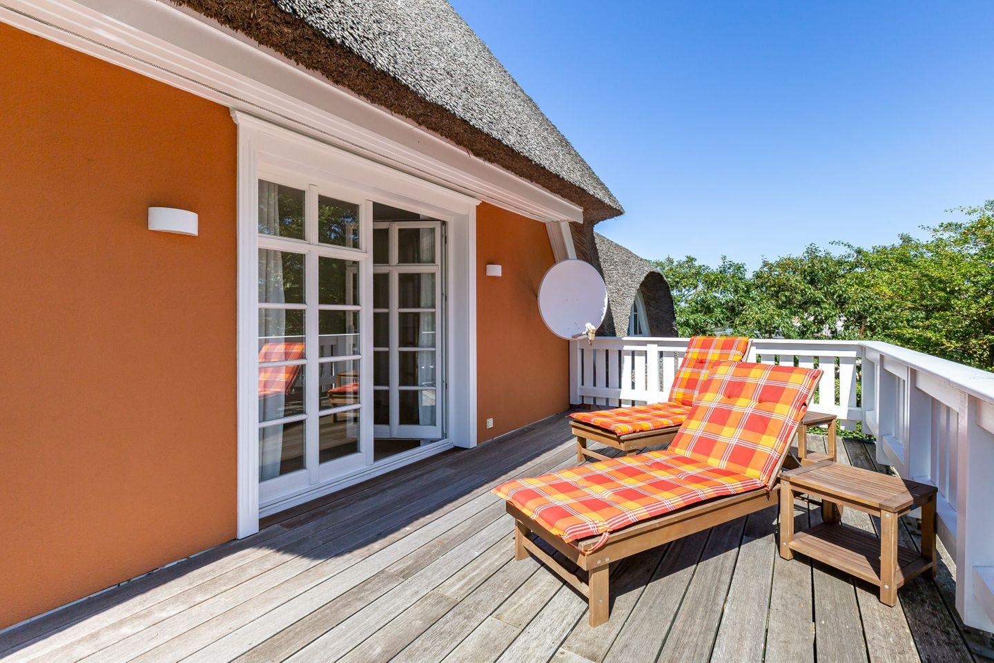 Eine Terrasse schließt sich direkt an den Wohnbereich an und liegt seeseitig in West-Ausrichtung. Hier, wo du das Meer rauschen und die Möwen schreien hörst, stellt sich das Urlaubs-Feeling sofort ein.