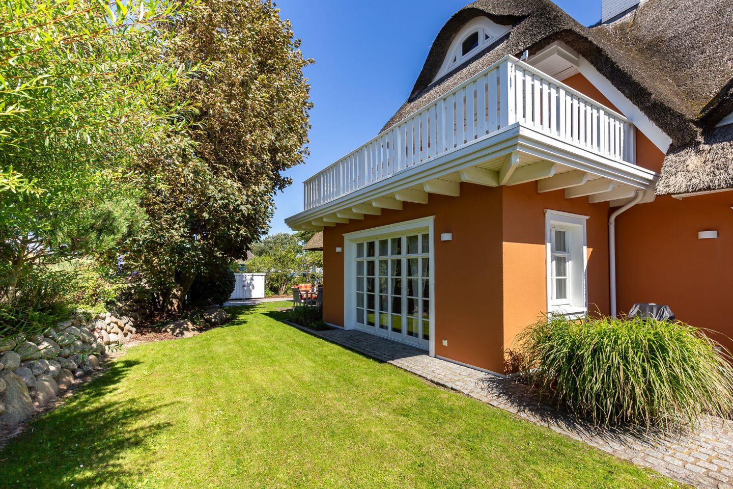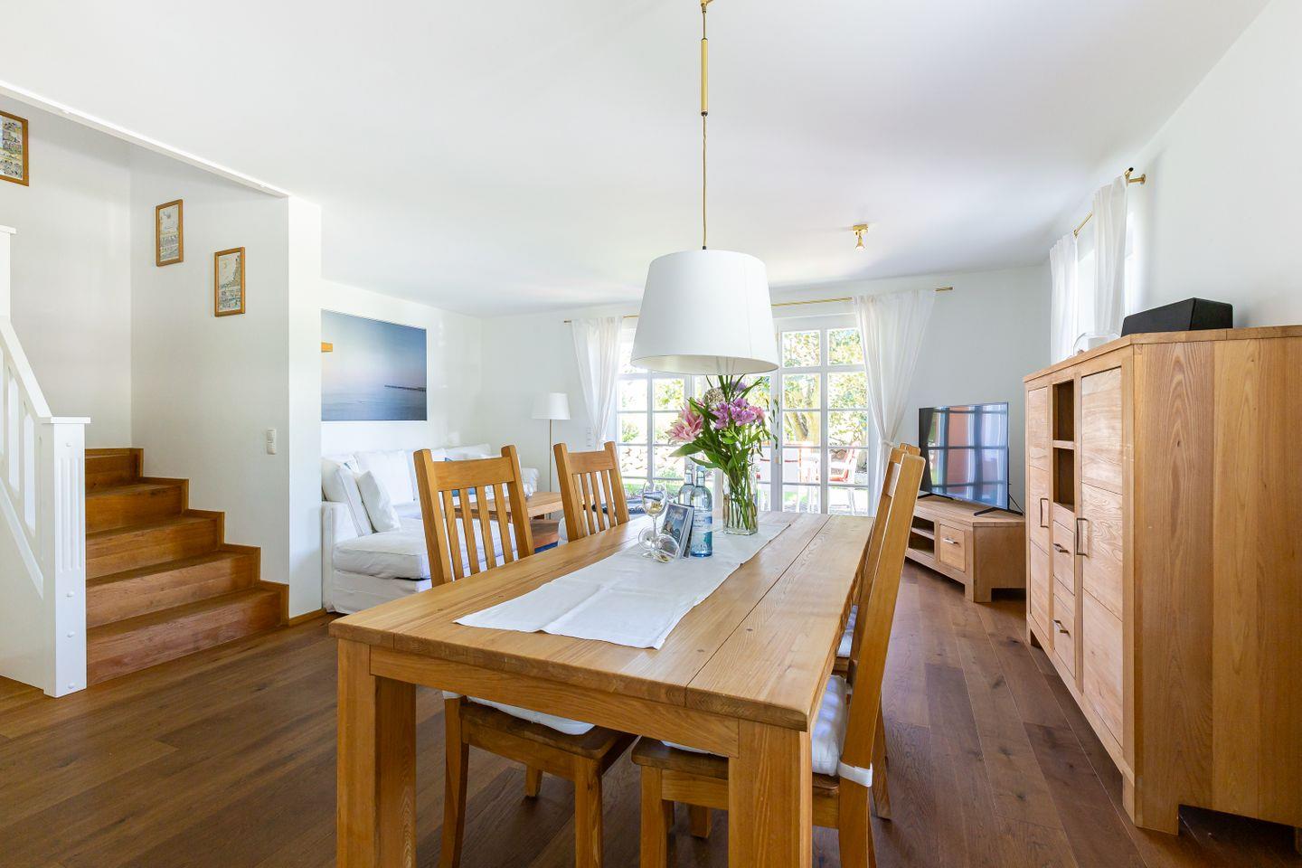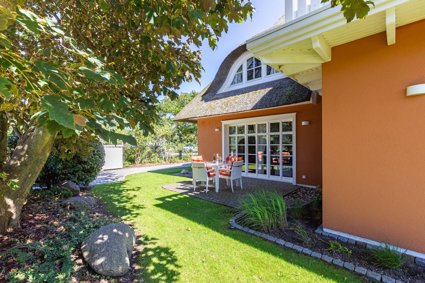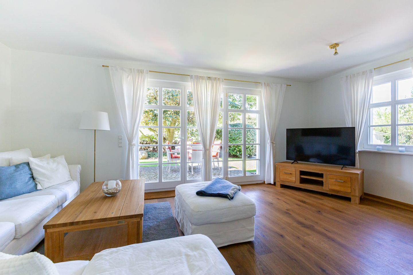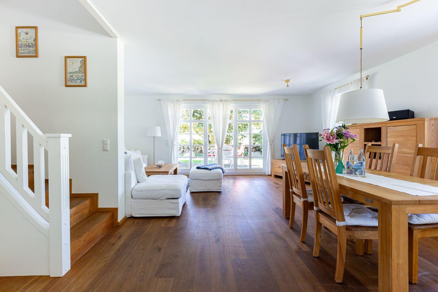 Eine Terrasse schließt sich direkt an den Wohnbereich an und liegt seeseitig in West-Ausrichtung. Hier, wo du das Meer rauschen und die Möwen schreien hörst, stellt sich das Urlaubs-Feeling sofort ein.