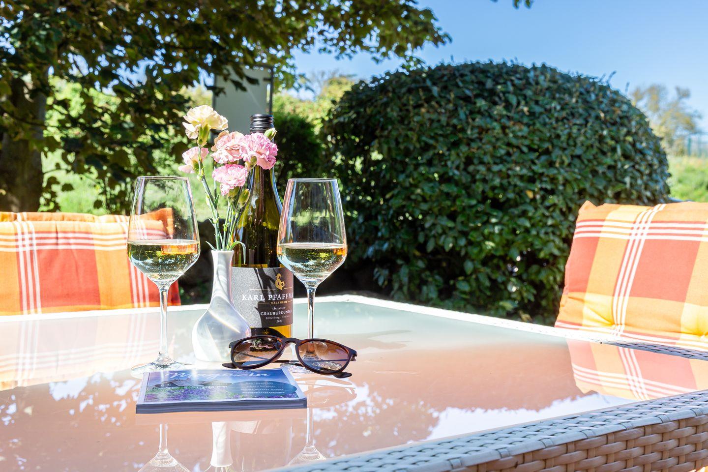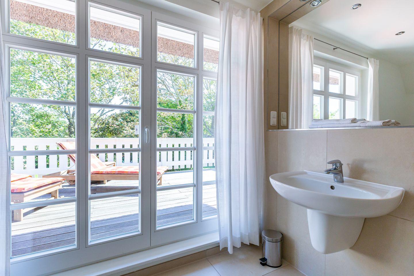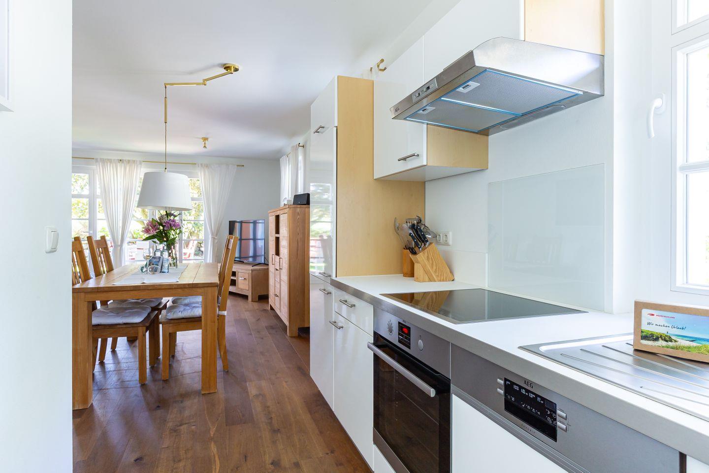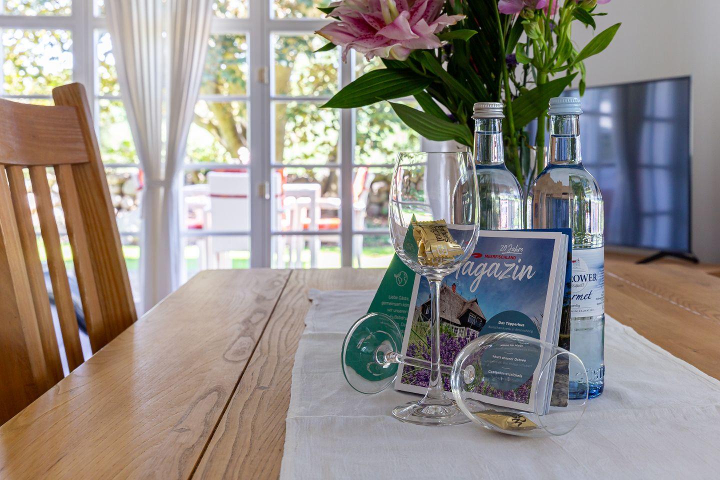 Eine Terrasse schließt sich direkt an den Wohnbereich an und liegt seeseitig in West-Ausrichtung. Hier, wo du das Meer rauschen und die Möwen schreien hörst, stellt sich das Urlaubs-Feeling sofort ein.