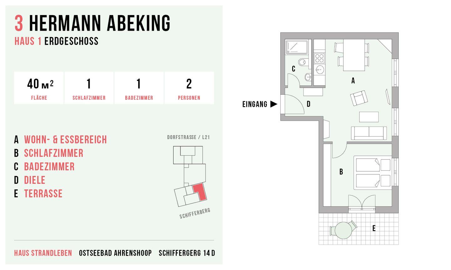 Die Hausanlage mit 13 Ferienwohnungen liegt nur 150 Meter vom weißen Ostseestrand entfernt und befindet sich direkt an der Bäderstraße L21. Neben der strandnahen Lage ist auch der Ortskern mit Bäckereien und einer Vielzahl von Restaurants, Cafés und Kunstgalerien nur ca. einen Kilometer entfernt. Der angrenzende Deich eignet sich perfekt für Wanderungen oder Radtouren in den Nationalpark, zum Weststrand und entlang der weiten Boddenlandschaft.