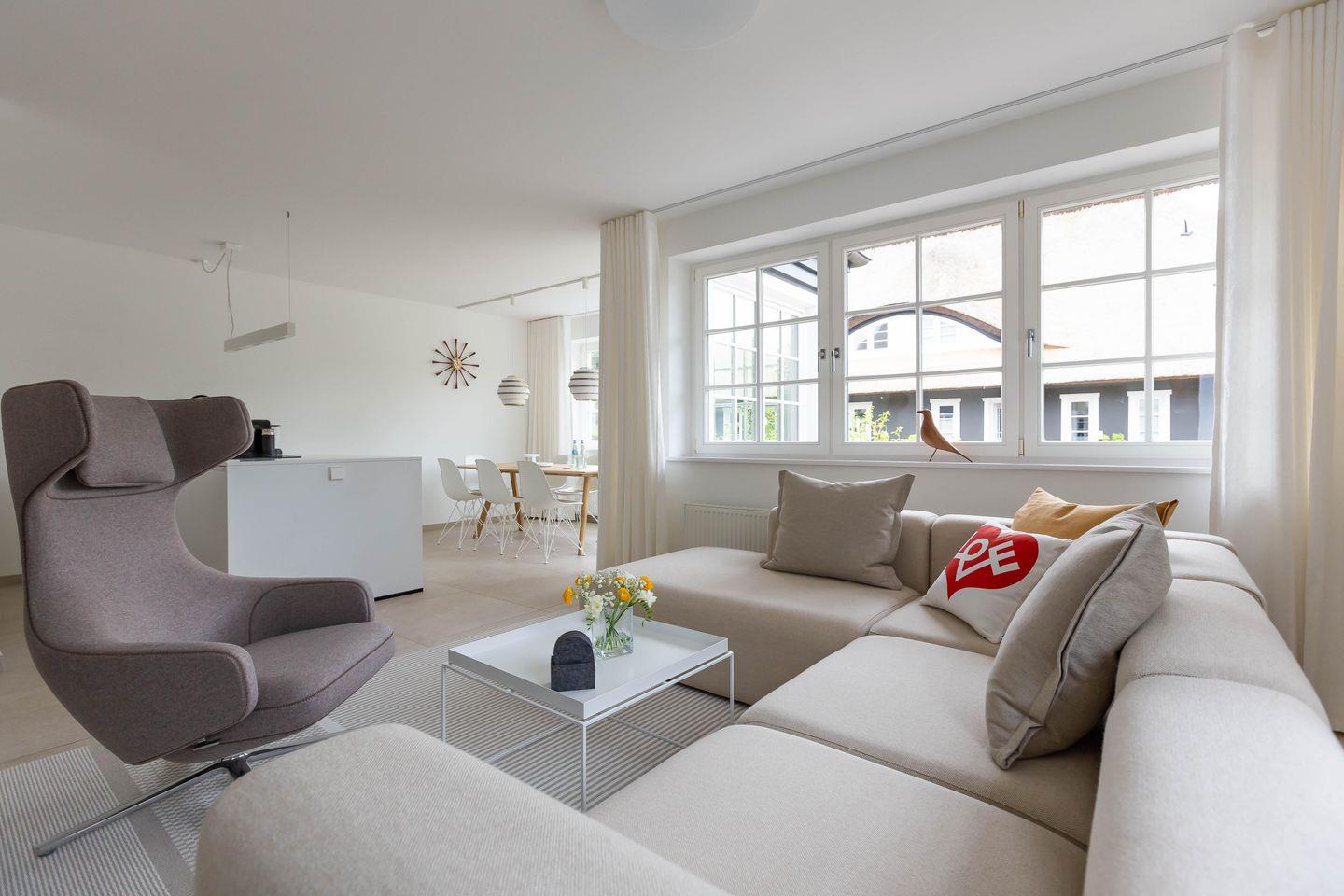 Eine großzügige Terrasse im Außenbereich lässt sich durch den Wohnraum betreten. Dabei sorgt die liebevoll gestaltete Gartenarchitektur für ausreichend Privatsphäre, so dass du dich auch unter freiem Himmel entspannen kannst. Dir stehen zudem zwei PKW-Stellplätze und ein gemeinschaftlich genutzter Grillplatz im hinteren Bereich des weitläufigen Gartens zur Verfügung.