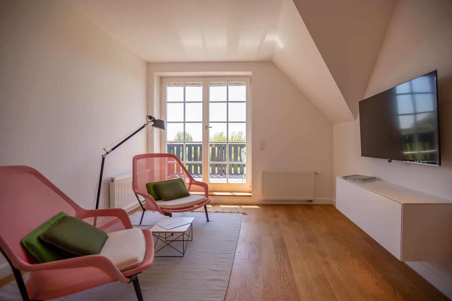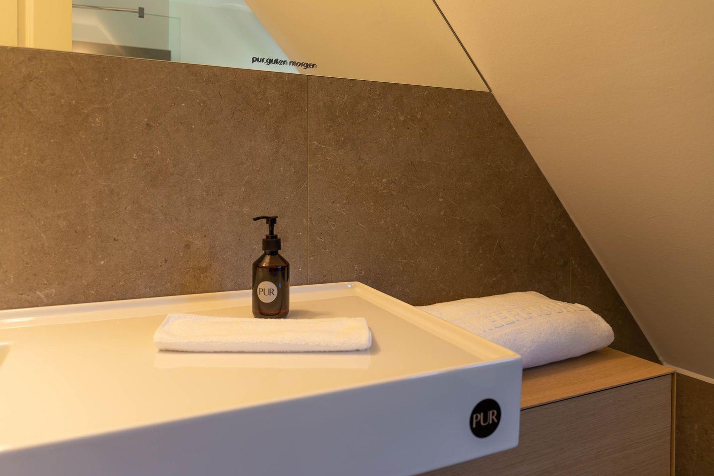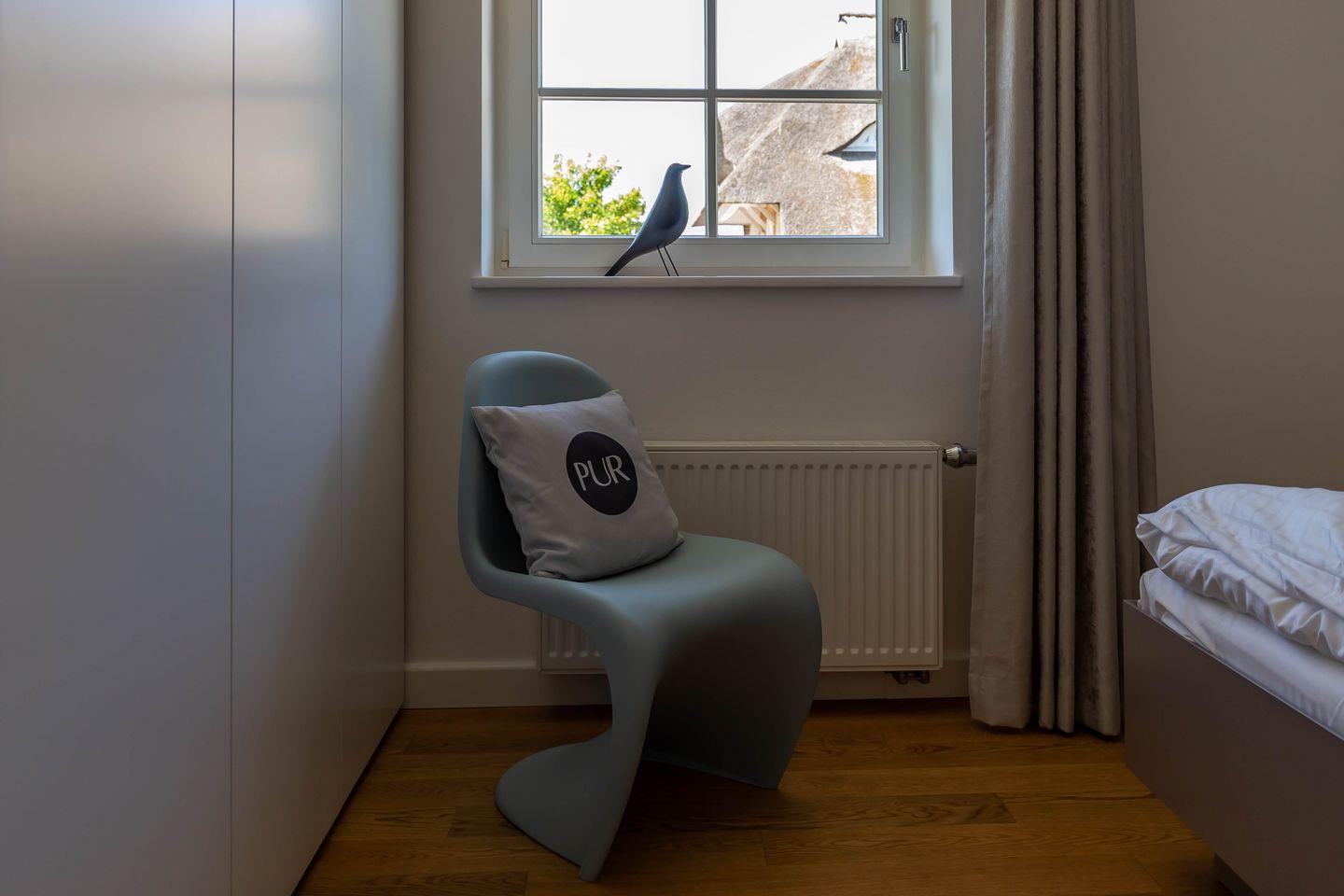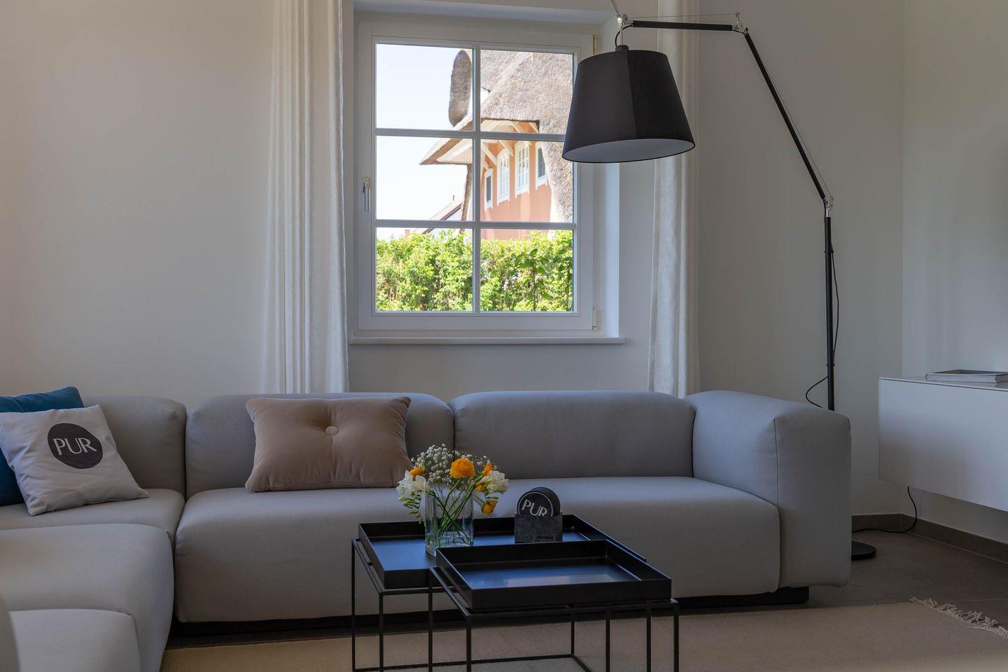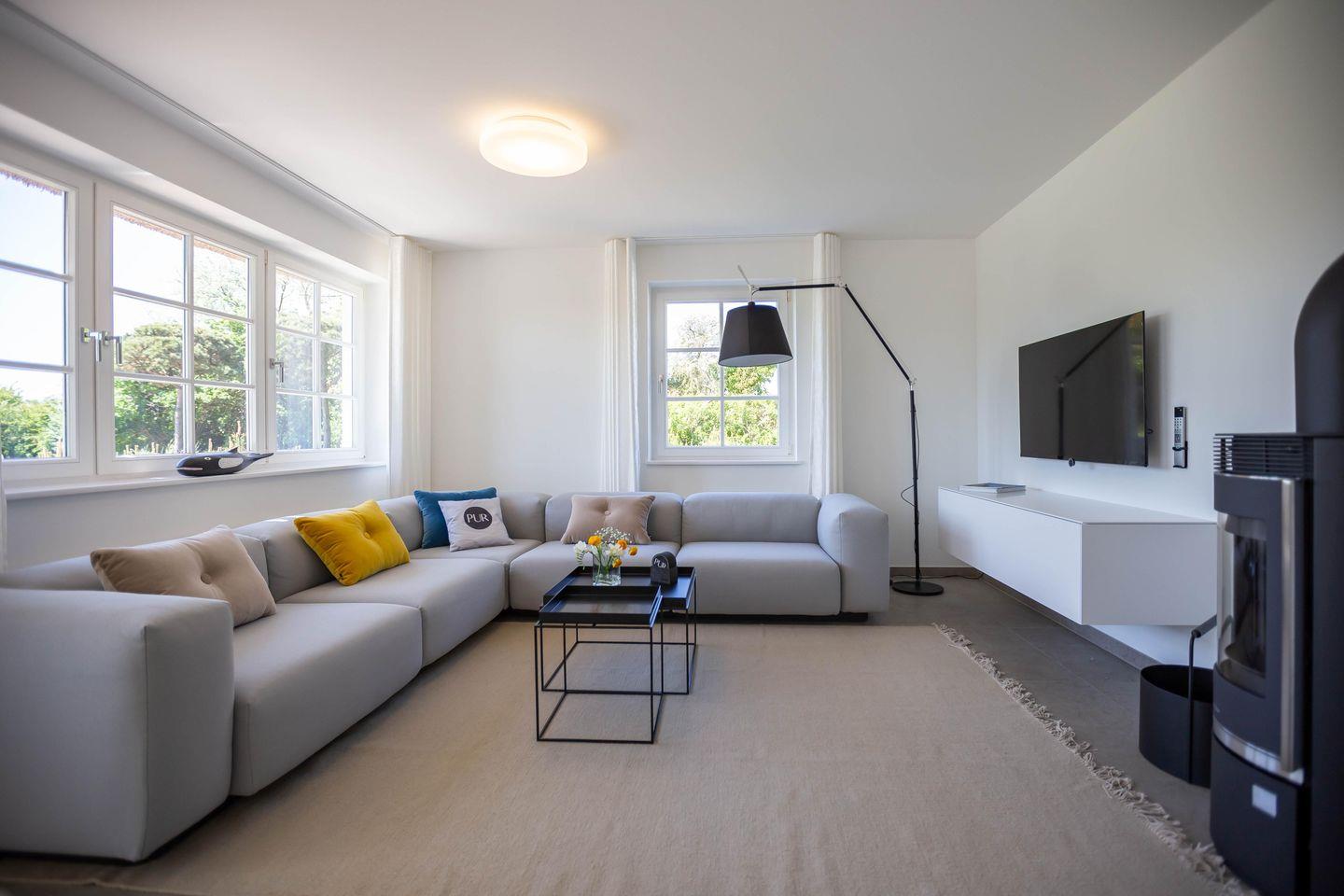 Die traumhafte Doppelhaushälfte unter Reet wurde in 2021 aufwendig saniert. Während die Außenansicht für das Fischland charakteristisch maritim gehalten ist - folgt PUR A7 im Innenbereich dem modernen PUR-Stilkonzept mit klarem, puristischem und zeitlosem Design. Der offen gestaltete Wohnraum kombiniert Küche, Esstisch und Big-Sofa zu einem modernen Treffpunkt für Familie und Freunde. Ausgesuchte Möbelstücke und farbliche Akzente schaffen auch in diesem PUR-Ferienhaus wieder einen gelungenen Mix aus Stil und Wohlgefühl. Hygge wird es trotz zurückhaltender Einrichtung auch in den vier Schlafzimmern des Hauses. Die komfortablen Betten bieten einen optimalen Schlaf. Gemeinsam mit der hochwertigen Einrichtung und teilweise wunderschönem Boddenblick wurden hier im wahrsten Sinne traumhafte Räume der Ruhe geschaffen. Abgerundet wird der Wohnkomfort durch zwei edle Badezimmer mit Rainshower-Dusche und Designer-Badelementen. Es ist eben das PUR-Gefühl, dass du in jeden Raum dieses besonderen Ferienhauses spürst und dass dir einen ästhetischen und anspruchsvollen Urlaub garantiert.