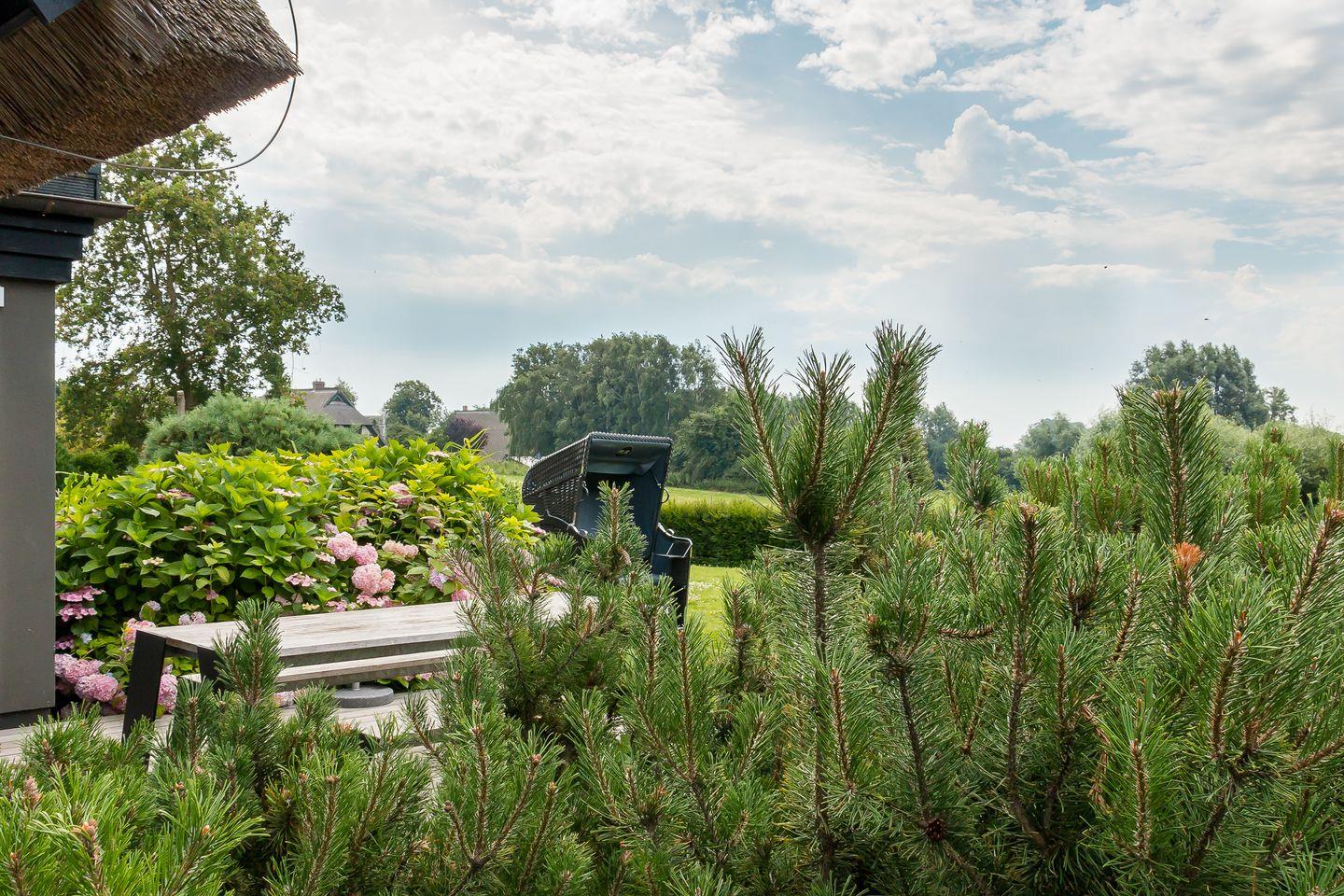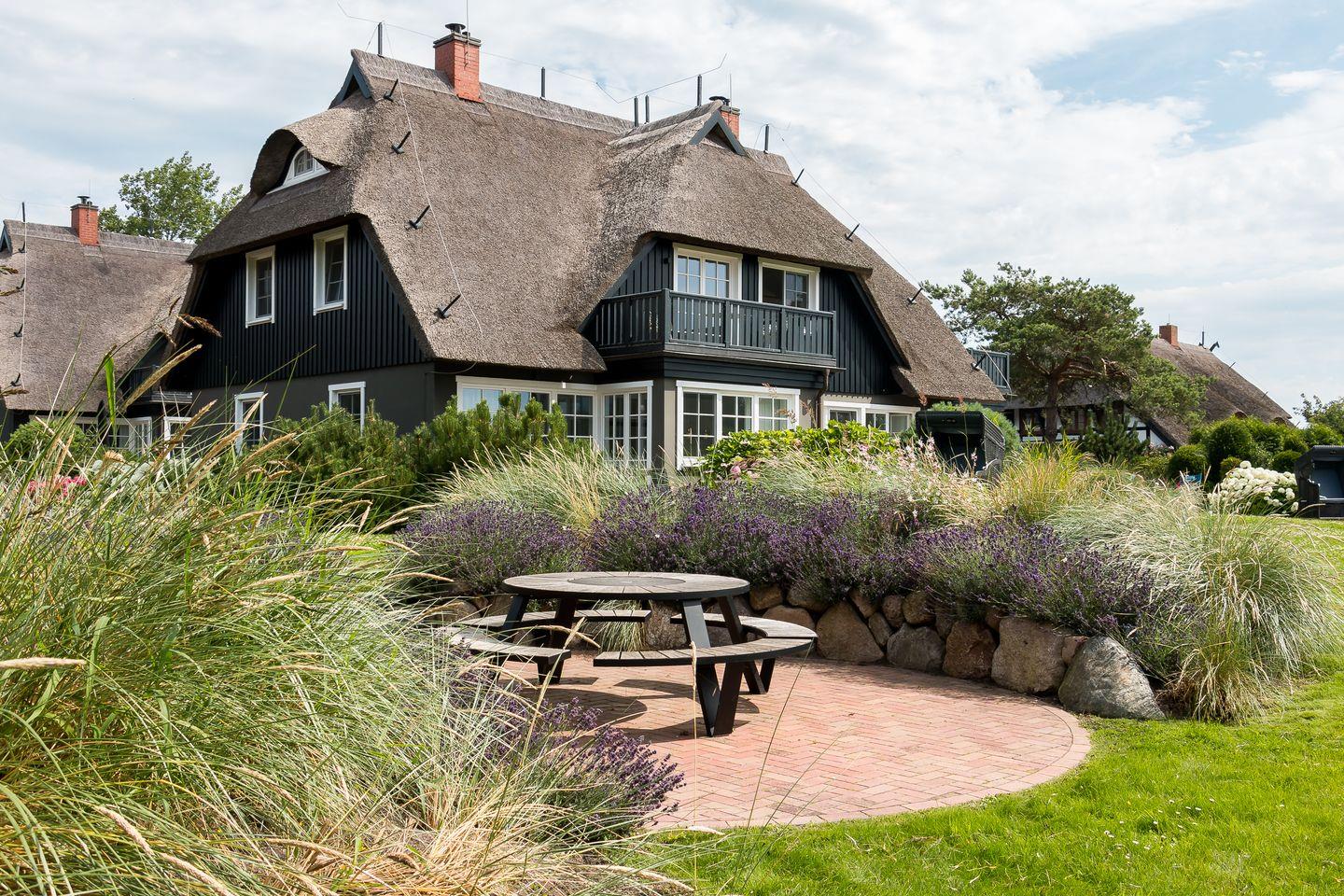 Auf der großzügigen Terrasse im Außenbereich genießt du einen unverbauten Blick über weite Wiesen bis zum Bodden. Dabei sorgt die aufwendig gestaltete Gartenarchitektur für ausreichend Privatsphäre, so dass du dich auch unter freiem Himmel entspannen kannst. Dir stehen zudem zwei PKW-Stellplätze und ein gemeinschaftlich genutzter Grillplatz im hinteren Bereich des weitläufigen Gartens zur Verfügung.