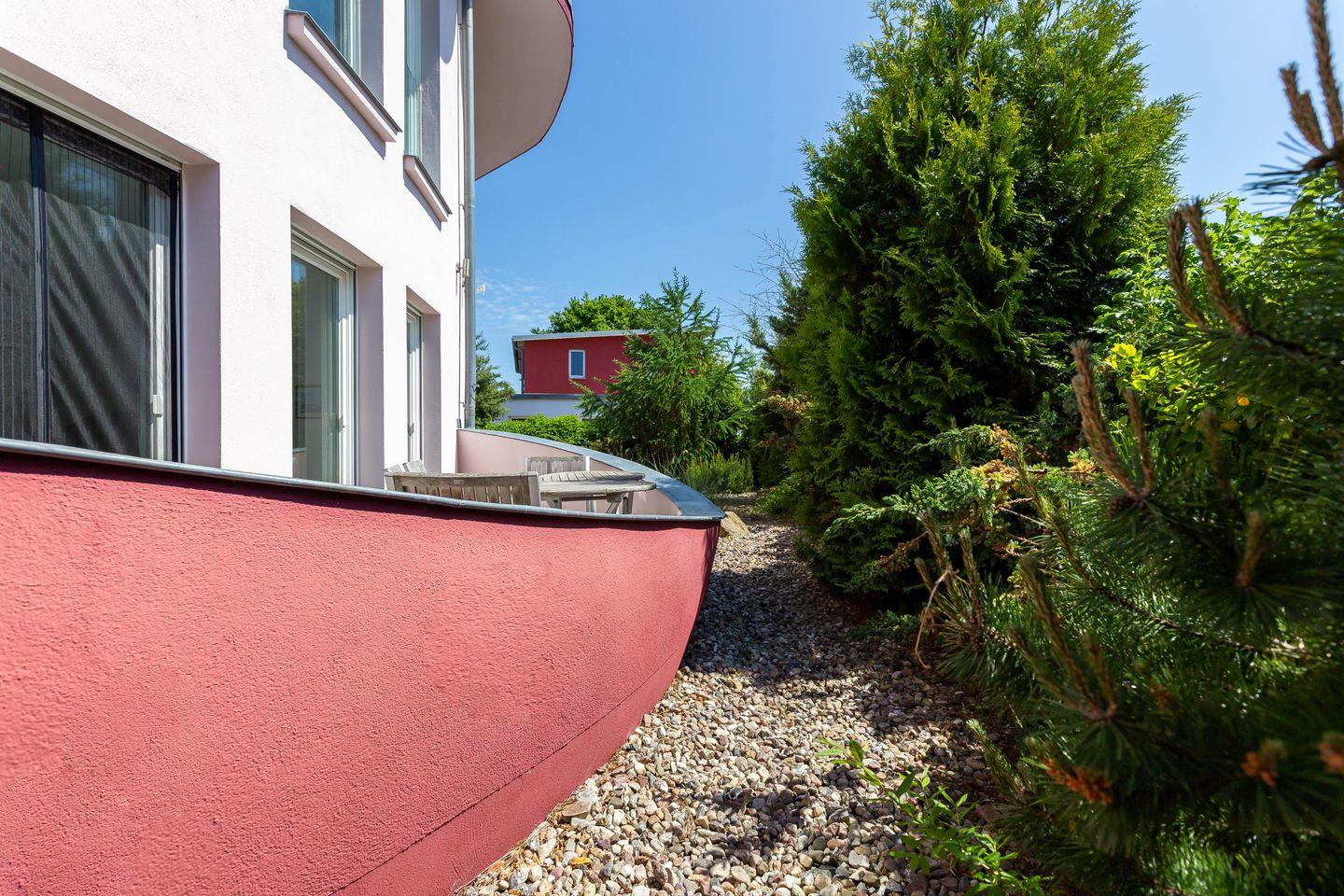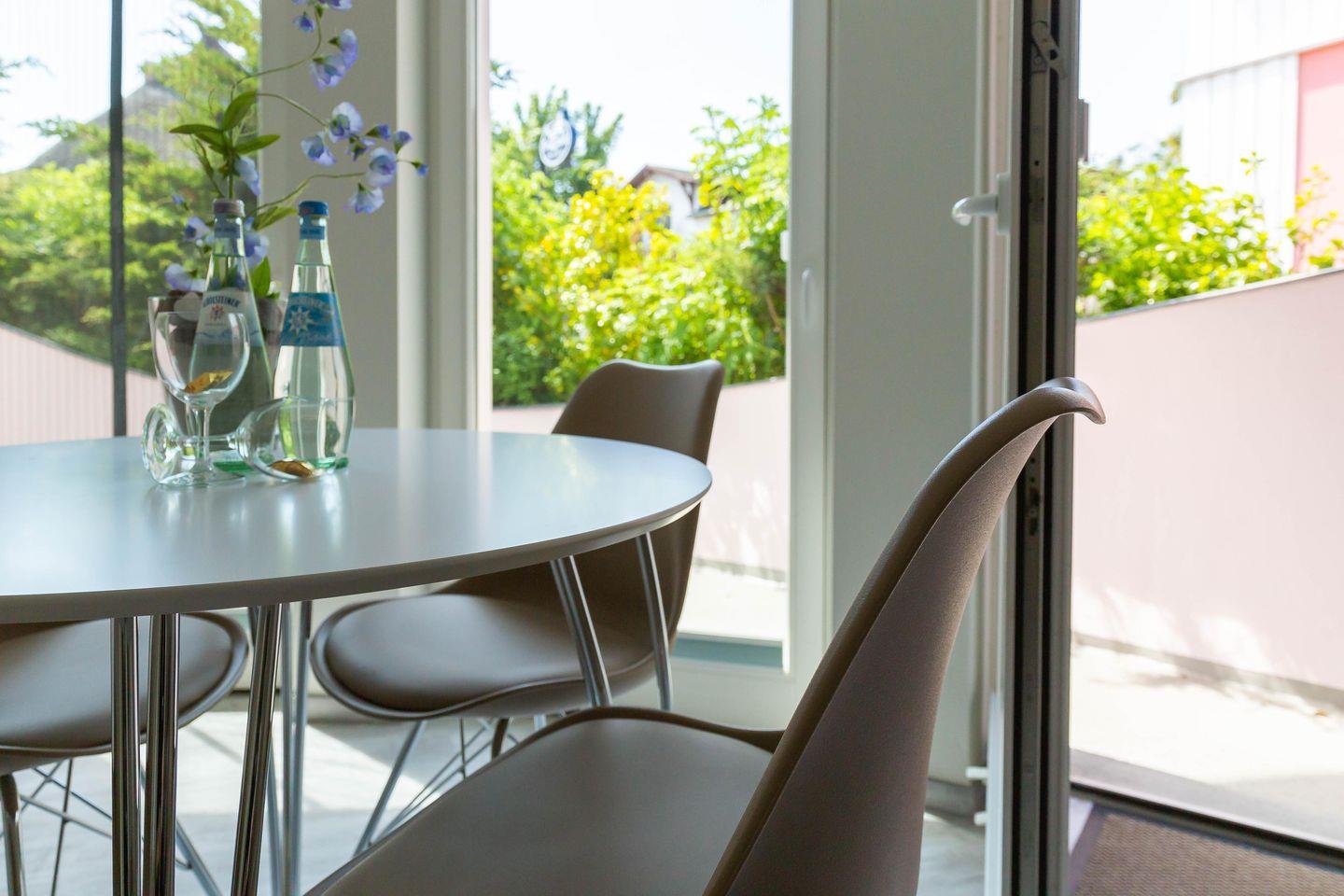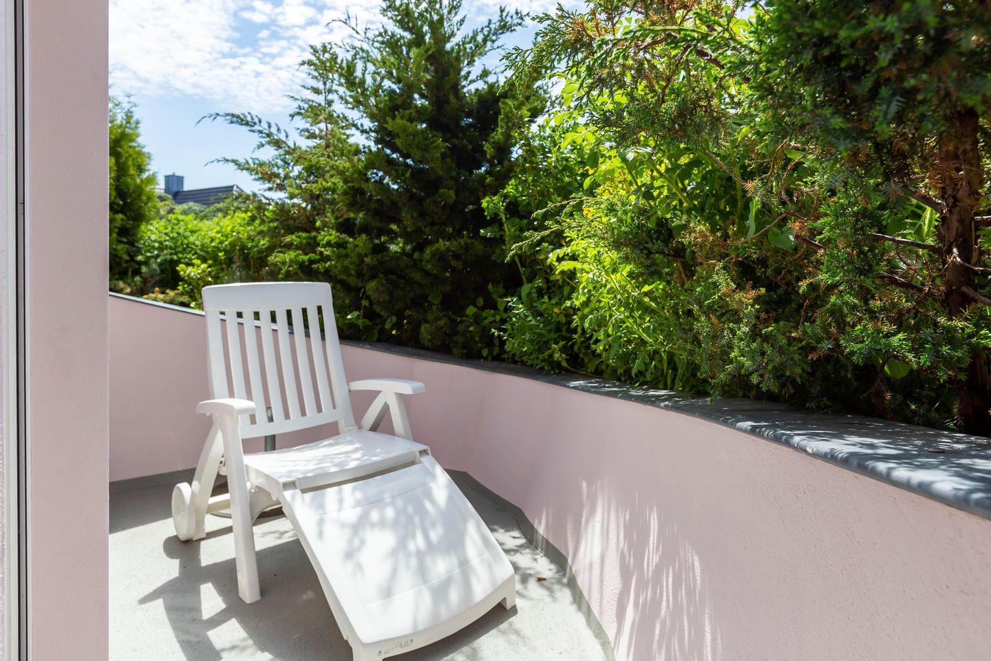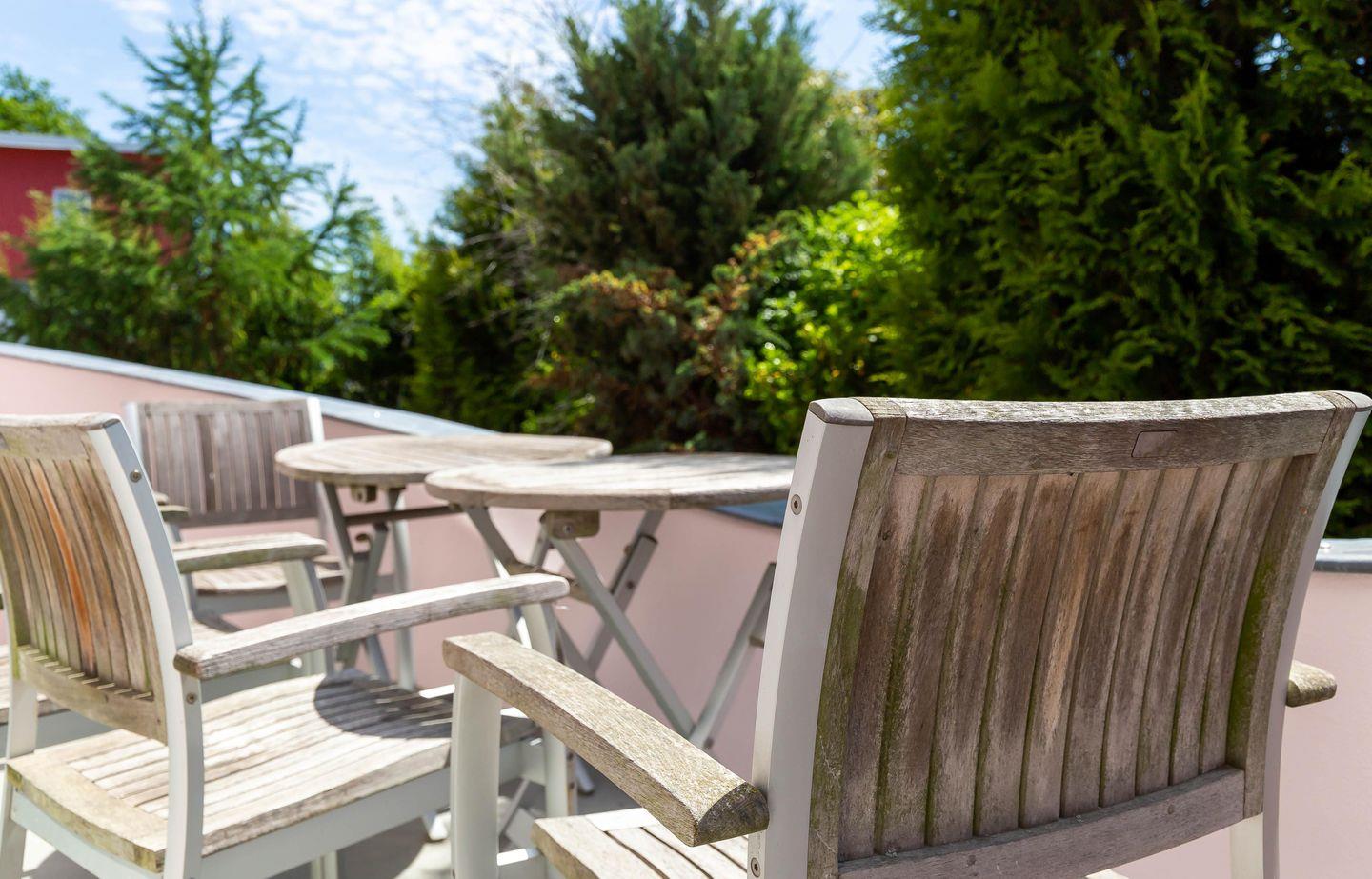 Im Außenbereich steht dir eine kleine sonnige Terrasse mit Tisch und Stühlen zur Verfügung, die von beiden Räumen aus betreten werden kann. Dank der heimischen Pflanzen, die die Terrasse umgeben, kannst du hier ungestört sein, dein Essen unter freiem Himmel genießen oder den Urlaubstag bei einem lauschigen Sommerabend ausklingen lassen. Zur Ferienwohnung gehört außerdem ein PKW-Stellplatz.