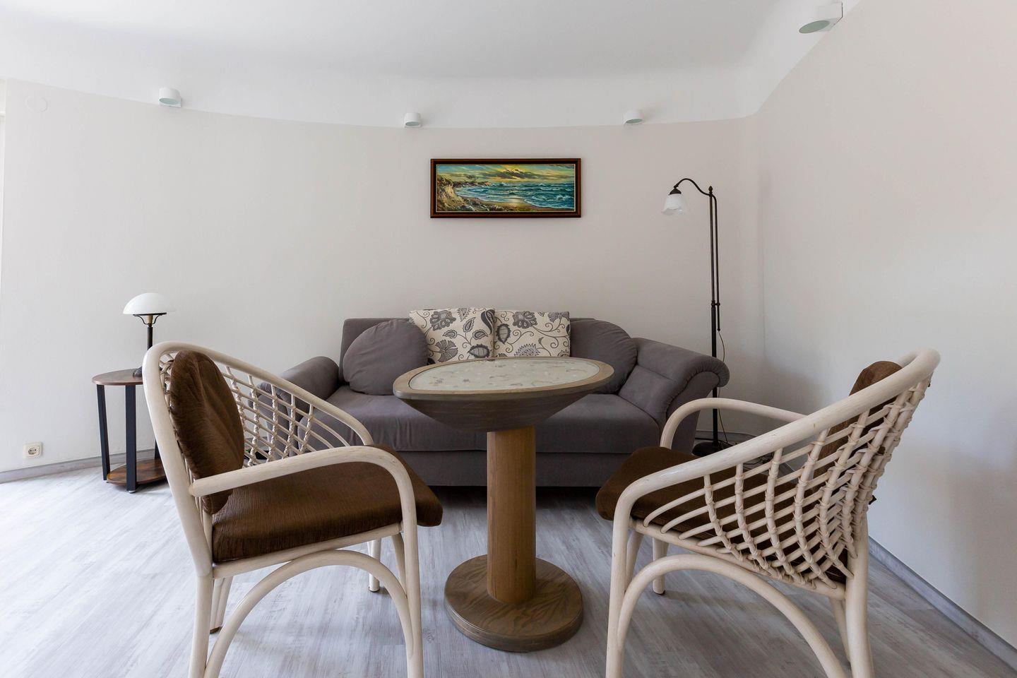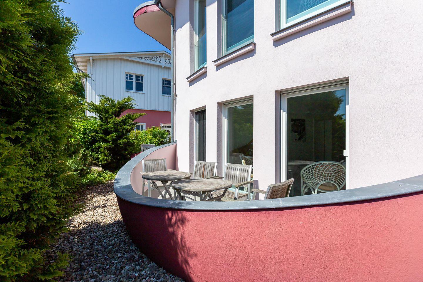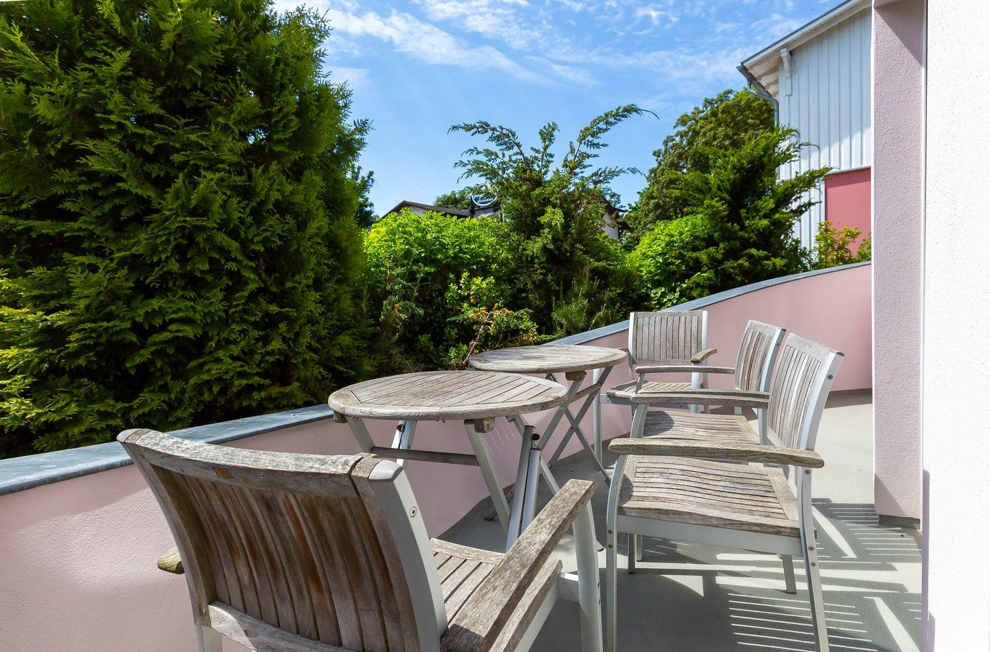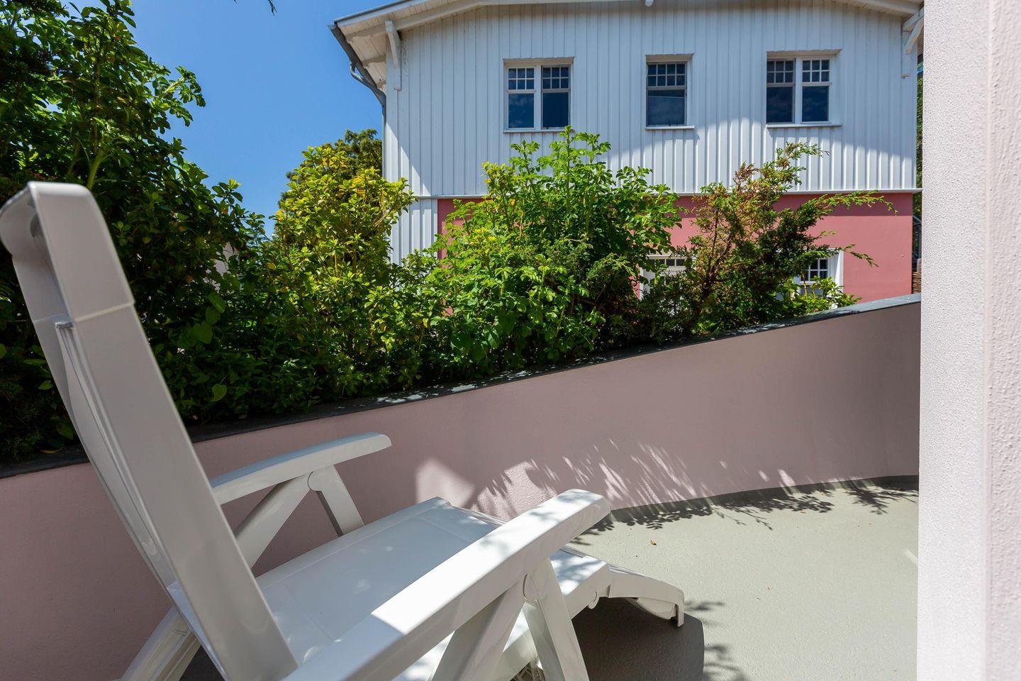 Im Außenbereich steht dir eine kleine sonnige Terrasse mit Tisch und Stühlen zur Verfügung, die von beiden Räumen aus betreten werden kann. Dank der heimischen Pflanzen, die die Terrasse umgeben, kannst du hier ungestört sein, dein Essen unter freiem Himmel genießen oder den Urlaubstag bei einem lauschigen Sommerabend ausklingen lassen. Zur Ferienwohnung gehört außerdem ein PKW-Stellplatz.