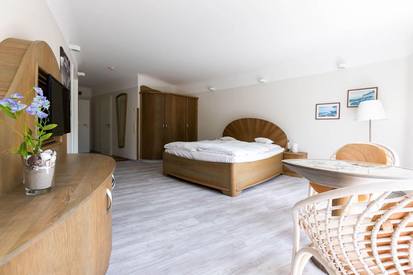 Die Unterkunft „Muschel 1“ befindet sich im Erdgeschoss des Hauses. Großzügige Räume, helle Farben und modernes Mobiliar machen diese Ferienwohnung zu einem besonderen Urlaubsdomizil. Vom Flur mit Garderobe kommst du direkt in das erste Schlafzimmer, dass mit einem großen Doppelbett, Kleiderschrank, Sitzgelegenheit, TV und bodentiefen Fenstern ausgestattet ist. Auch ein Badezimmer mit Dusche und WC kannst du vom Flur aus betreten. Durch eine Tür gelangst du in den großzügigen Wohn- und Schlafbereich. Die vollausgestattete Küchenzeile ist offen integriert und lädt mit Herd, Backofen, Geschirrspüler und Essbereich zum Kochen und Klönen ein. Das gemütliche Sofa kann ausgezogen werden und bietet mit 160 cm Liegefläche einen komfortablen Schlafplatz für bis zu zwei Personen. Abgerundet wird die neu modernisierte Ferienwohnung durch ein zweites Bad mit Dusche und WC.