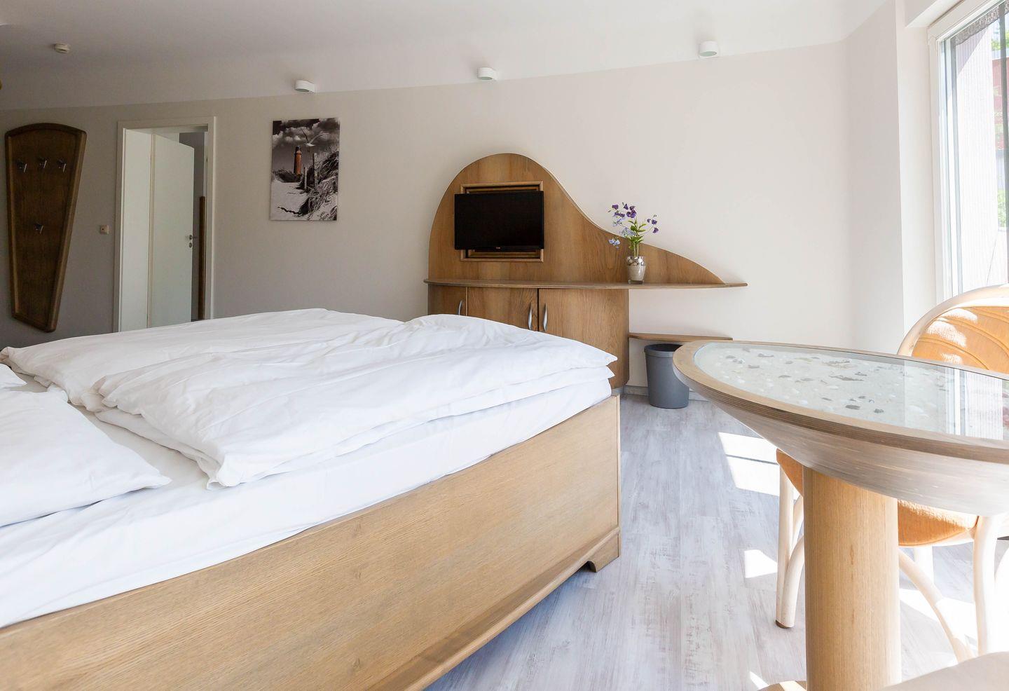 Die Unterkunft „Muschel 2“ befindet sich im Erdgeschoss des Hauses. Großzügige Räume, helle Farben und modernes Mobiliar machen diese Ferienwohnung zu einem besonderen Urlaubsdomizil. Vom Flur mit Garderobe kommst du direkt in das erste Schlafzimmer, dass mit einem großen Doppelbett, Kleiderschrank, Sitzgelegenheit, TV und bodentiefen Fenstern ausgestattet ist. Auch ein Badezimmer mit Dusche und WC kannst du vom Flur aus betreten. Durch eine Tür gelangst du in den großzügigen Wohn- und Schlafbereich. Die vollausgestattete Küchenzeile ist offen integriert und lädt mit Herd, Backofen, Geschirrspüler und Essbereich zum Kochen und Klönen ein. Das gemütliche Sofa kann ausgezogen werden und bietet mit 160 cm Liegefläche einen komfortablen Schlafplatz für bis zu zwei Personen. Abgerundet wird die neu modernisierte Ferienwohnung durch ein zweites Bad mit Dusche und WC.