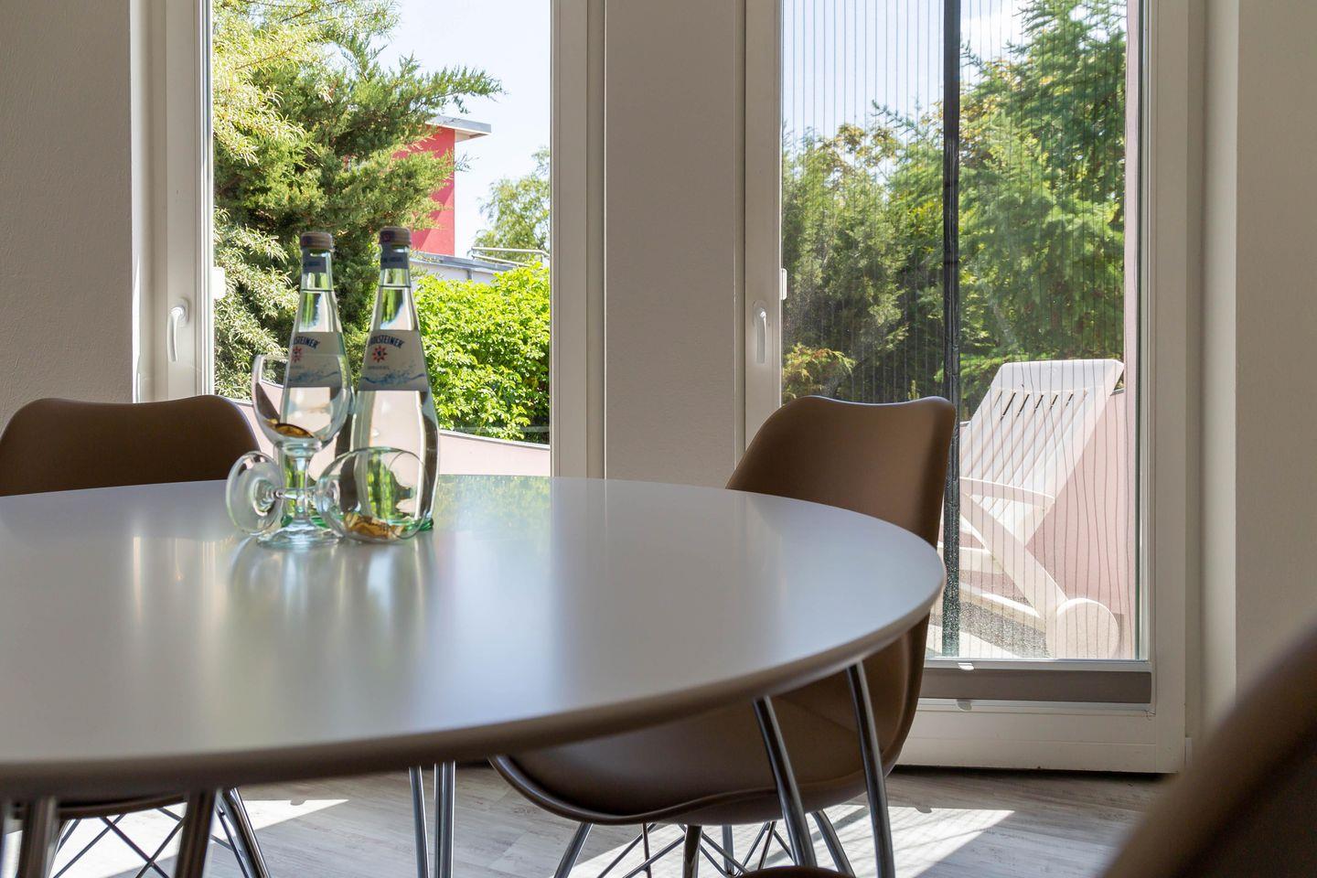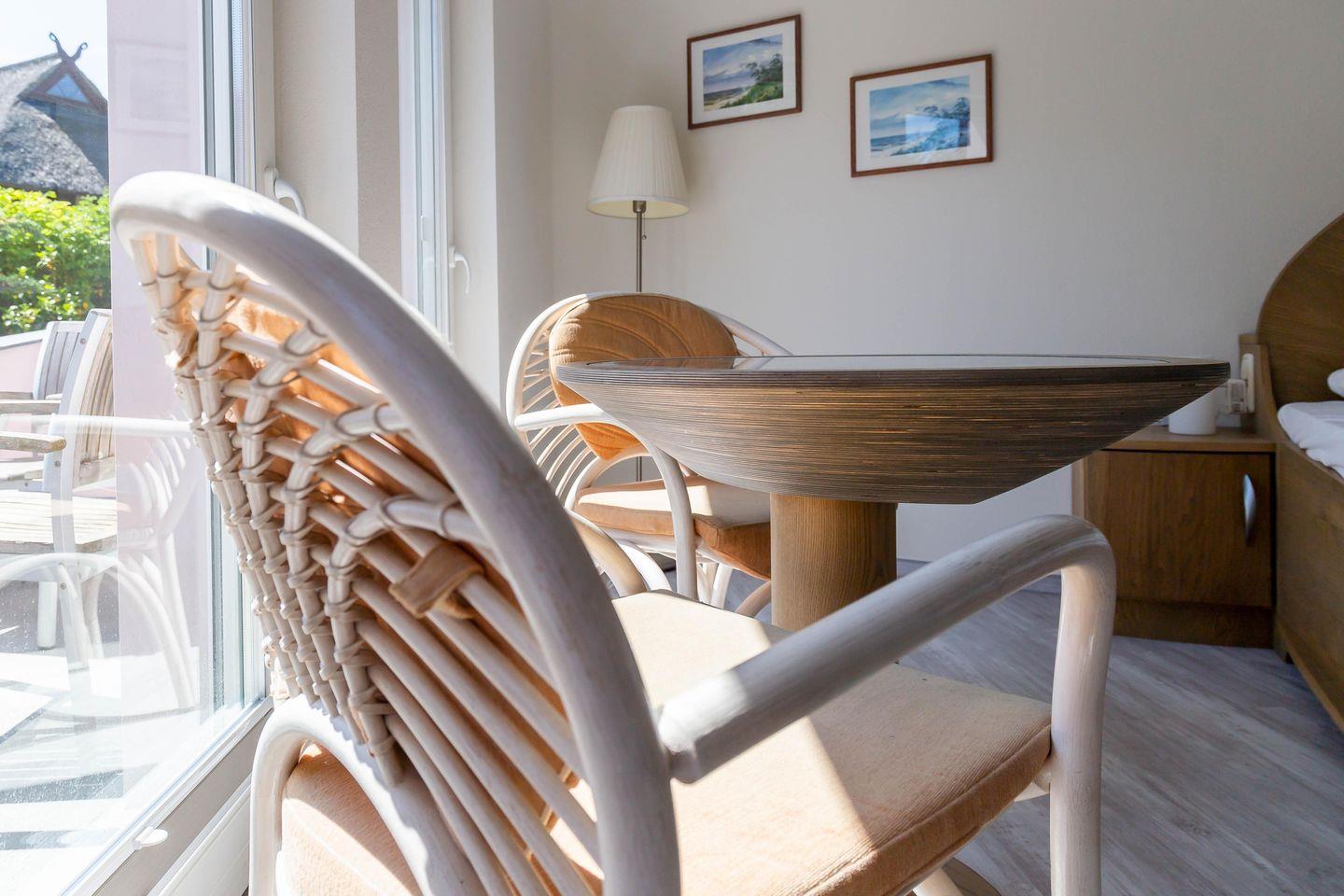 Im Außenbereich steht dir eine kleine sonnige Terrasse mit Tisch und Stühlen zur Verfügung, die von beiden Räumen aus betreten werden kann. Dank der heimischen Pflanzen, die die Terrasse umgeben, kannst du hier ungestört sein, dein Essen unter freiem Himmel genießen oder den Urlaubstag bei einem lauschigen Sommerabend ausklingen lassen. Zur Ferienwohnung gehört außerdem ein PKW-Stellplatz.