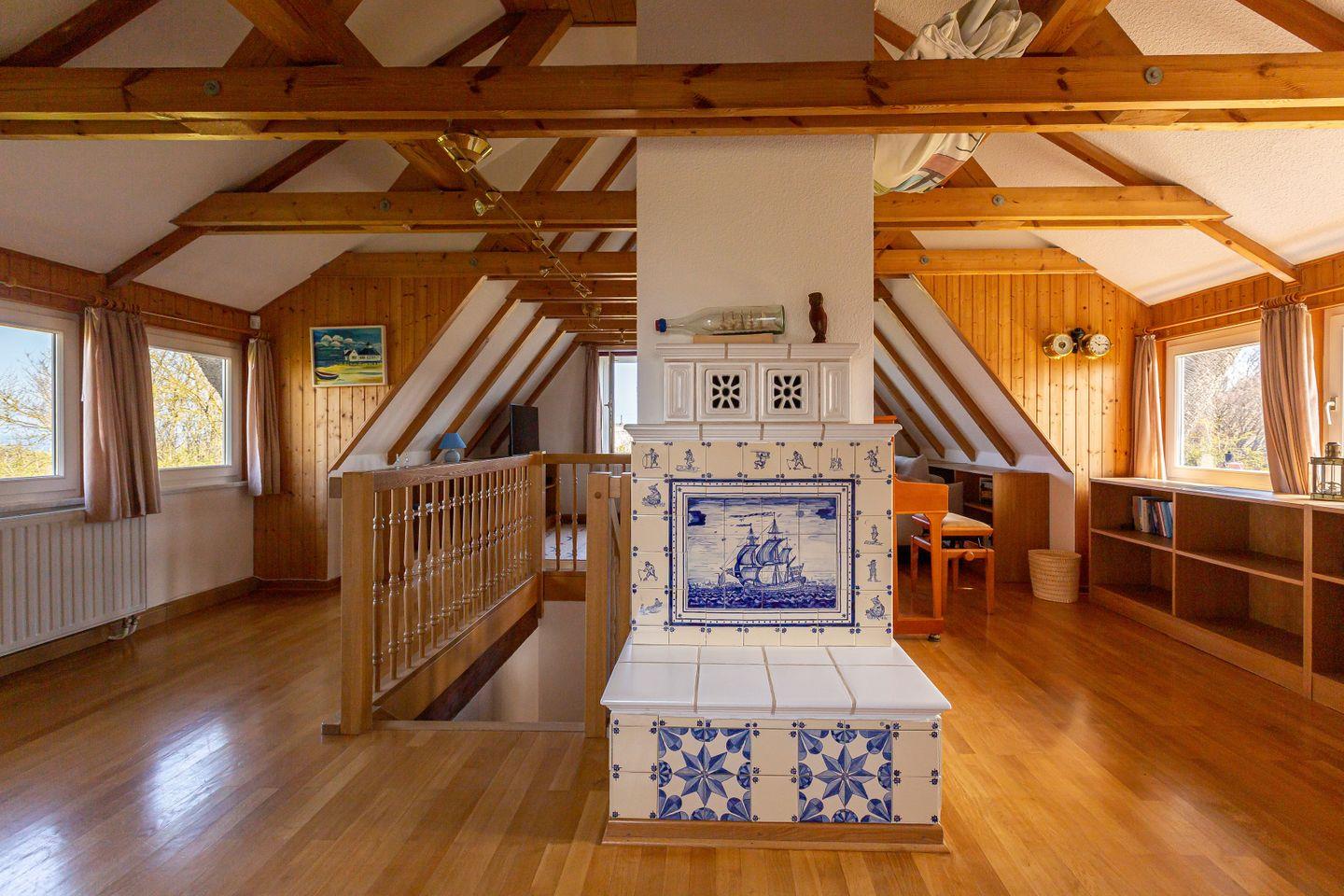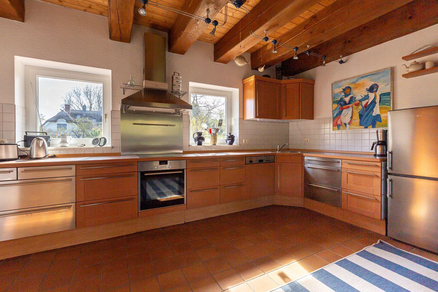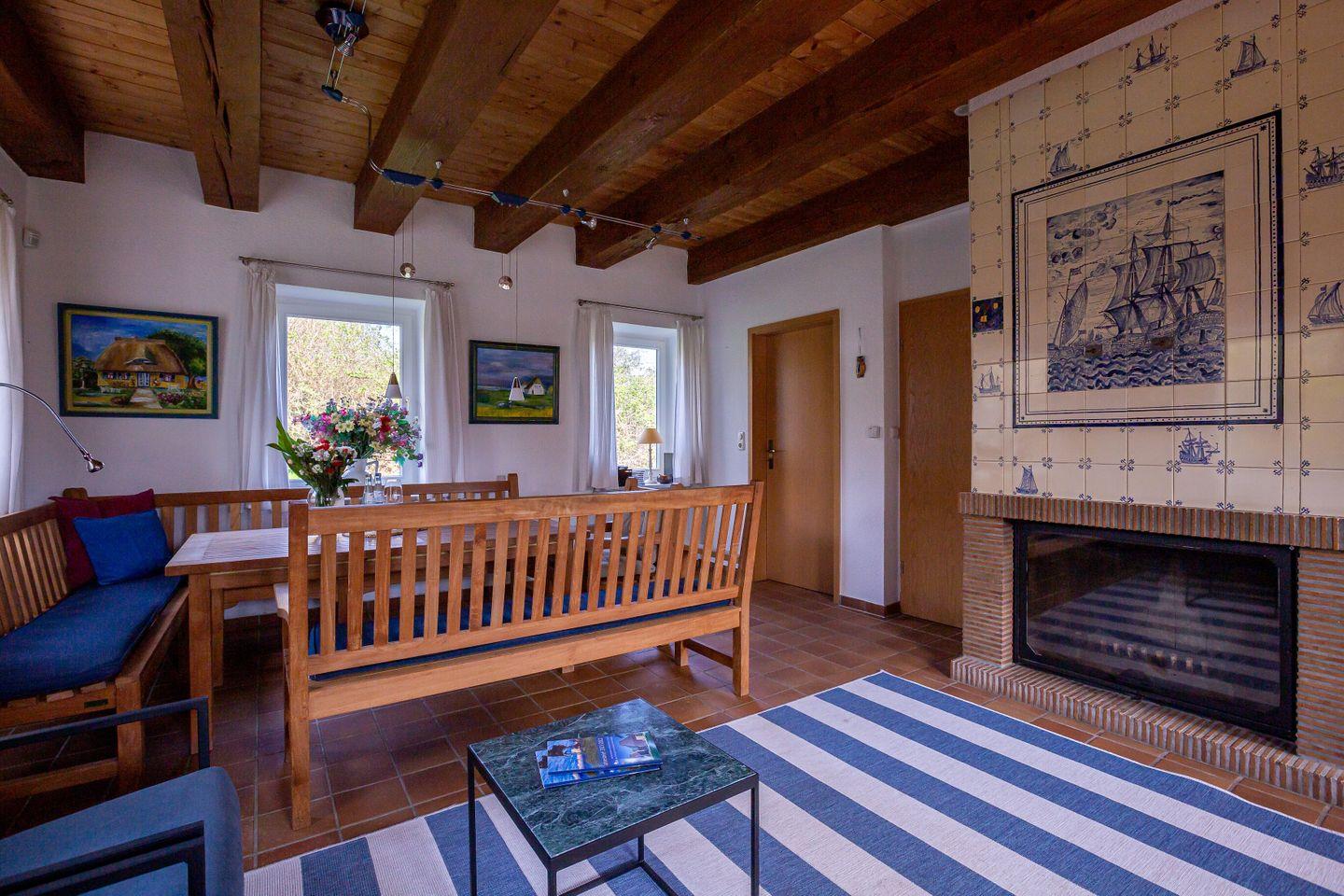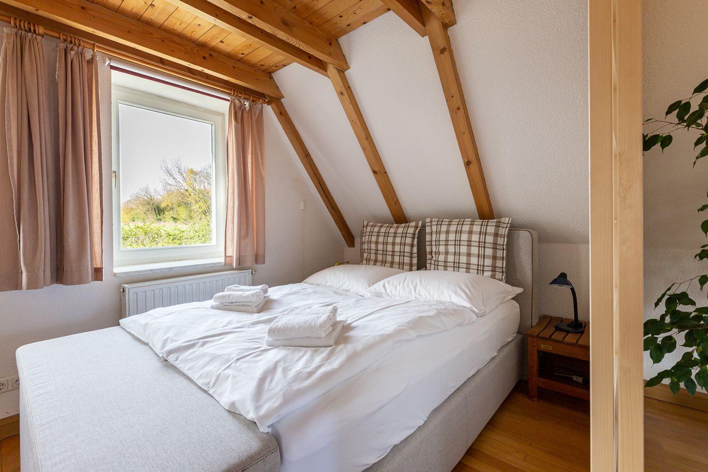 Durch die Darßer Tür und den kleinen Flur betritts du den großzügigen Küchenbereich. Es sind Besonderheiten wie die massiven Deckenbalken, der dekorative gekachelte Kamin und die sonnige Essecke, die den Raum so gemütlich machen. Dank der gut ausgestatteten Küche lässt es sich hier nach Herzenslust Kochen und Klönen. Von der Küche betritt man das Hauptschlafzimmer mit Doppelbett und großem Kleiderschrank. Der Blick aus dem Fenster zeigt die wundervolle Natur, hinter der sich die Ostsee versteckt. Hier kannst du garantiert gut schlafen, nicht zuletzt, weil das Rauschen des Meeres für die richtige Entspannung und innere Ruhe sorgt. Abgerundet wird das Erdgeschoss durch das Badezimmer, dass mit einer Dusche ausgestattet ist. Über eine Holztreppe gelangst du in den Wohnbereich des Hauses, der mit seinen Fachwerkbalken und dem maritimen Interieur viel Wärme und Gemütlichkeit ausstrahlt. Vom Sofa aus genießt du einen traumhaften Blick aufs Meer und die Reetdächer der alten Fischlandkaten. Ein Klavier zum Spielen steht ebenfalls bereit und bietet die passende Untermalung für spektakuläre Sonnenuntergänge, die du vom Wohnzimmer aus genießen kannst. Vom Wohnbereich durch eine japanische Shoji-Tür getrennt, befindet sich das zweite Schlafzimmer, ebenfalls mit einem Doppelbett und herrlichem Blick auf die weiten Wiesen.